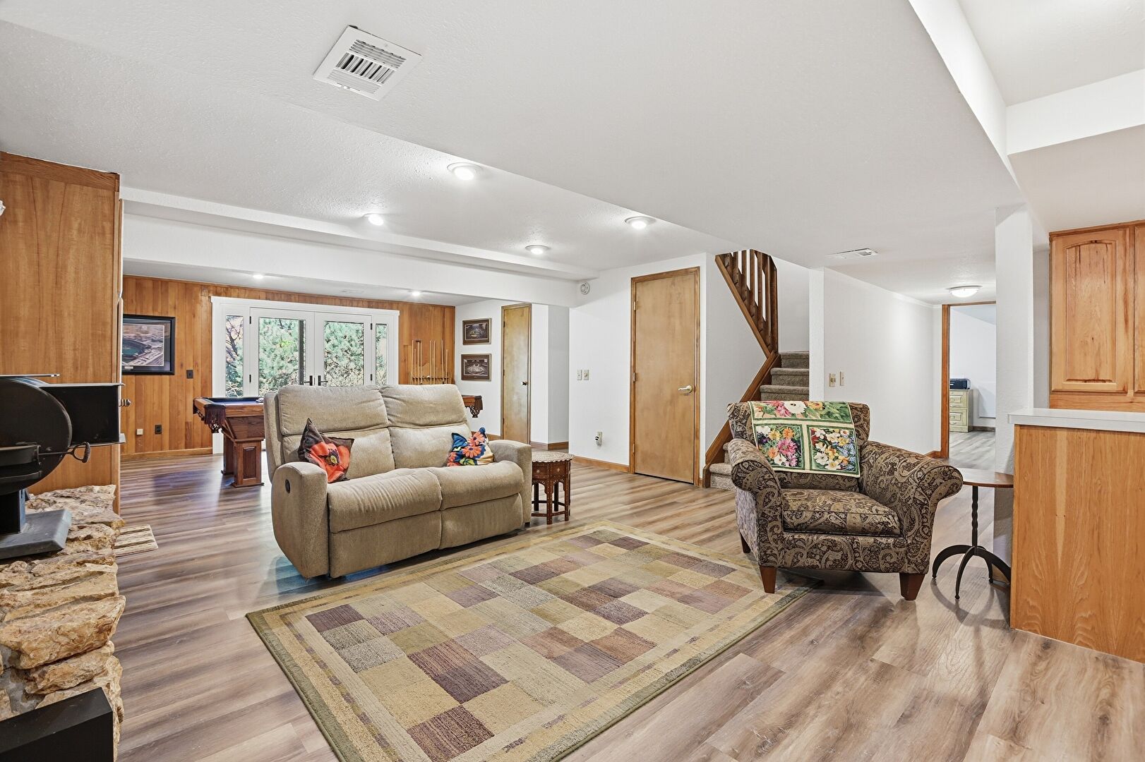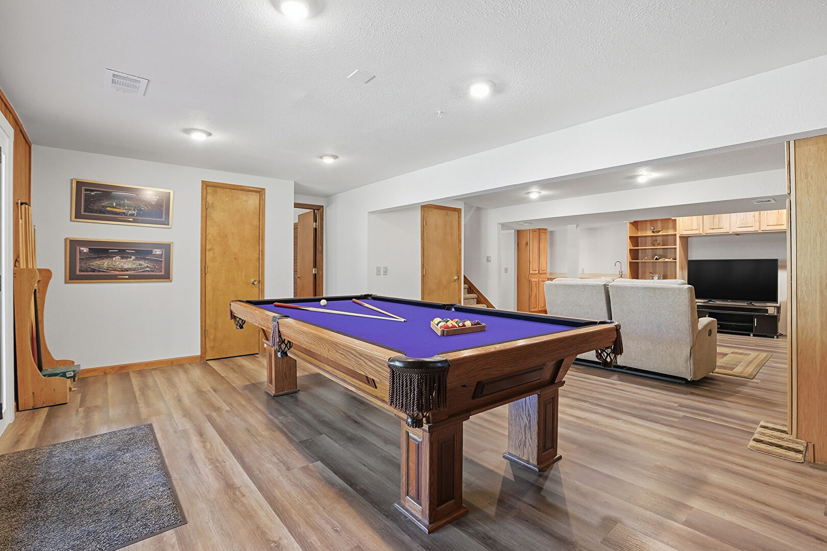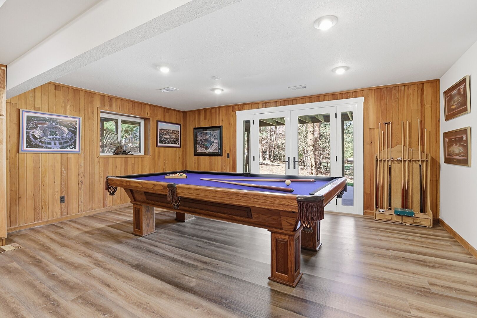Baseboards Wall, Basement, Billiards, Drywall, French Doors, Natural Light, Recessed Lighting, Vent, Wood Finish Floor, Textured Ceiling, Wood Wall