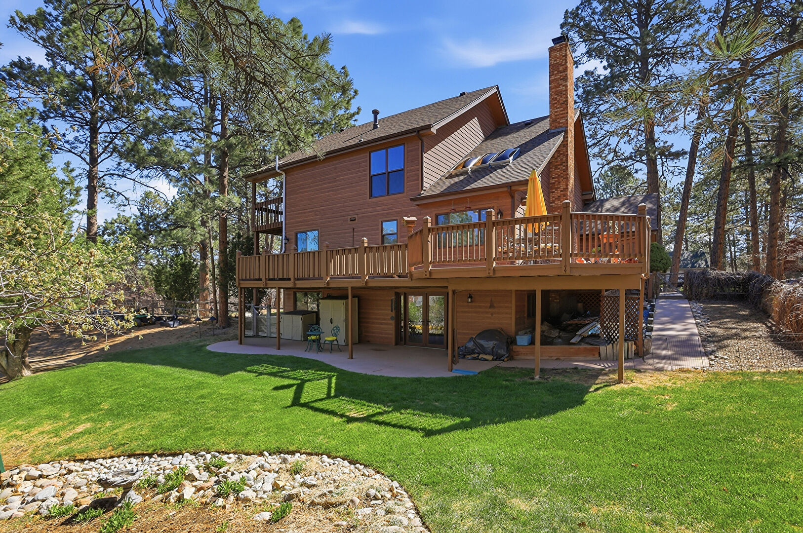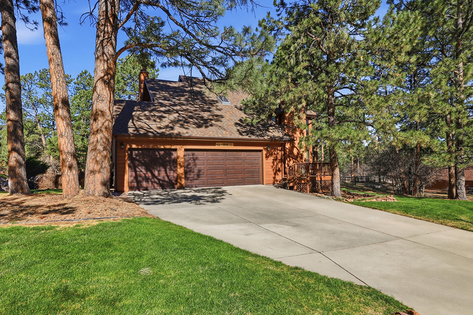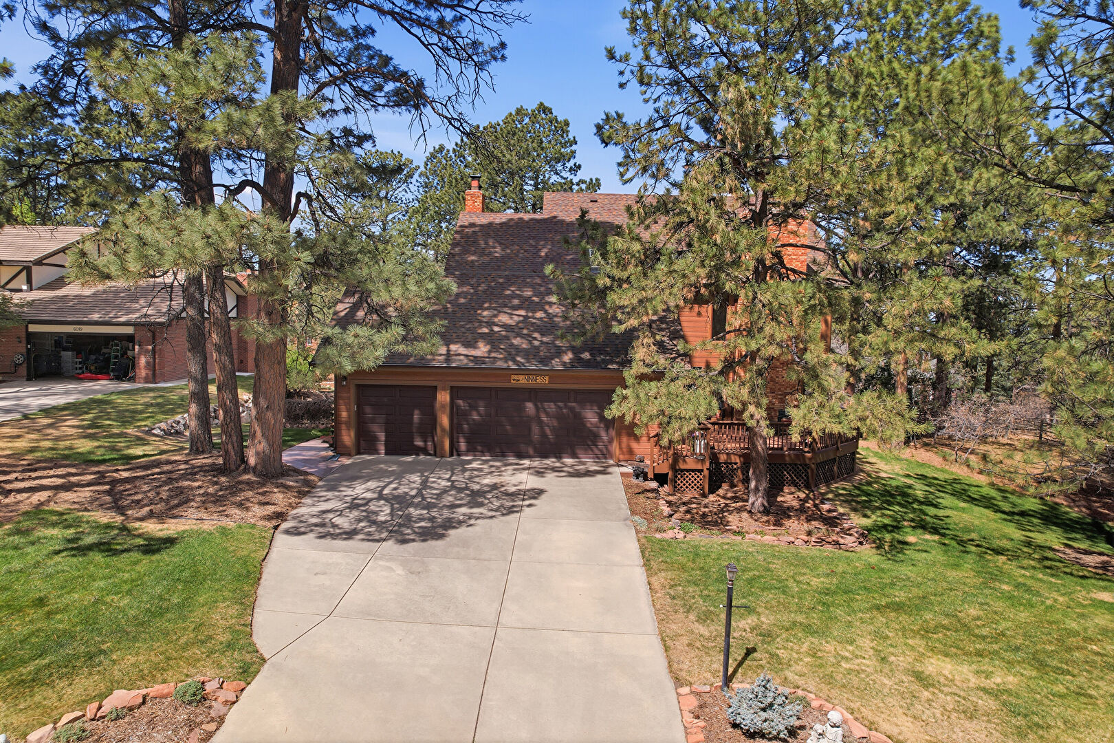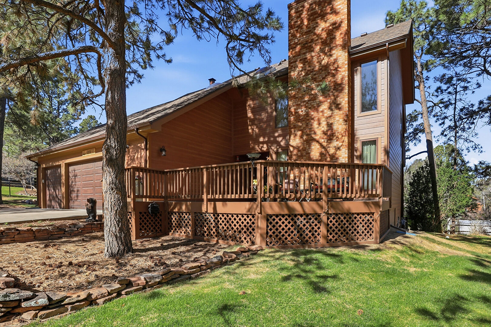 Chimney, Deck, Downspout, Driveway, Gutters, Horizontal Siding, Lawn, Shingle Roof, Woods View, Chimney, Deck, Driveway, Lawn