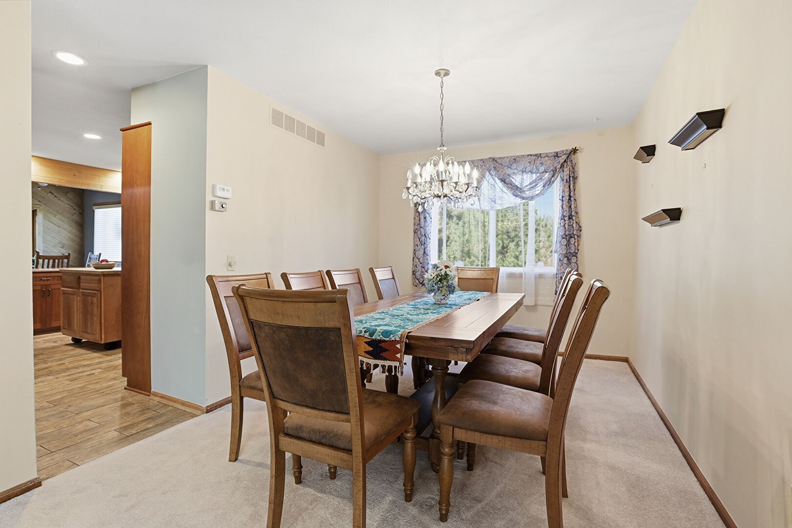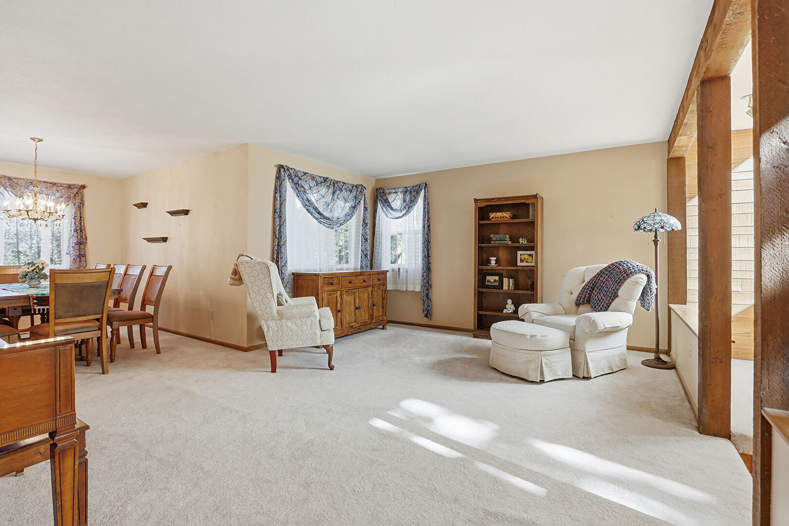Baseboards Wall, Carpet, Ceiling Fan, Drywall, High Ceiling, Natural Light, Recessed Lighting, Vaulted Ceiling, Vent, Wood Wall, Notable Chandelier, Wood Finish Floor