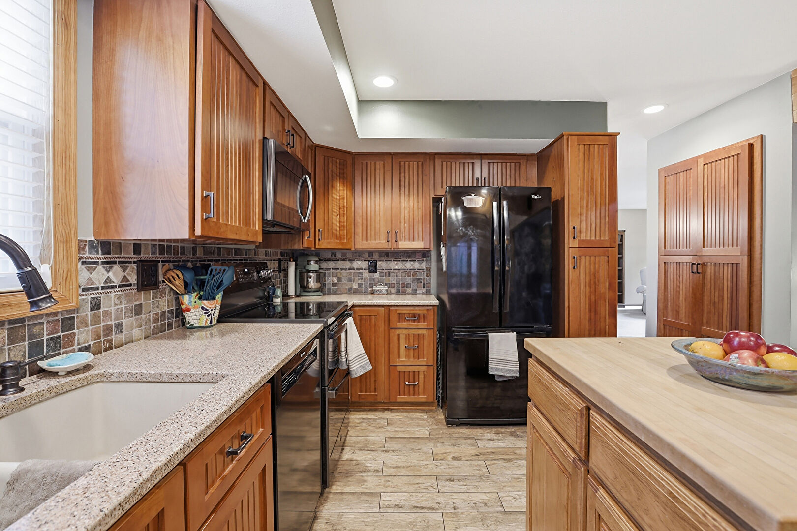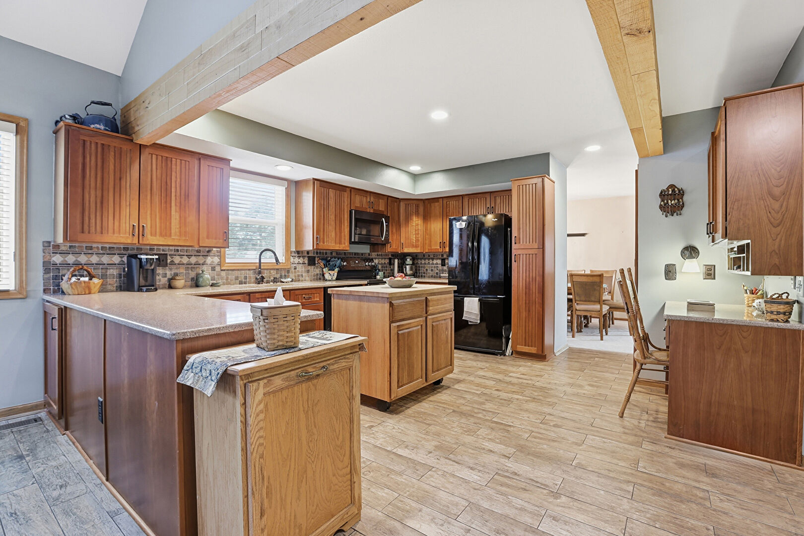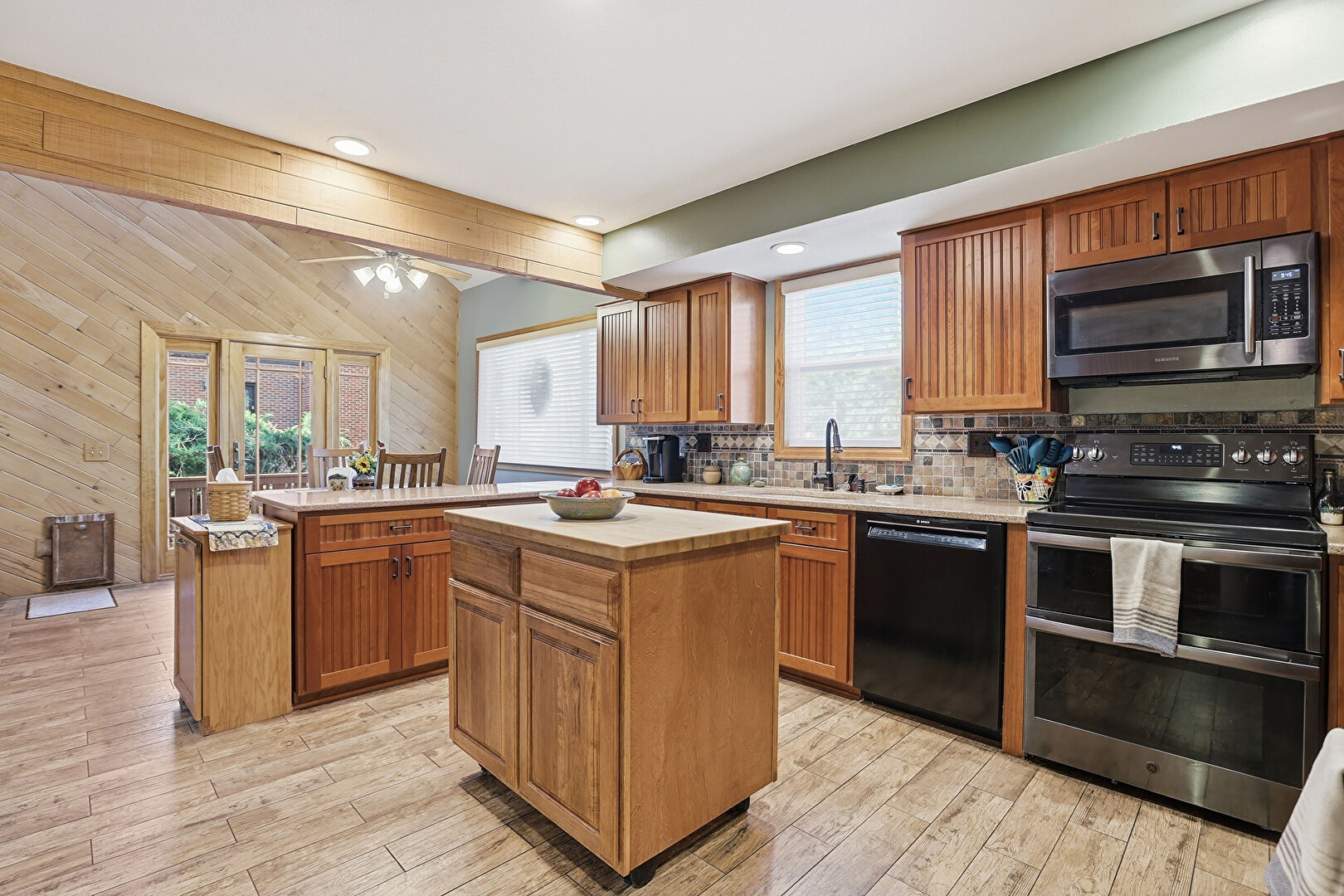 Baseboards Wall, Beamed Ceiling, Butcher Block Countertops, Ceiling Fan, Drywall, G Shaped Kitchen, Kitchen Bar, Kitchen Island, Kitchen Peninsula, Medium Brown Cabinets, Natural Light, Recessed Lighting, Shaker Cabinets, Stone Countertops, Tray Ceiling, U Shaped Kitchen, Vaulted Ceiling, Wood Finish Floor, Wood Wall, Baseboards Wall, Butcher Block Countertops, Recessed Lighting, Stone Countertops