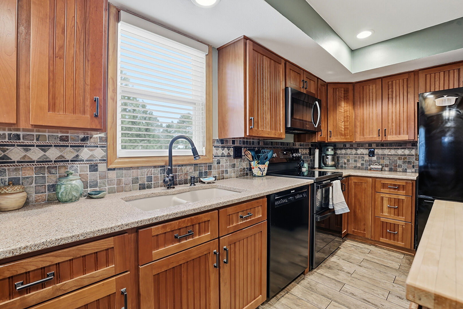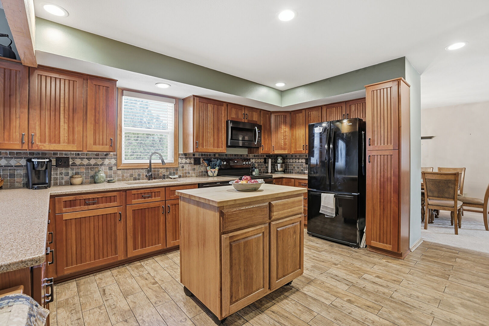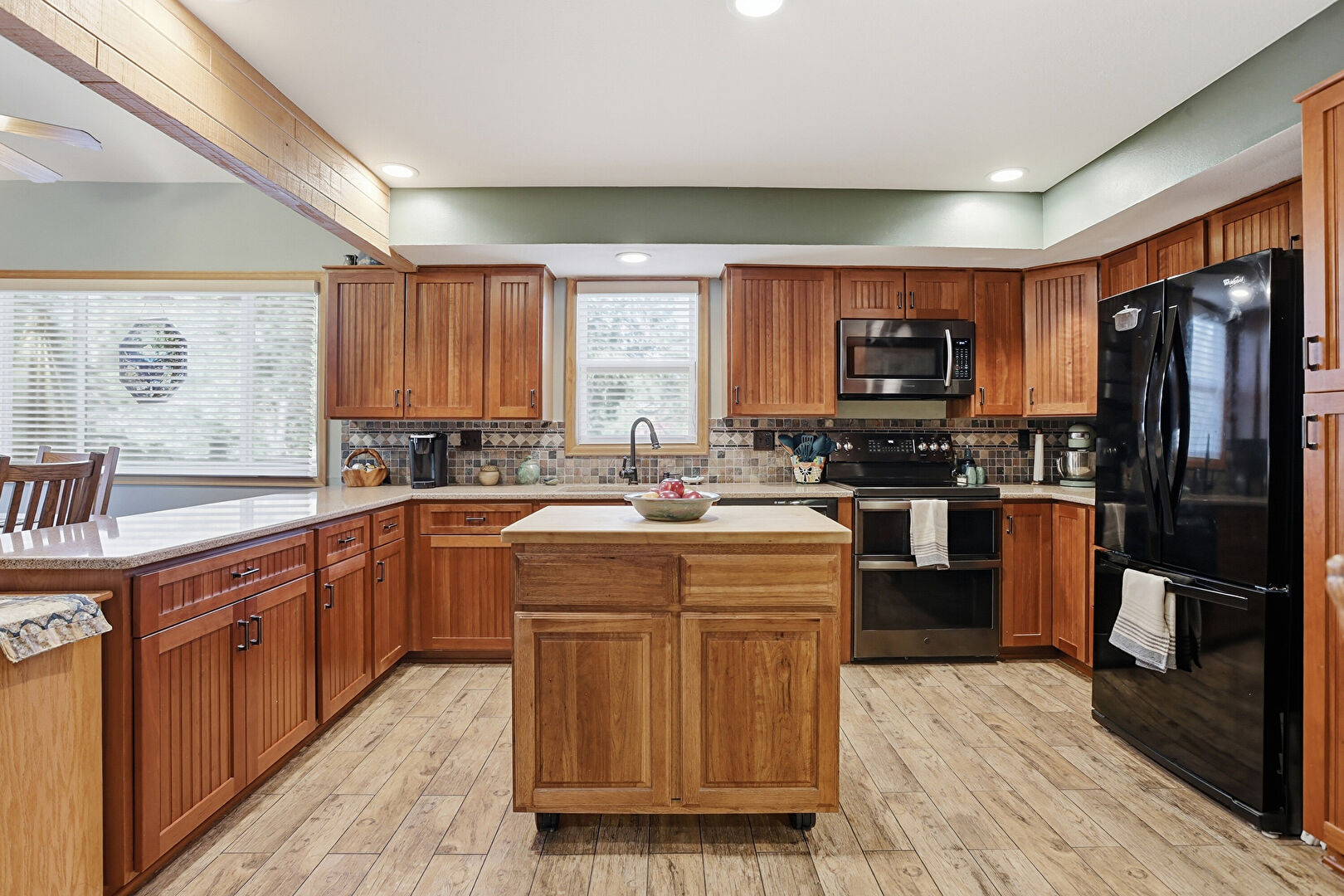Baseboards Wall, Beamed Ceiling, Butcher Block Countertops, Ceiling Fan, Drywall, G Shaped Kitchen, Kitchen Bar, Kitchen Island, Kitchen Peninsula, Medium Brown Cabinets, Natural Light, Recessed Lighting, Shaker Cabinets, Stone Countertops, Tray Ceiling, U Shaped Kitchen, Vaulted Ceiling, Wood Finish Floor, Wood Wall, Baseboards Wall, Butcher Block Countertops, Recessed Lighting, Stone Countertops