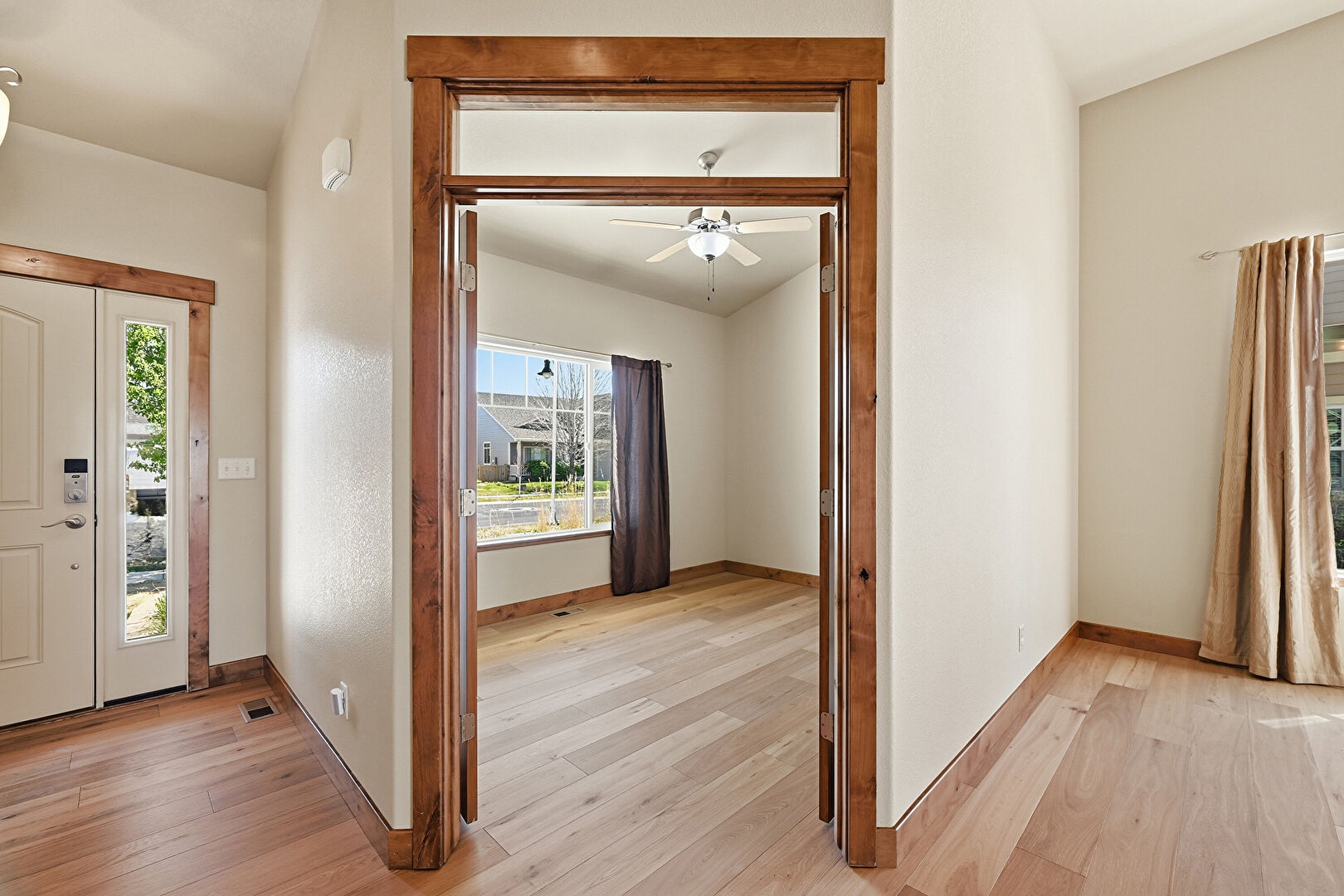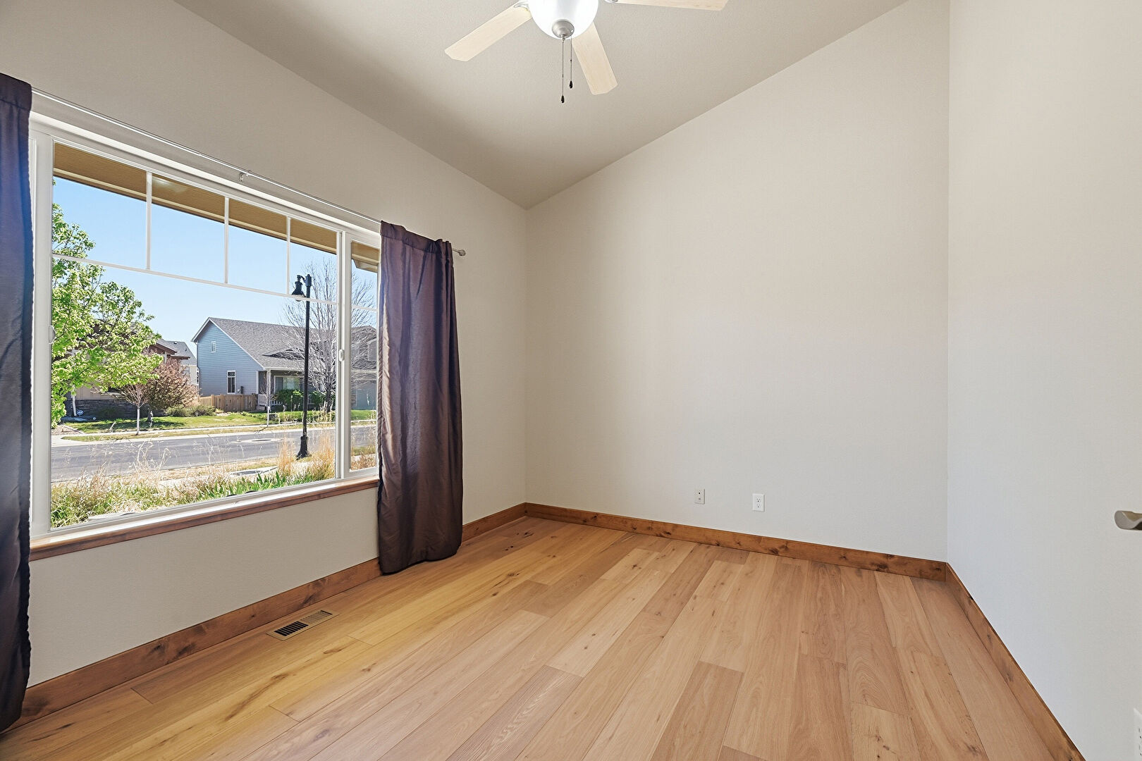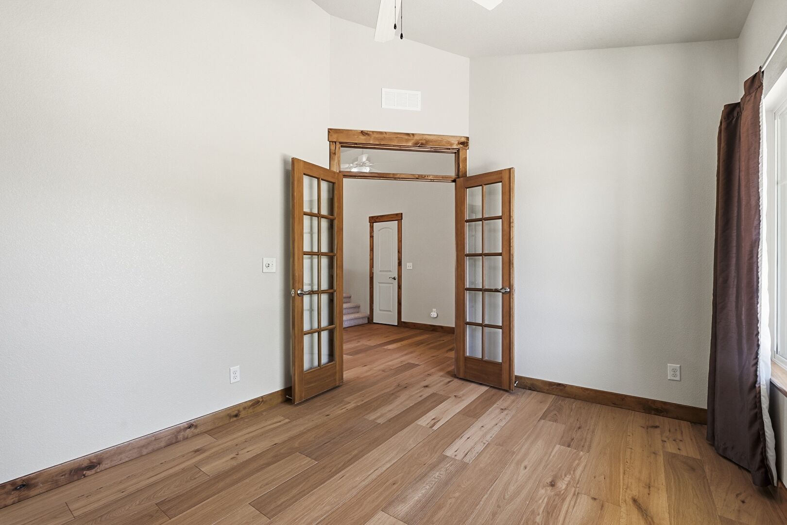 Baseboards Wall, Ceiling Fan, Drywall, French Doors, High Ceiling, Natural Light, Vaulted Ceiling, Vent, Wood Finish Floor, Ceiling Fan, Natural Light, Vent