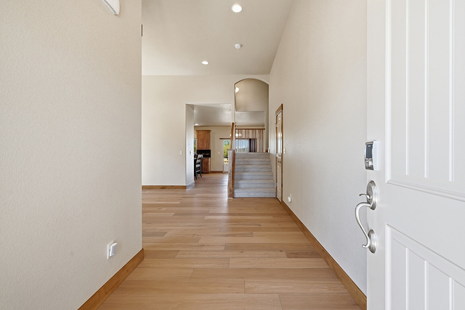 Arched Walkways, Baseboards Wall, High Ceiling, Natural Light, Recessed Lighting, Stairs, Wood Finish Floor, Drywall
