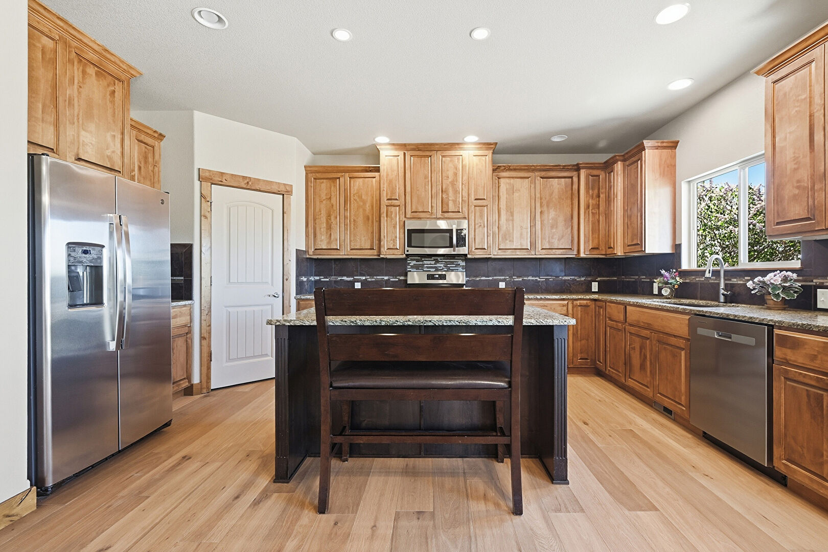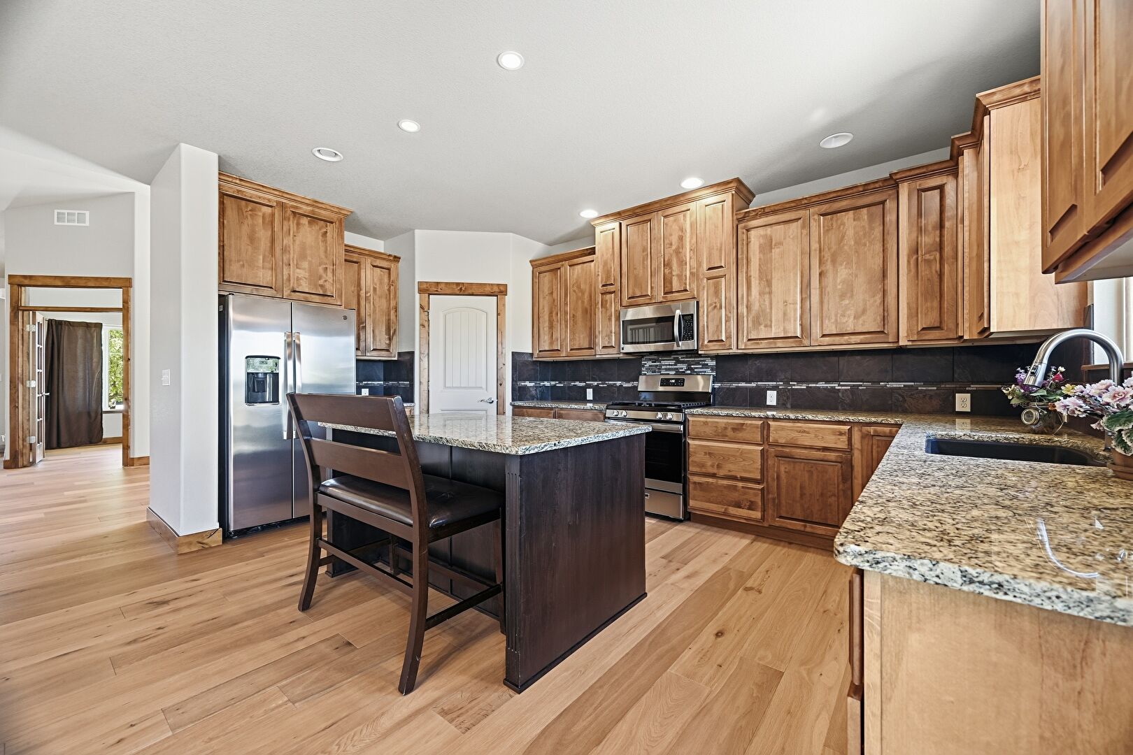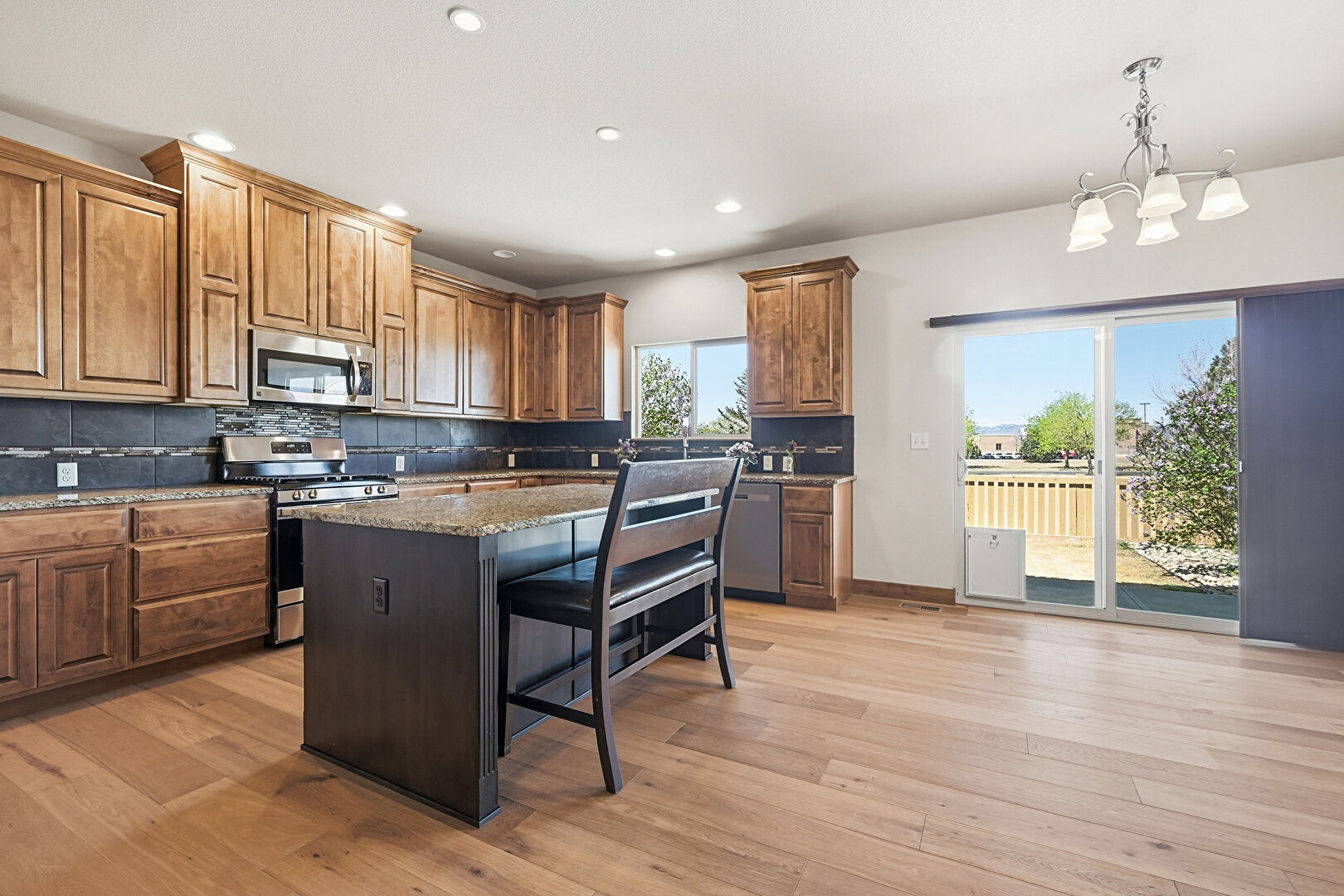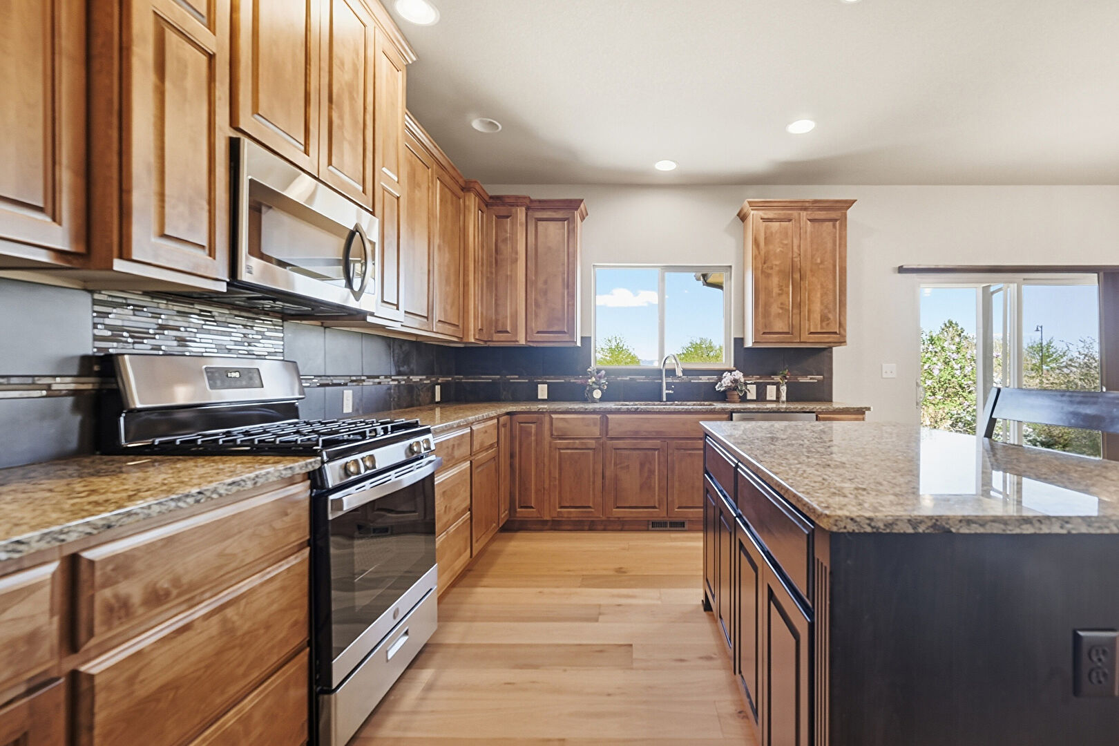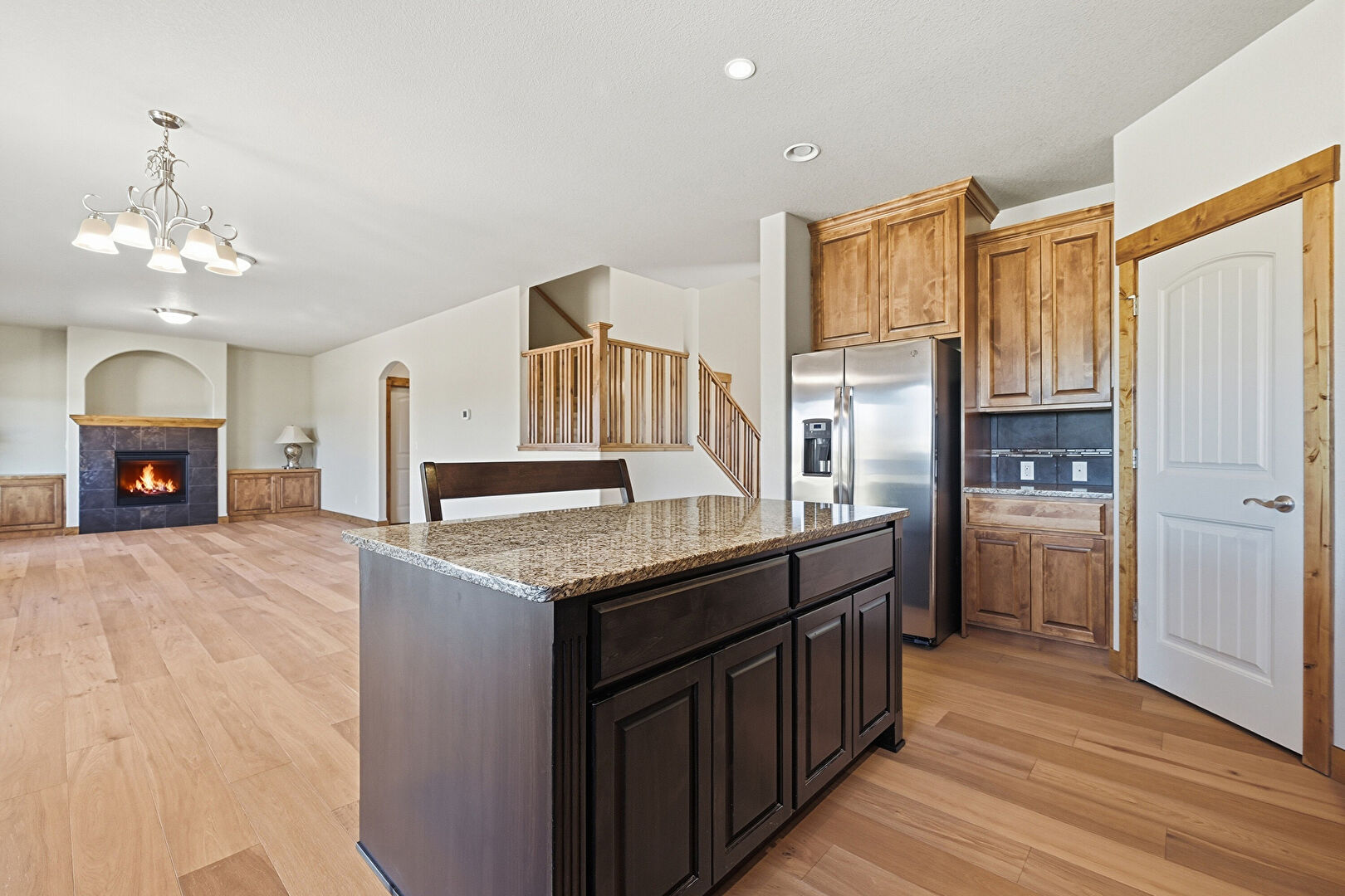 Arched Walkways, Baseboards Wall, Crown Molding Cabinets, Dark Brown Cabinets, Drywall, Fireplace, Kitchen Bar, Kitchen Island, L Shaped Kitchen, Medium Brown Cabinets, Natural Light, Notable Chandelier, Opens To Living Area, Pendant Lighting, Raised Cabinets, Recessed Lighting, Stone Countertops, Vent, Wood Finish Floor, Kitchen Bar, Kitchen Island, Raised Cabinets, Recessed Lighting, U Shaped Kitchen