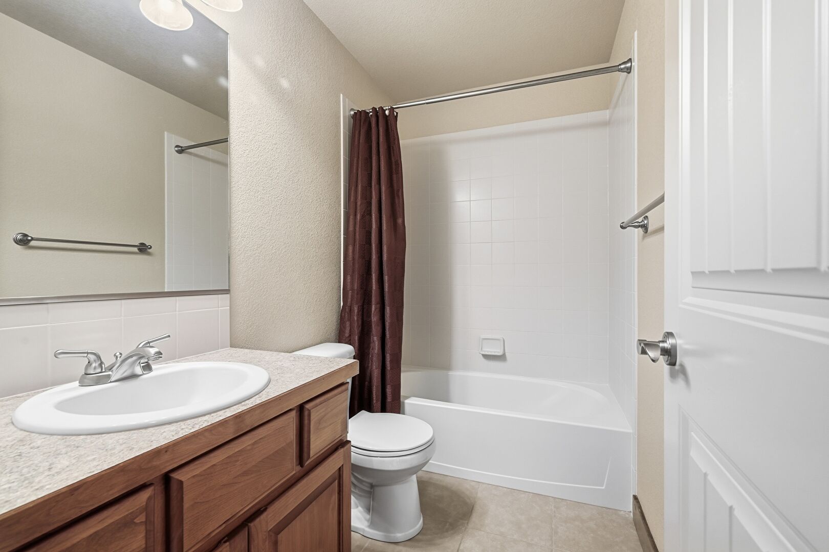 Full Bathroom, Textured Wall, Tile Floor, Vanity, Combined Bath Shower