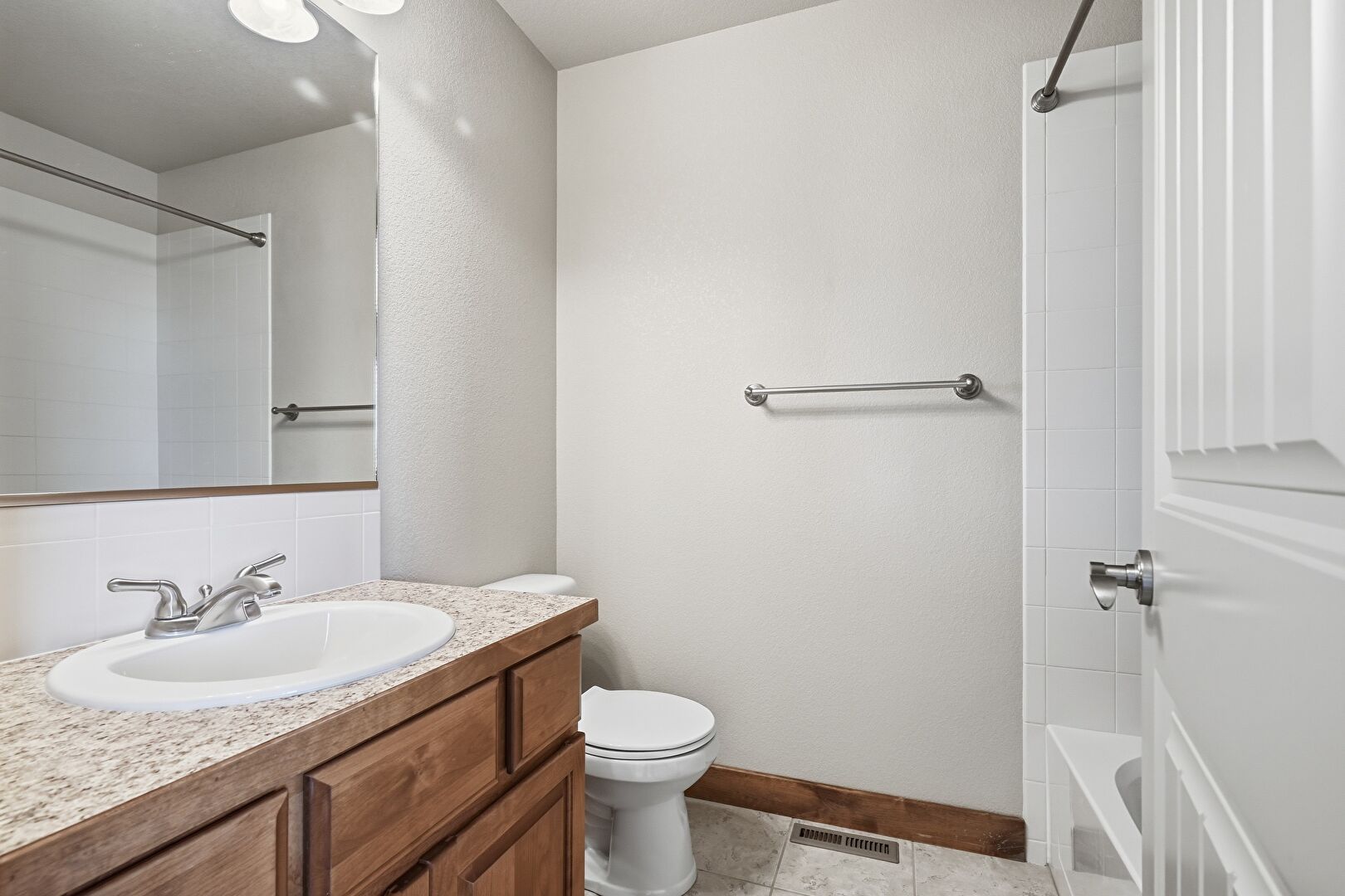 Combined Bath Shower, Full Bathroom, Textured Wall, Tile Floor, Vanity, Vent, Baseboards Wall