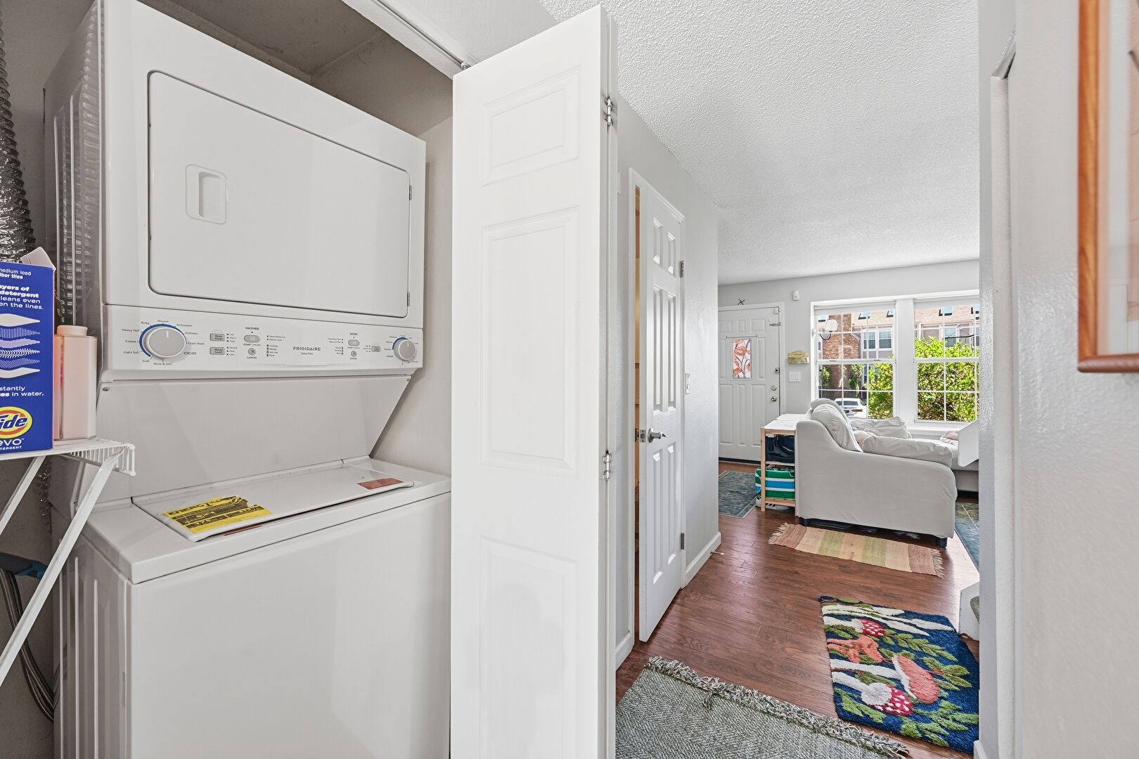 Laundry, Natural Light, Textured Ceiling, Wood Finish Floor, Baseboards Wall
