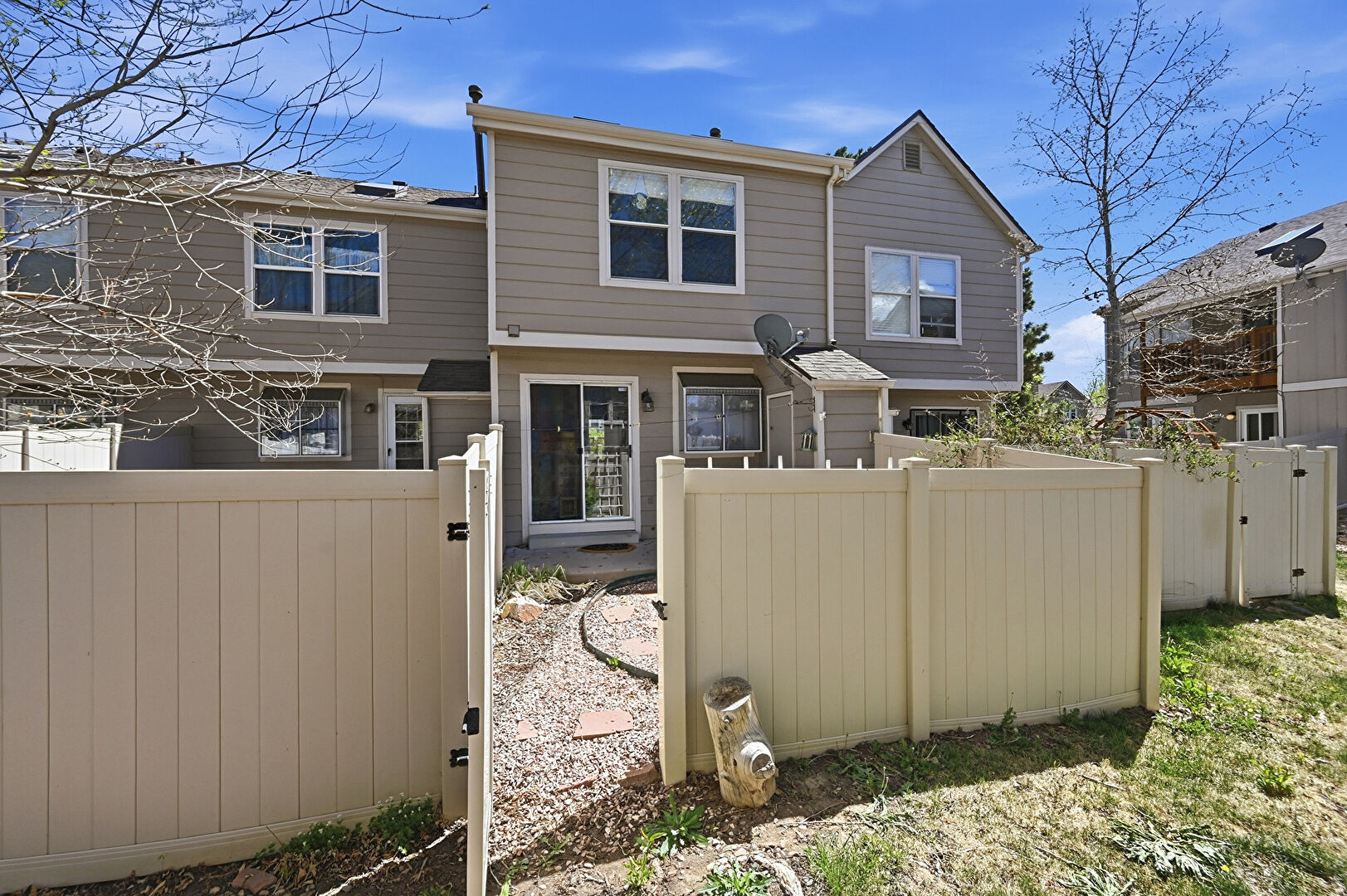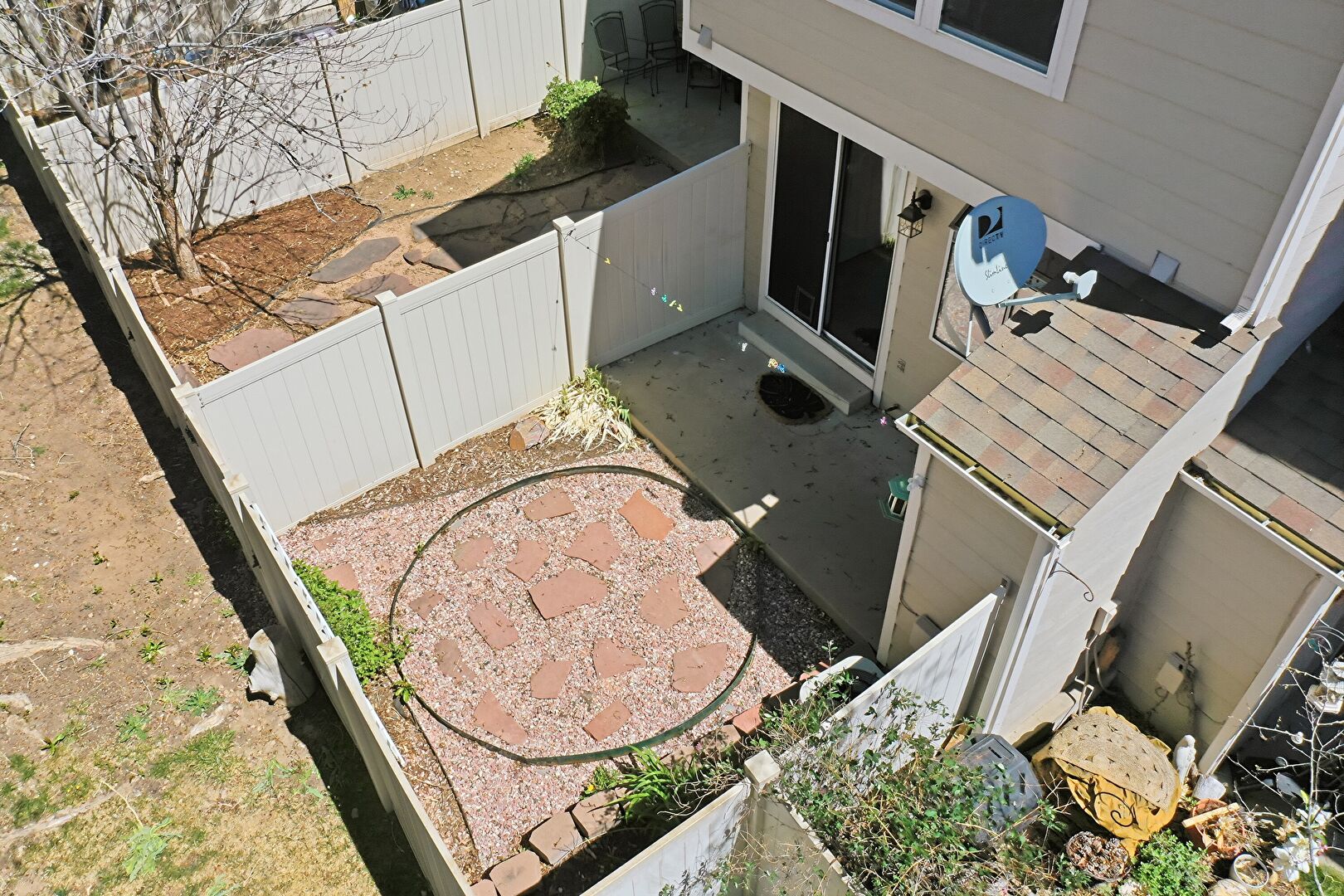 Downspout, Fence, Gate, Gutters, Horizontal Siding, Pad Mount Transformer, Satellite Dish, Shingle Roof, Gate, Patio