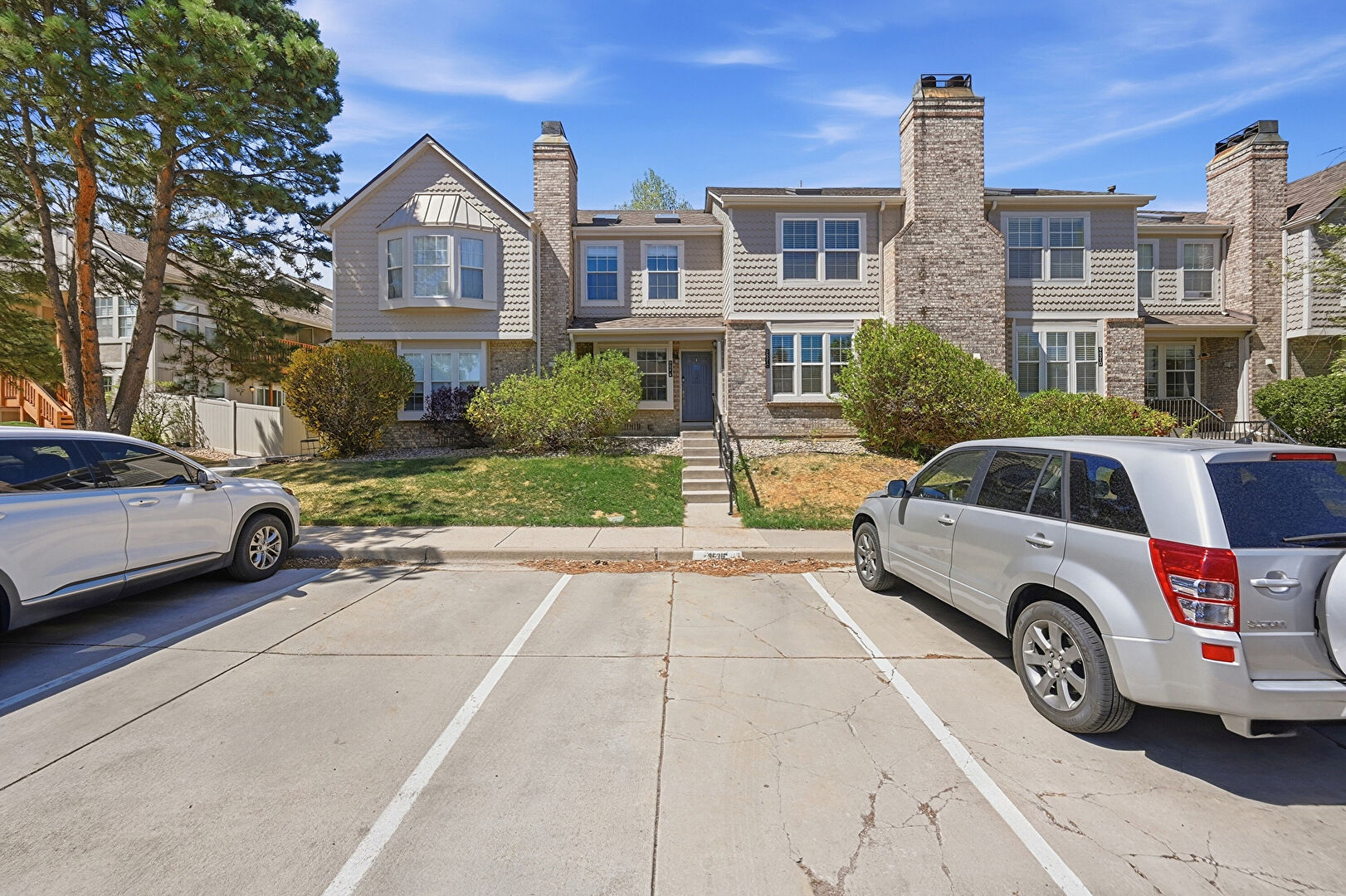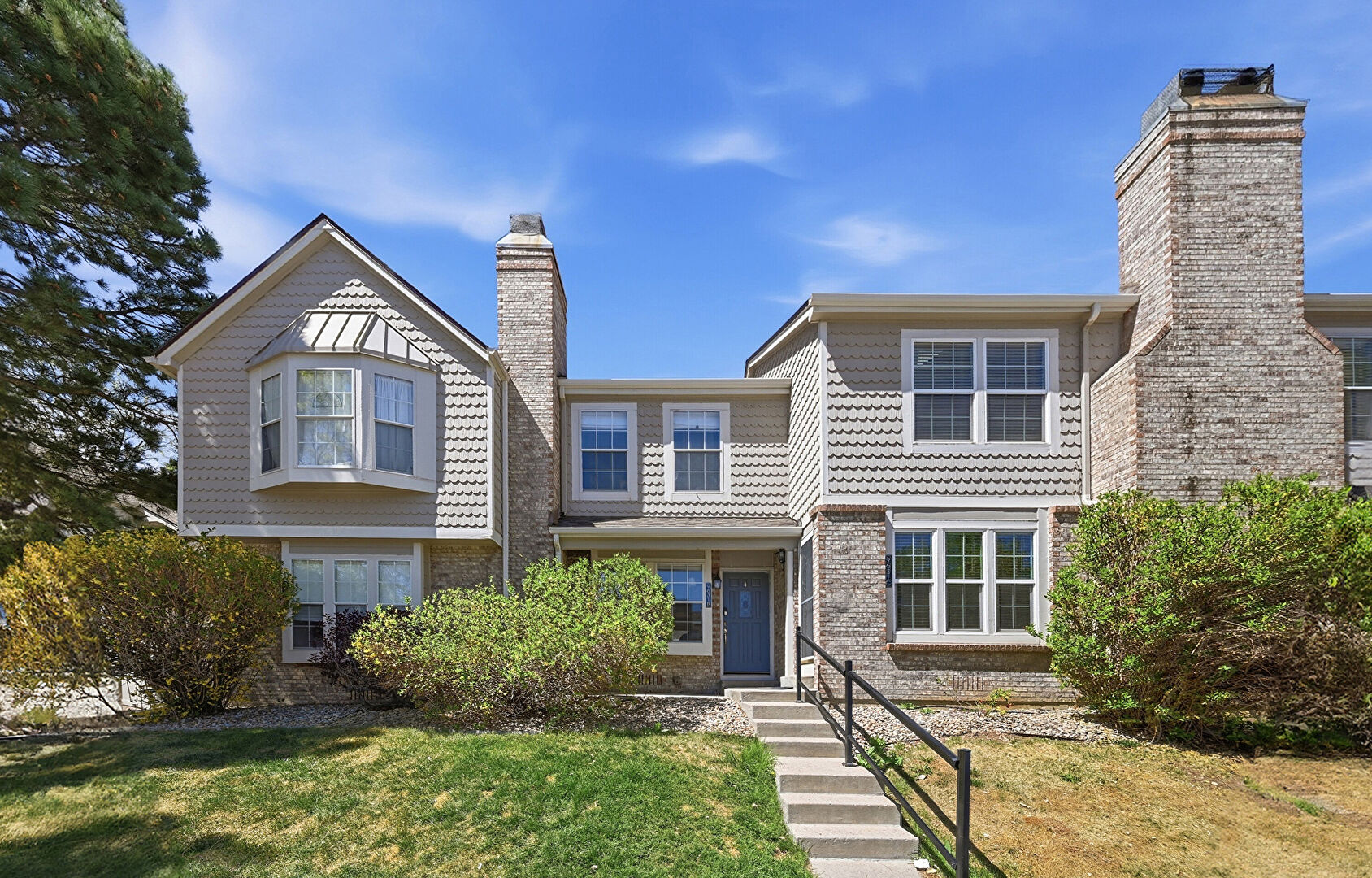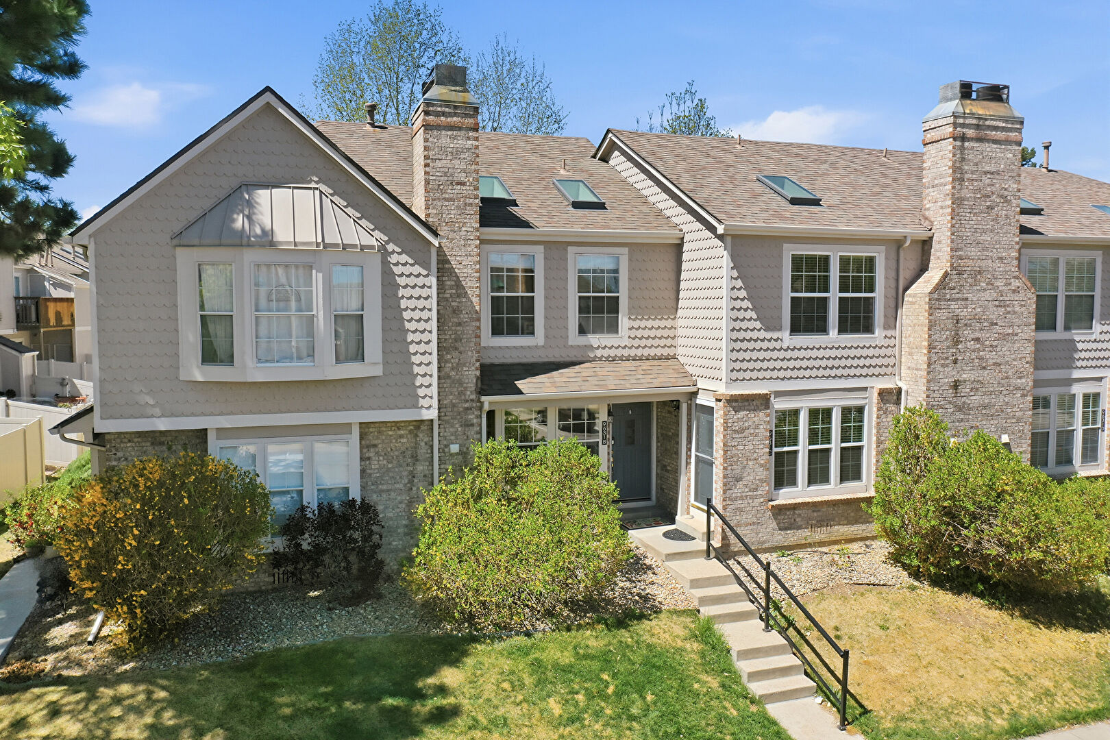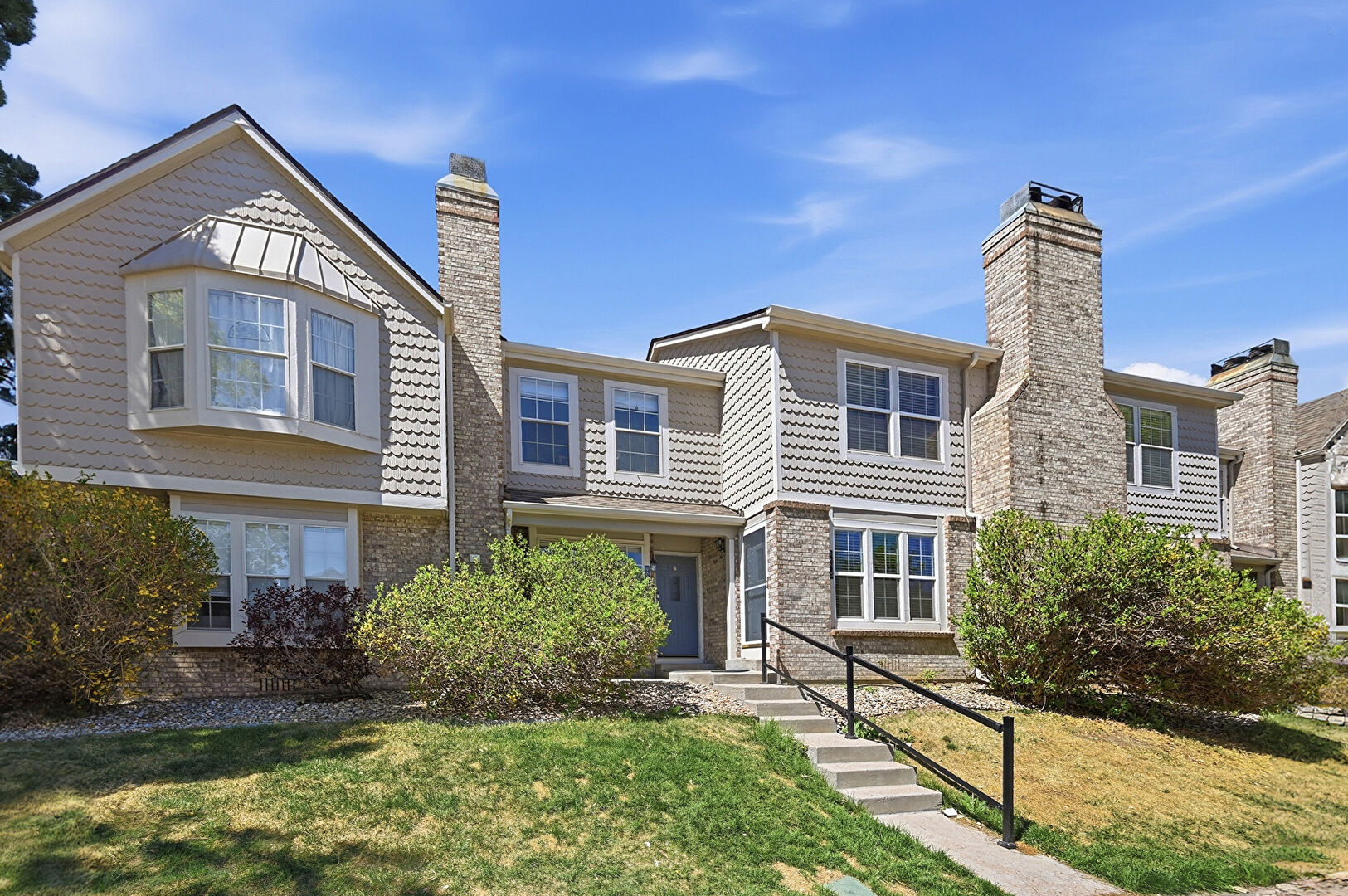 Board Batten Siding, Brick Siding, Chimney, Downspout, Fence, Gutters, Horizontal Siding, Lawn, Shake Shingle Siding, Shingle Roof, Stoop, Vertical Siding, Chimney, Gutters, Parking Lot, Shake Shingle Siding, Shingle Roof