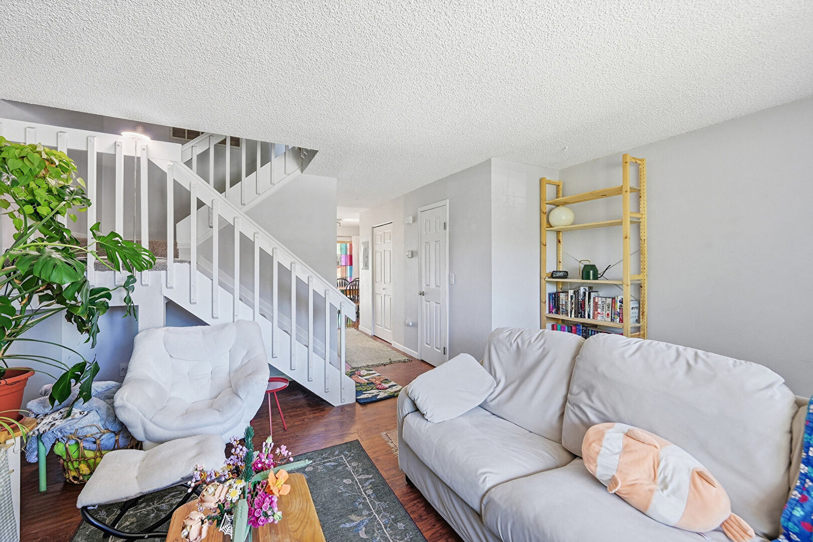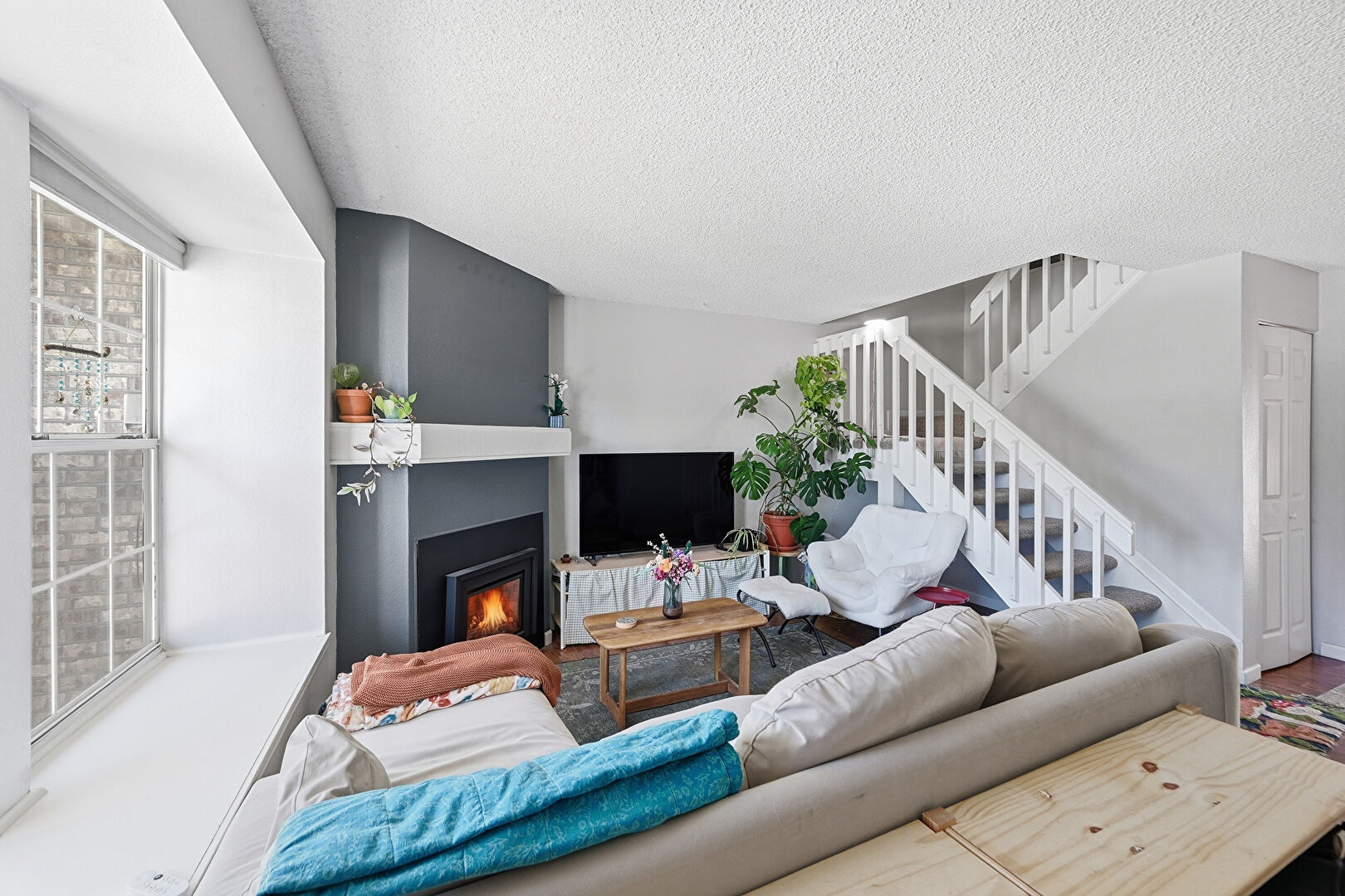 Drywall, Fireplace, Natural Light, Stairs, Textured Ceiling, Wood Finish Floor, Baseboards Wall, Fireplace, Stairs