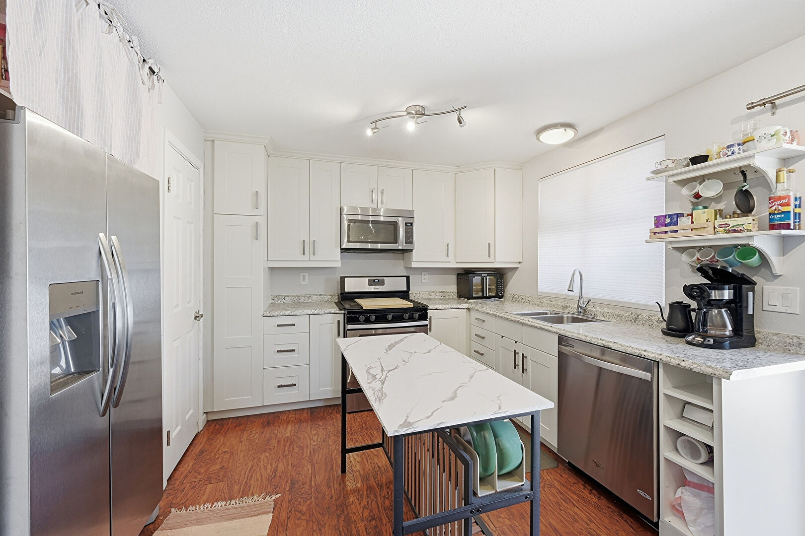 Crown Molding Cabinets, Drywall, Kitchen Bar, Kitchen Island, Natural Light, Open Shelves, Shaker Cabinets, Smoke Carbon Monoxide Detector, Stone Countertops, Toaster, Track Lighting, U Shaped Kitchen, Vent, Wood Finish Floor, Drywall, Open Shelves, Stone Countertops
