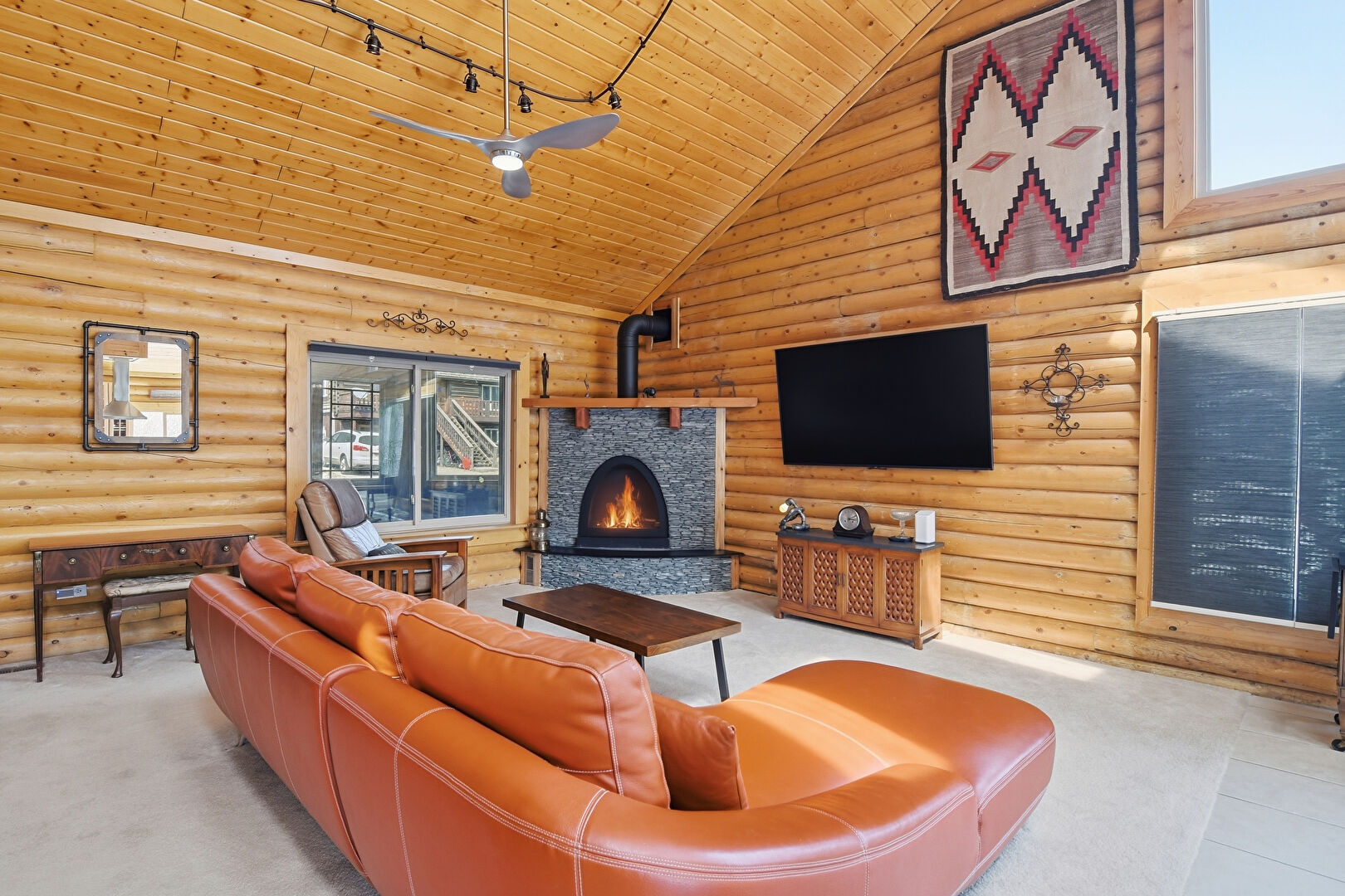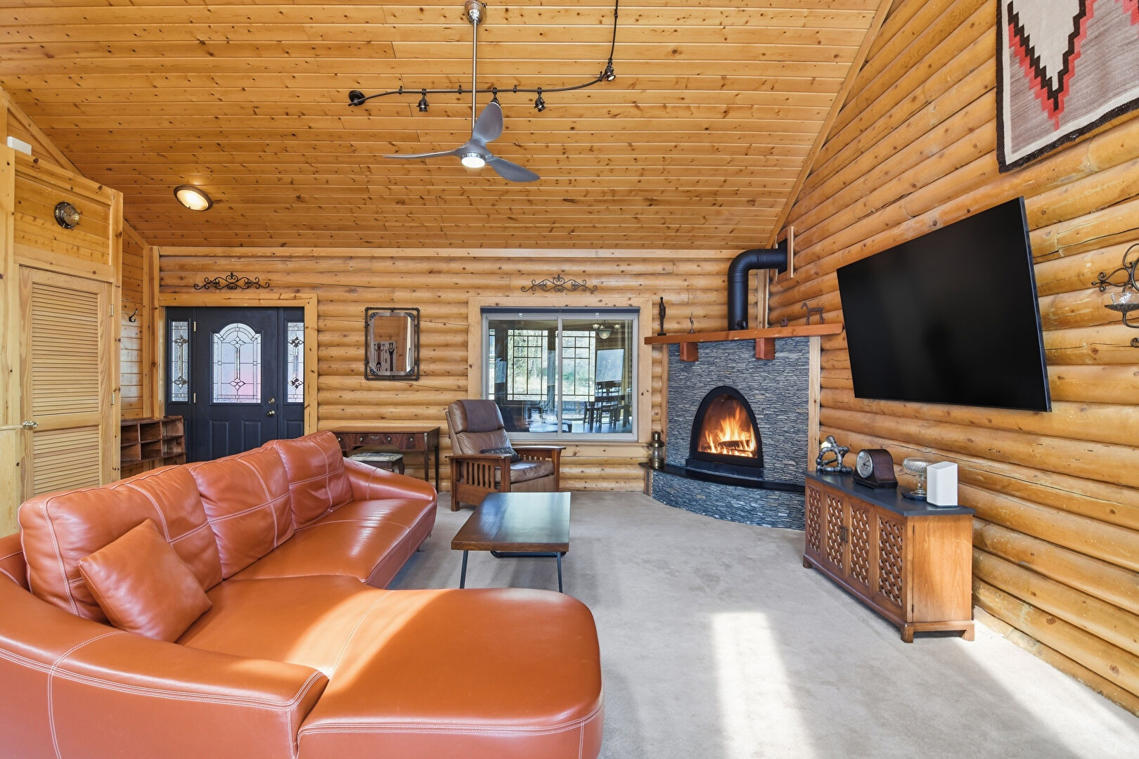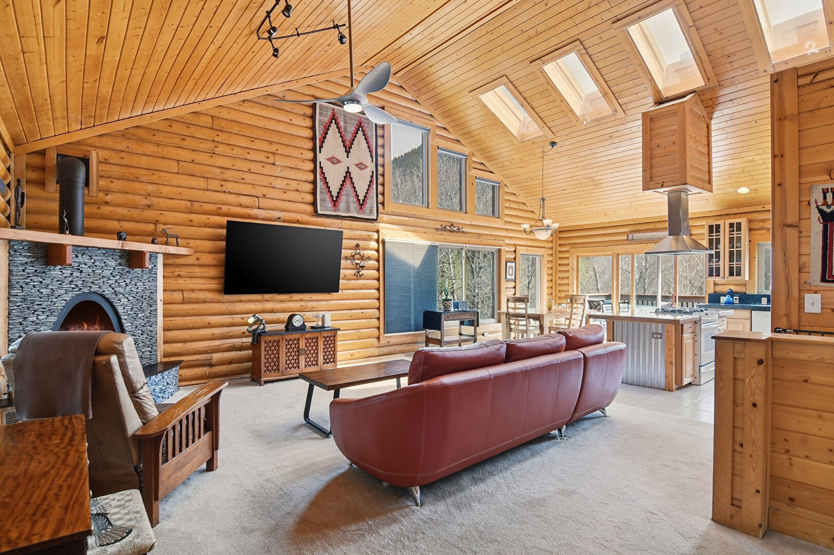 Carpet, Cathedral Ceiling, Ceiling Fan, Fireplace, High Ceiling, Log Wall, Natural Light, Skylight, Track Lighting, Vaulted Ceiling, Wood Ceiling, Wood Stove, Carpet, High Ceiling