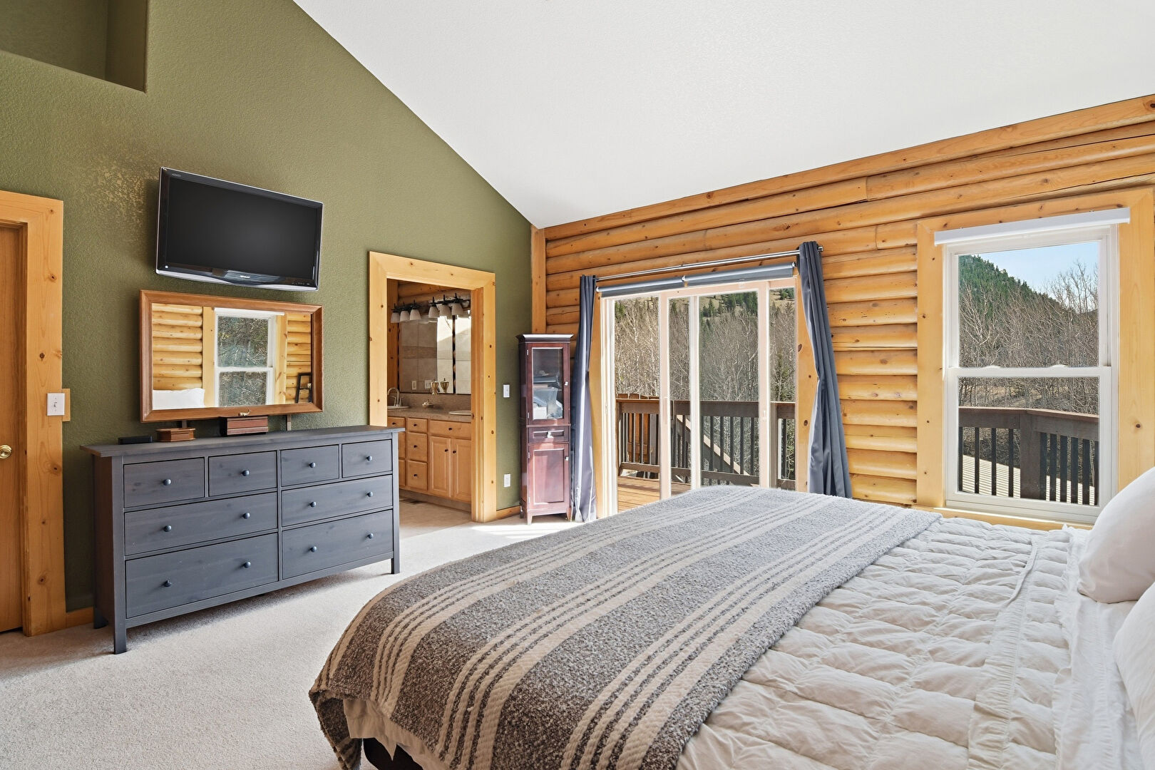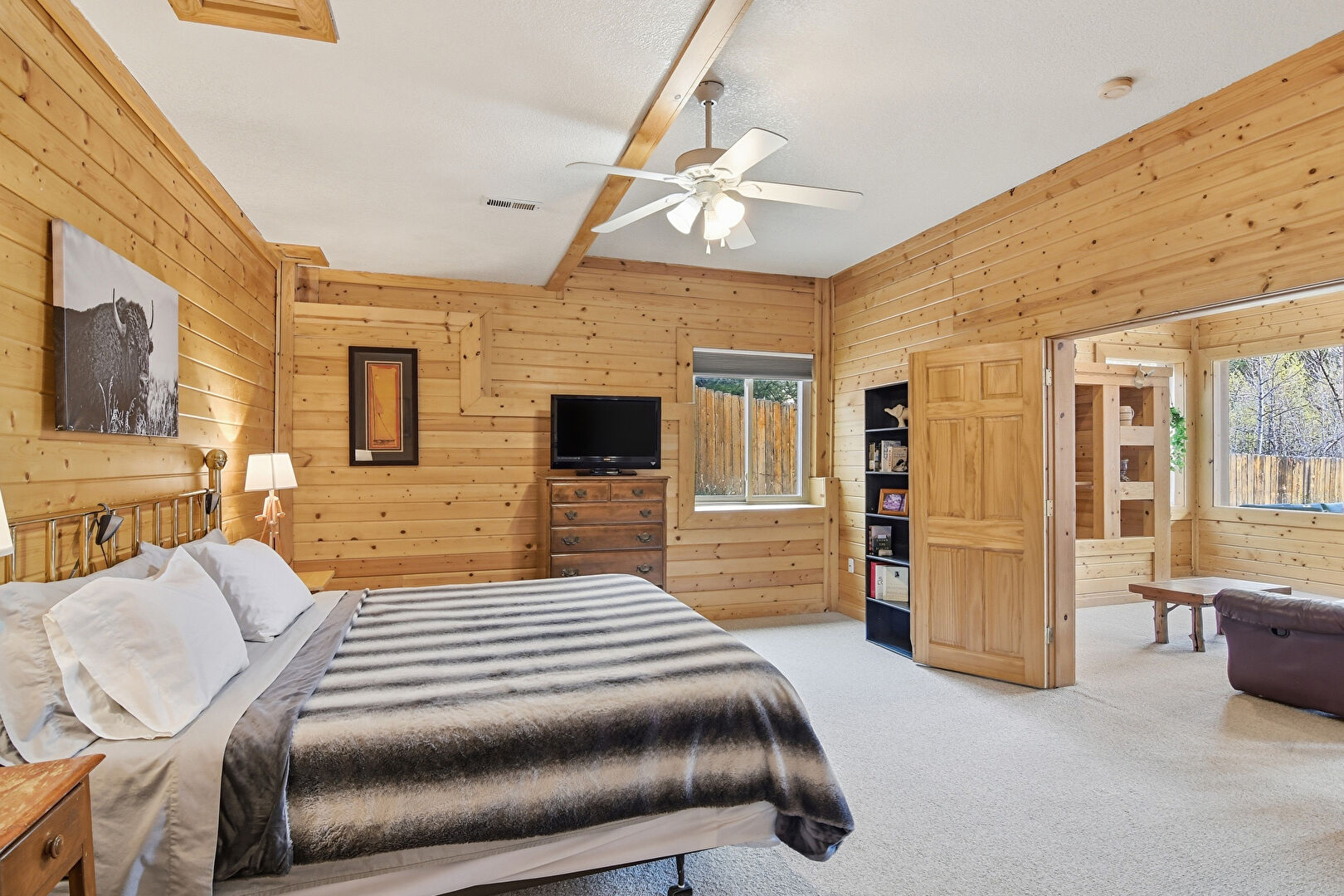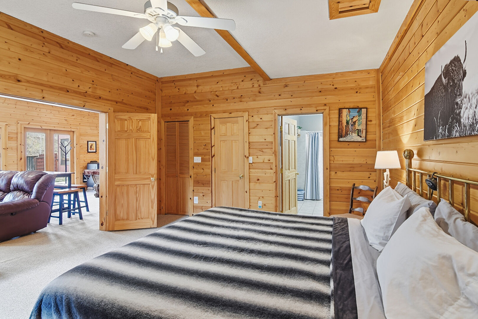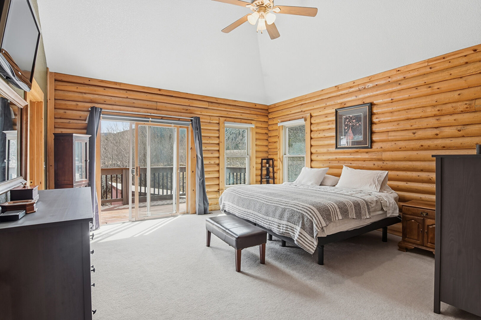 Access To Exterior, Carpet, Ceiling Fan, Ensuite Bathroom, Log Wall, Natural Light, Vaulted Ceiling, High Ceiling