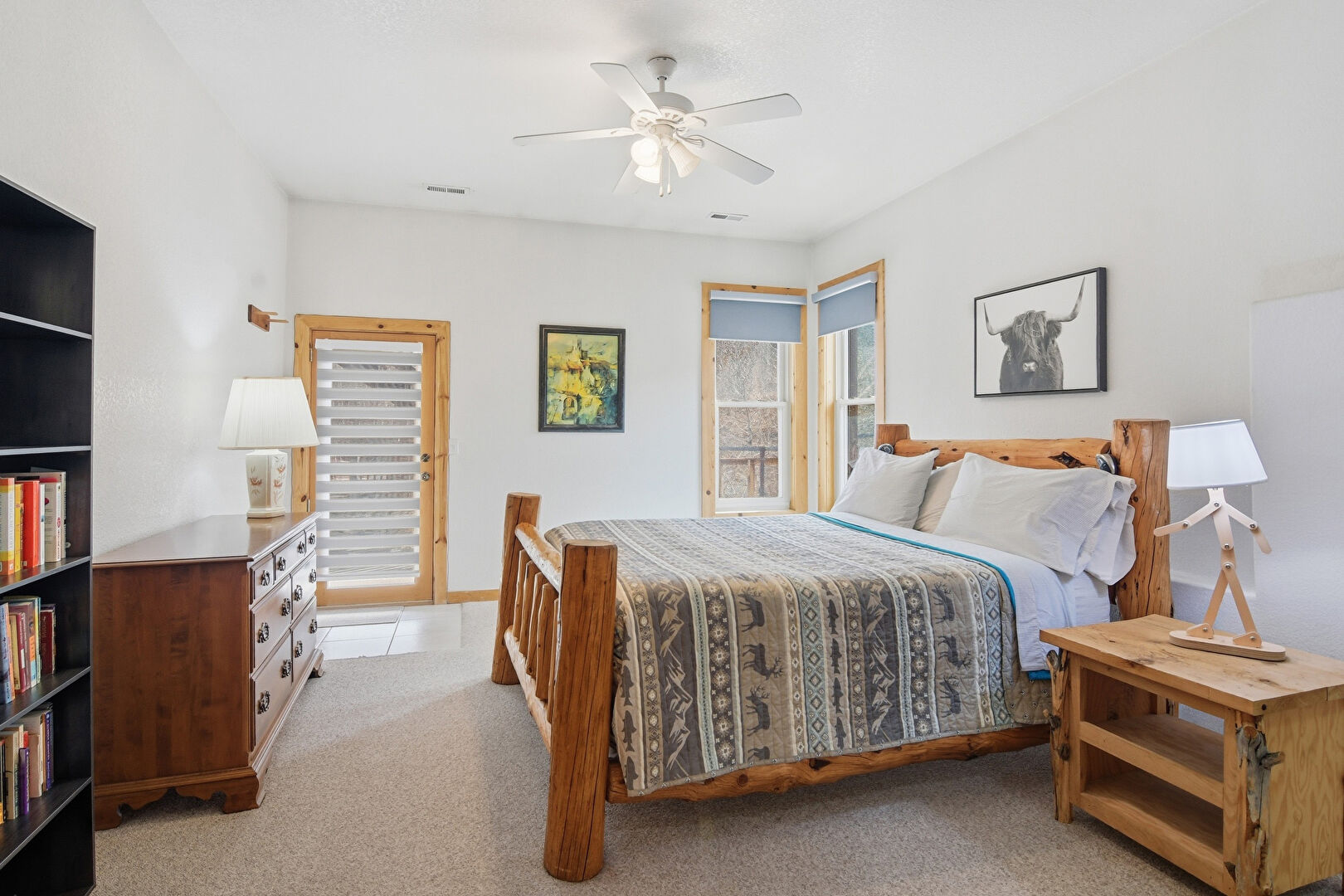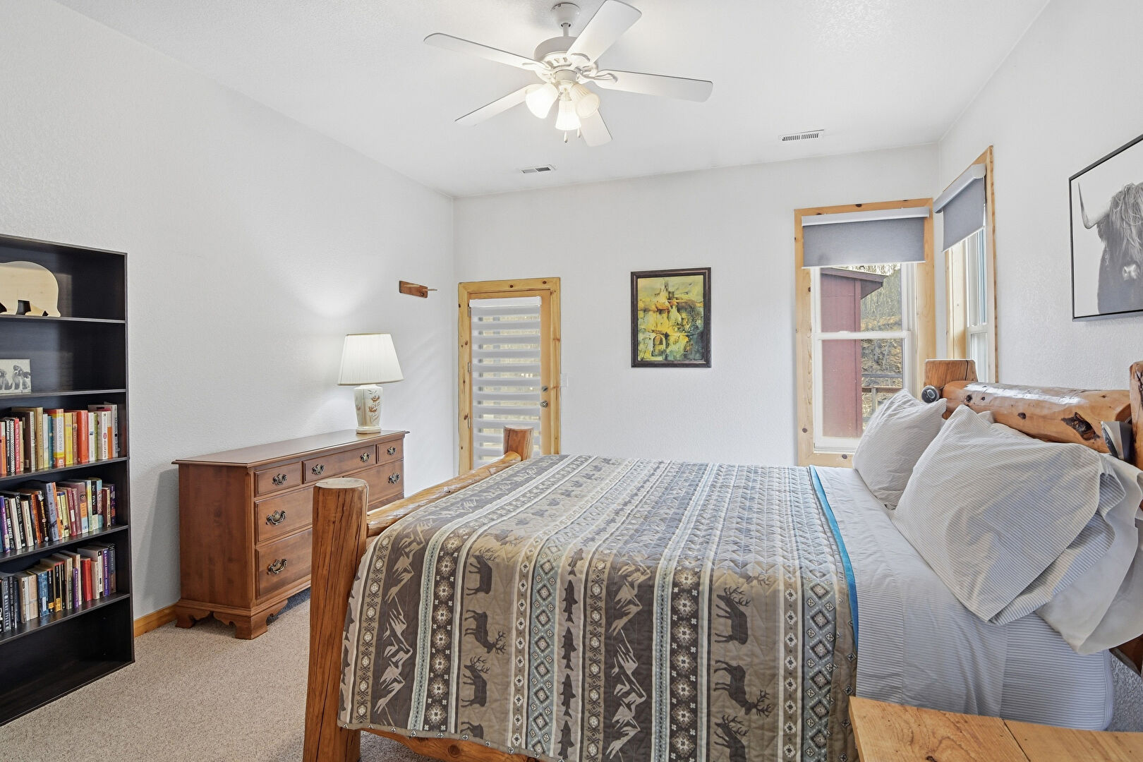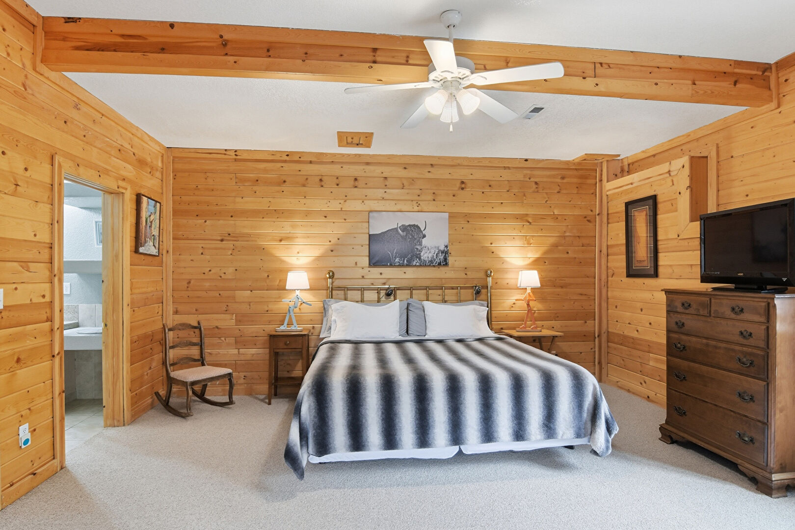 Access To Exterior, Carpet, Ceiling Fan, Ensuite Bathroom, Log Wall, Natural Light, Vaulted Ceiling, High Ceiling