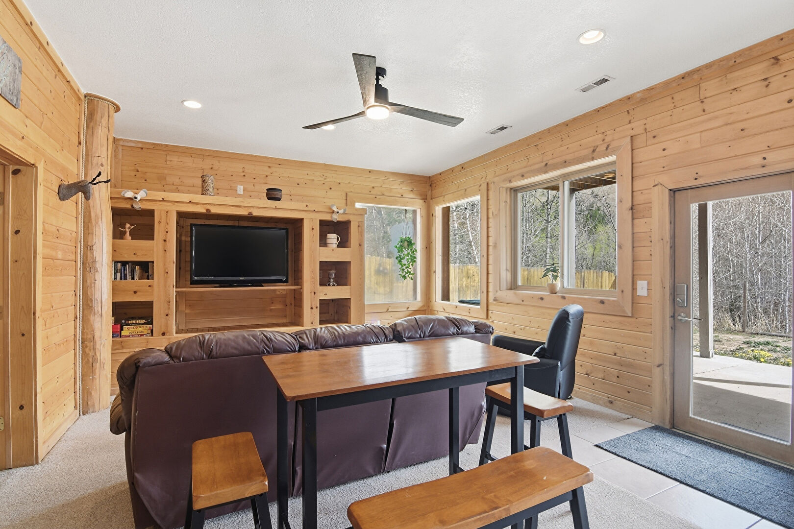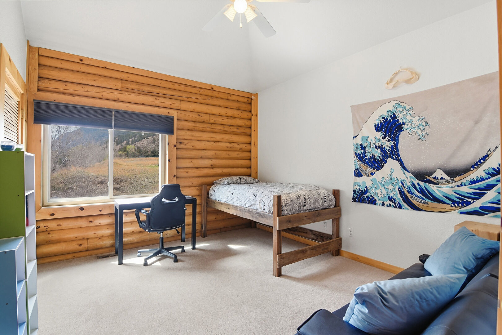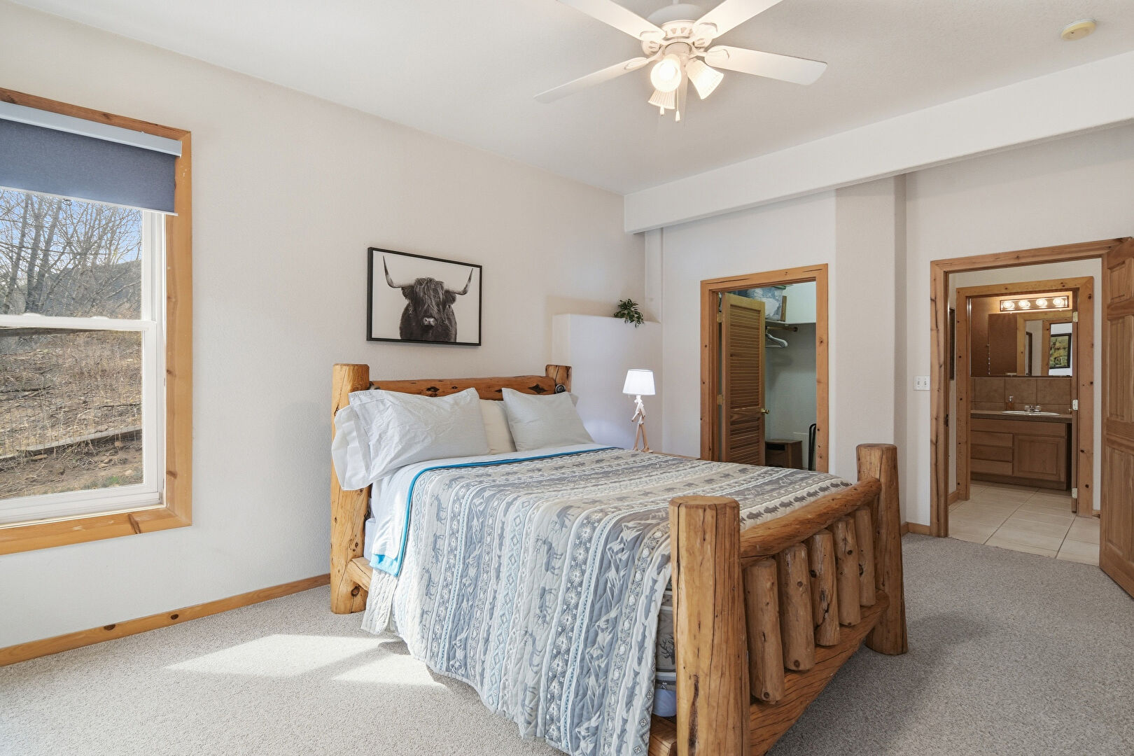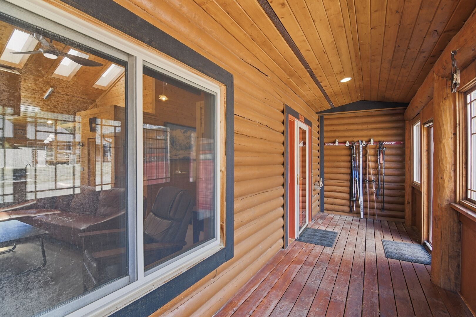 Access To Exterior, Carpet, Ceiling Fan, Ensuite Bathroom, Log Wall, Natural Light, Vaulted Ceiling, High Ceiling