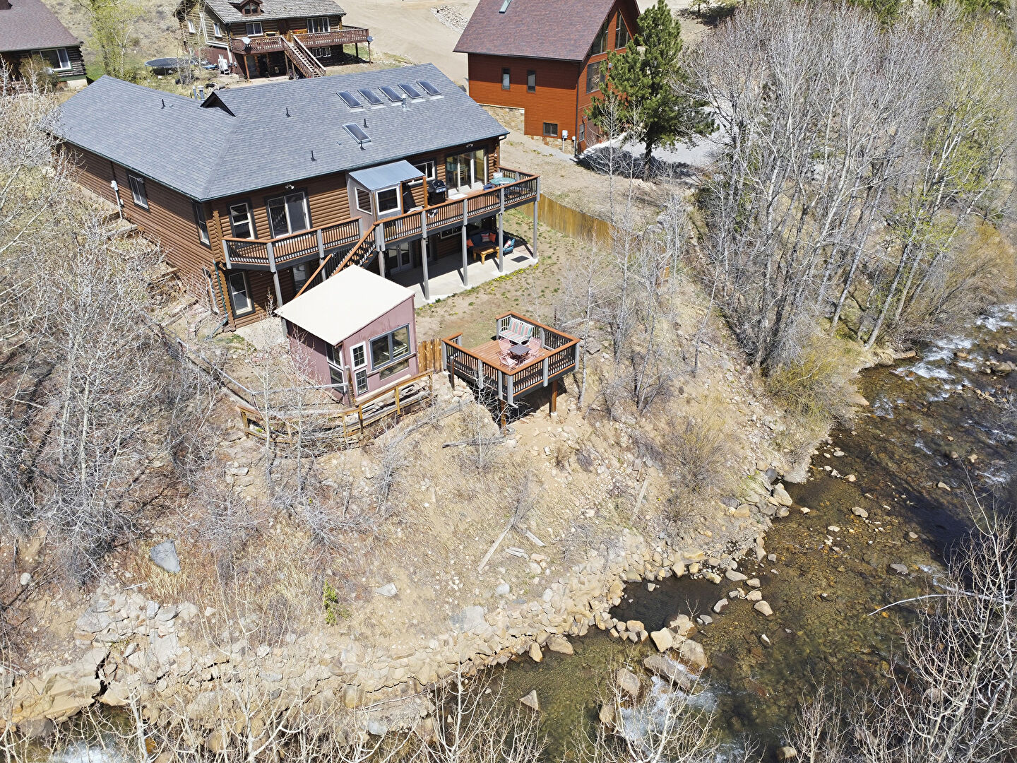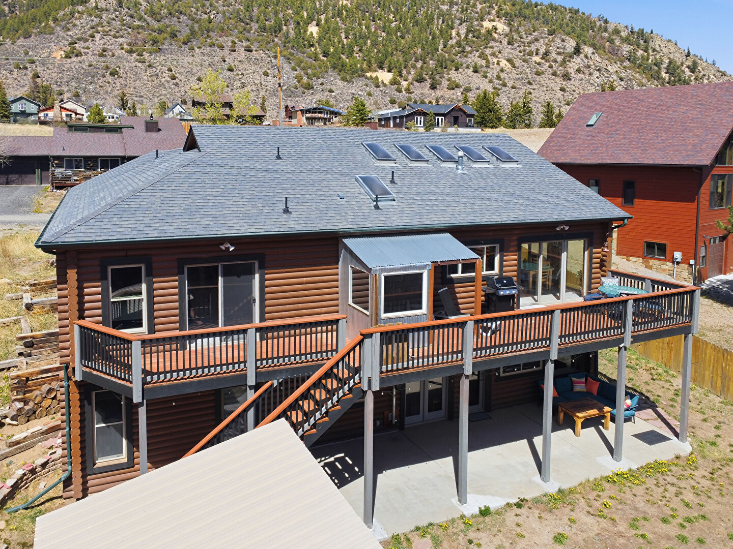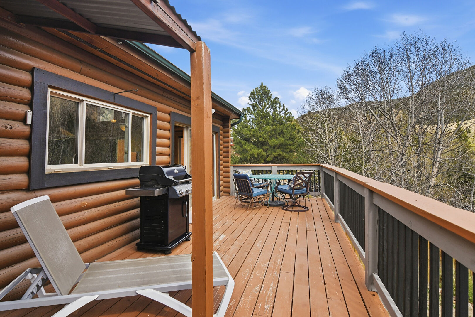 Awning, Deck, Downspout, Fence, Grill, Horizontal Siding, Log Siding, Mountain View, Patio, Shingle Roof, Stairs, Gutters