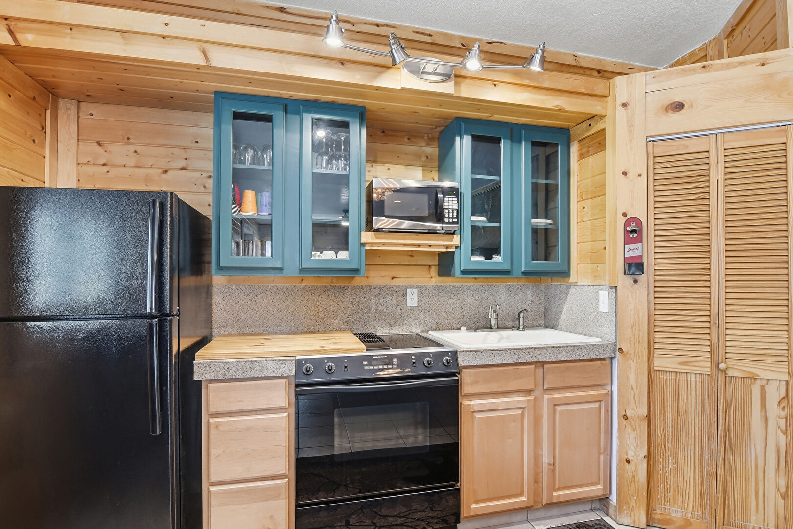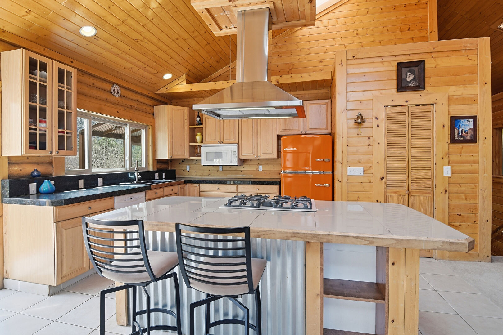 Blue Cabinets, Glass Insert Cabinets, High Ceiling, Kitchen Bar, Kitchen Island, L Shaped Kitchen, Log Wall, Natural Light, Open Shelves, Pendant Lighting, Raised Cabinets, Recessed Lighting, Skylight, Stone Tile Countertops, Tile Floor, Vaulted Ceiling, Wood Ceiling, Wood Wall, Log Wall, Raised Cabinets, Tile Floor, Wood Wall