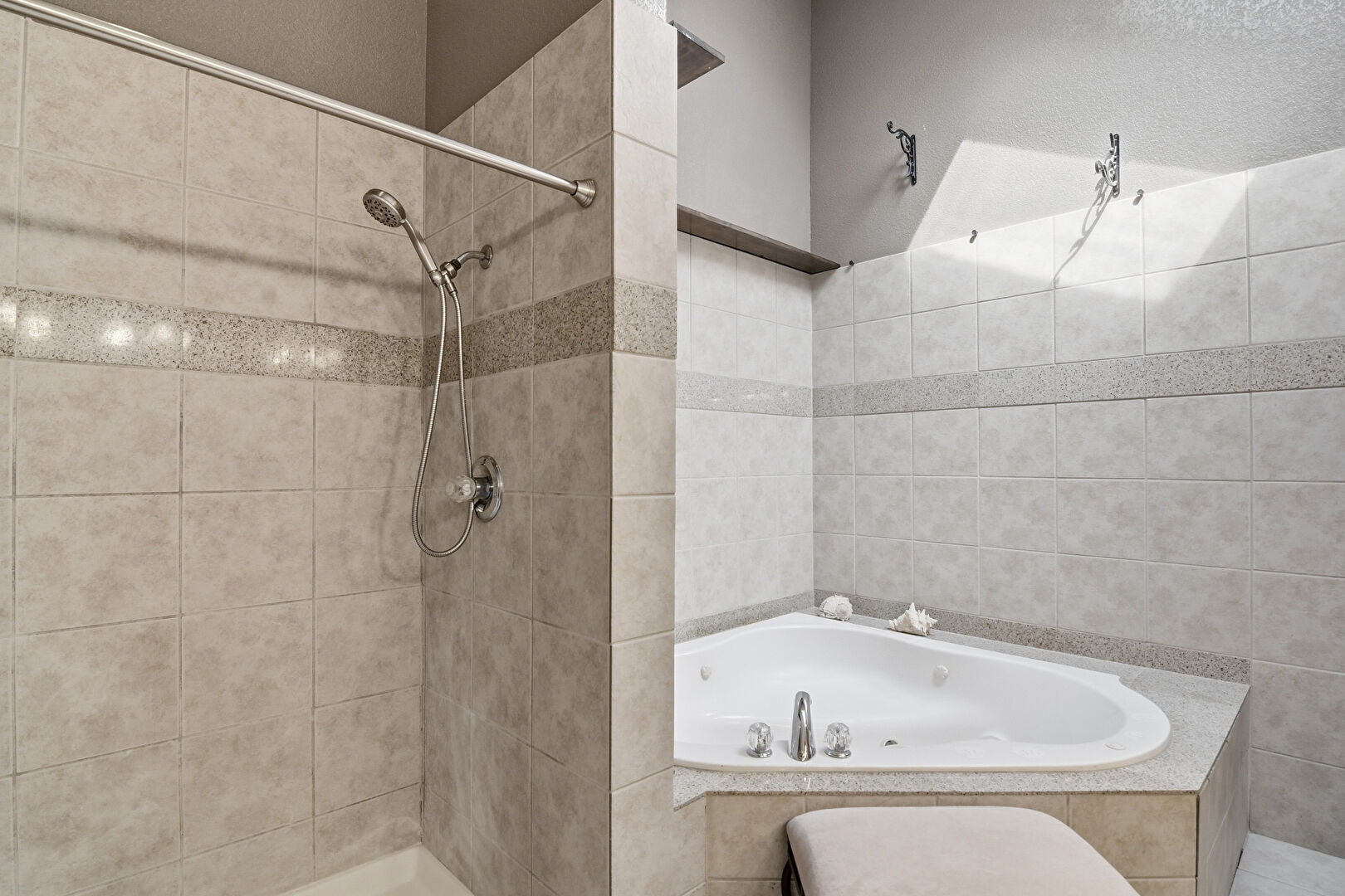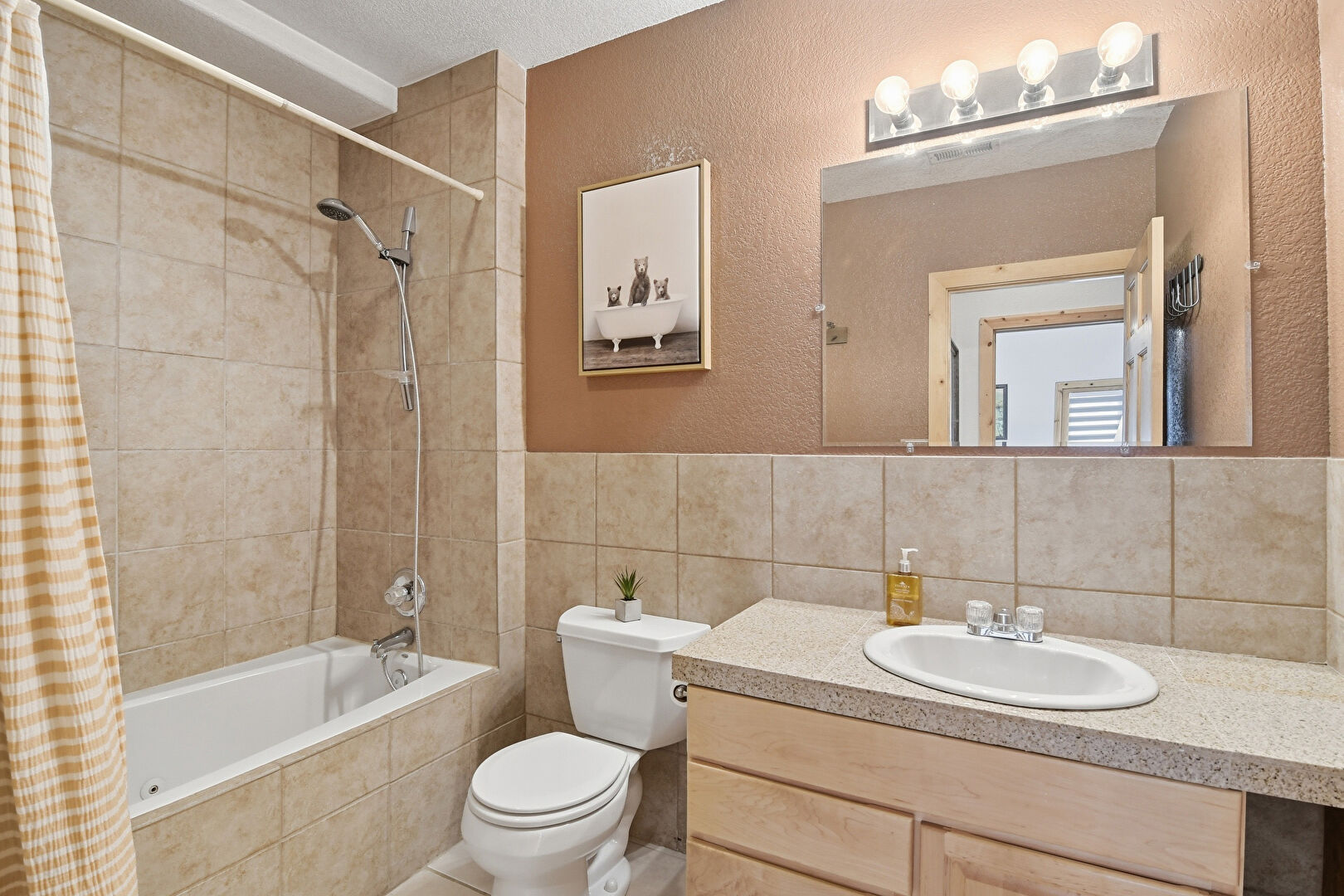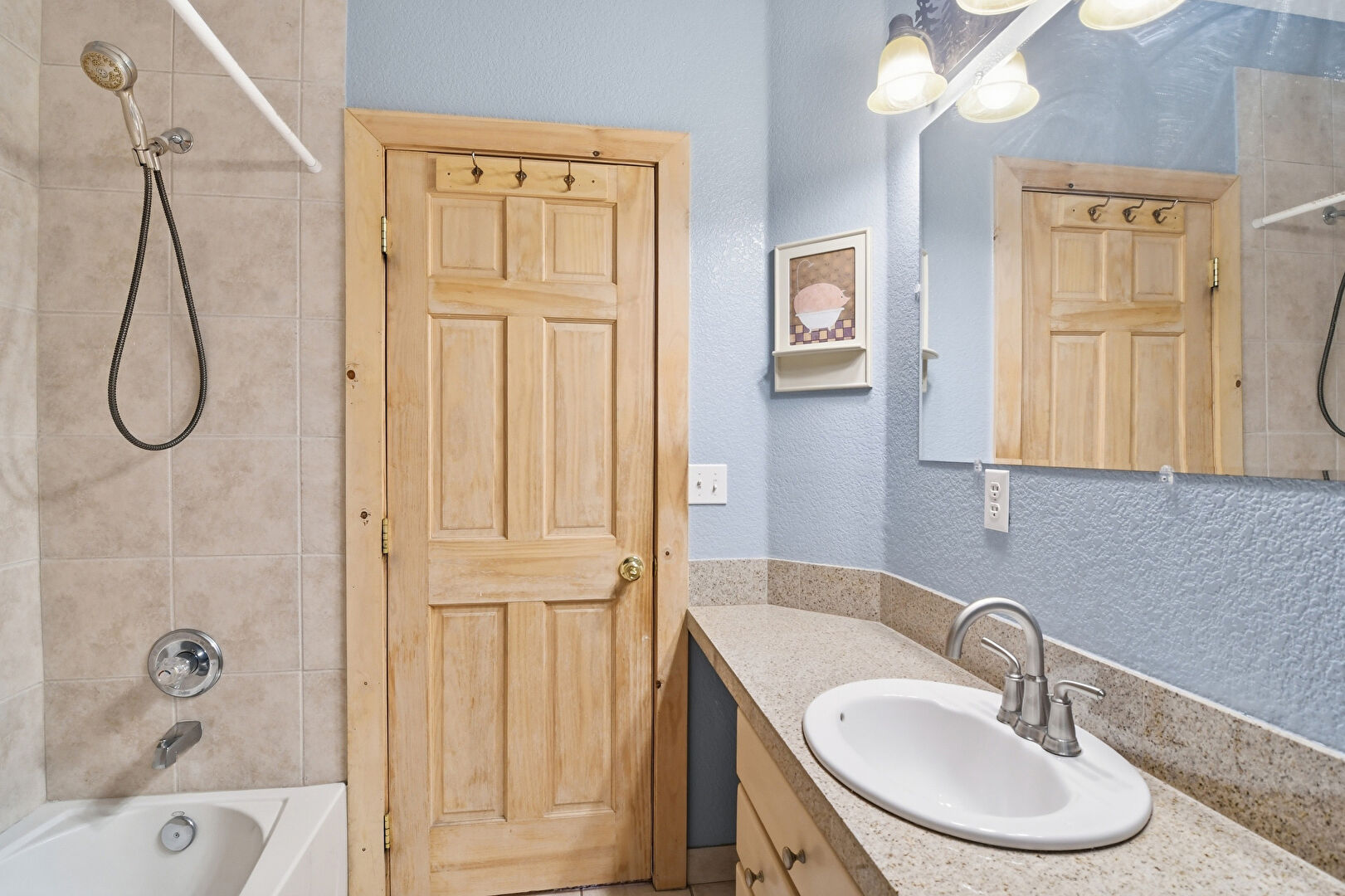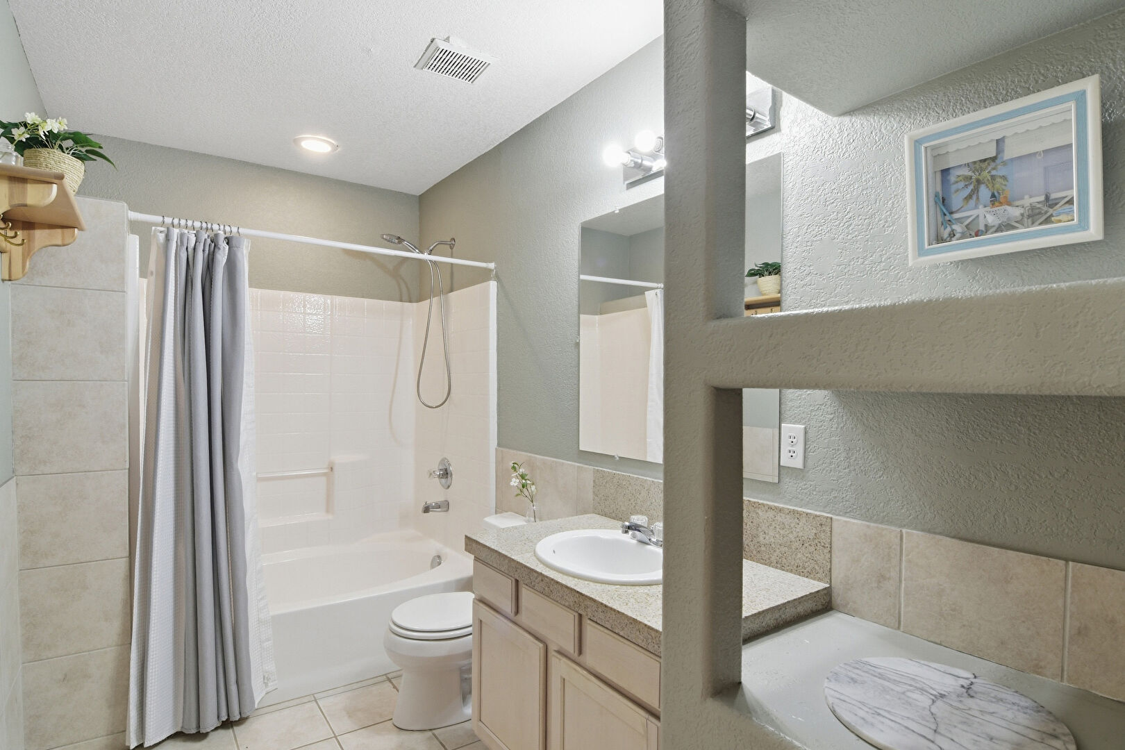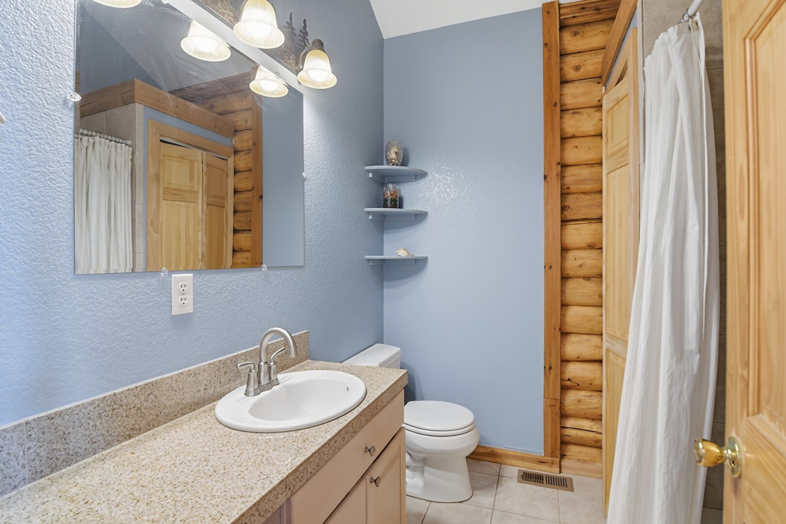 Baseboards Wall, Combined Bath Shower, Full Bathroom, Log Wall, Textured Ceiling, Textured Wall, Tile Floor, Vanity, Combined Bath Shower, Tile Wall, Vent