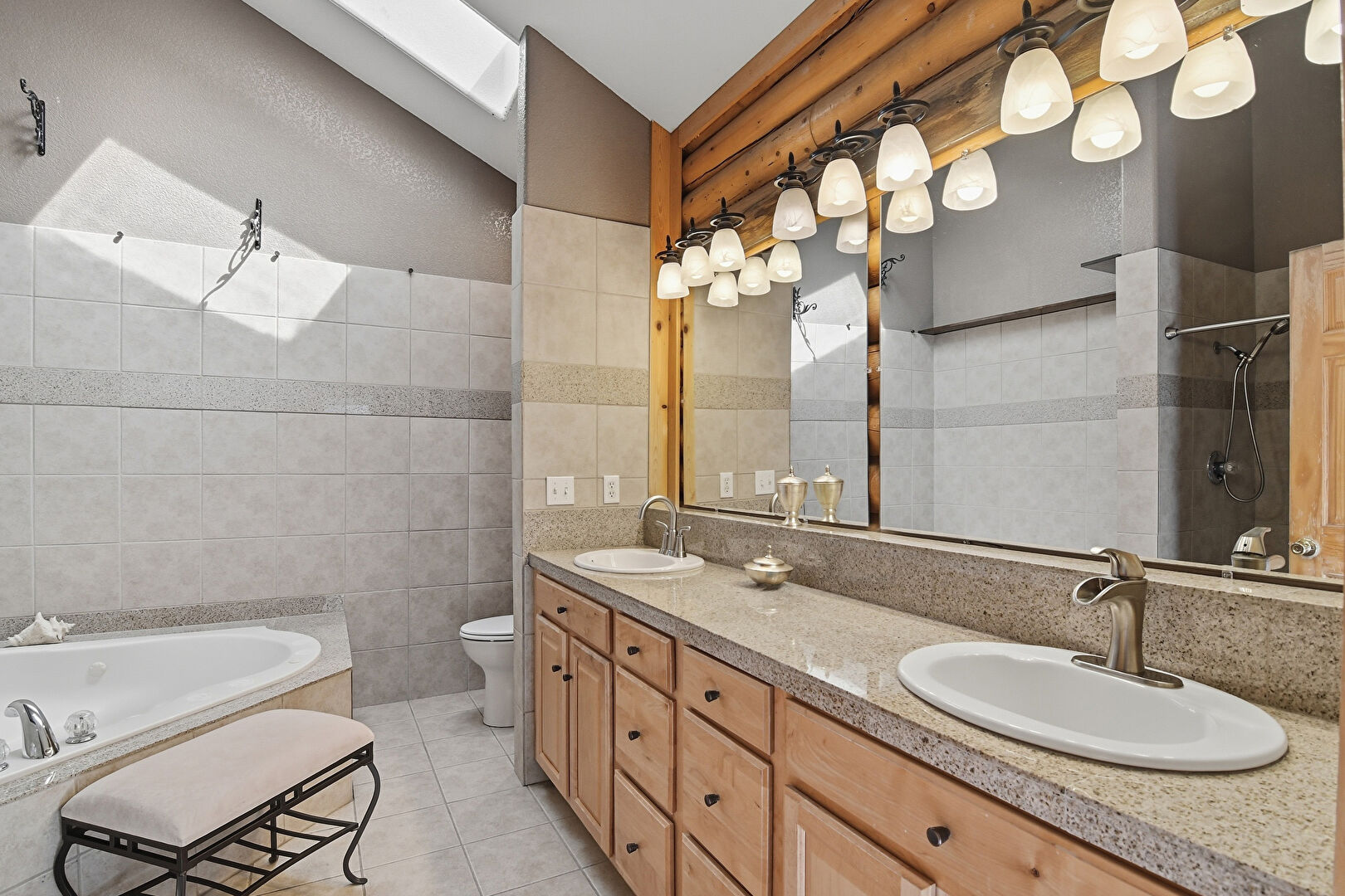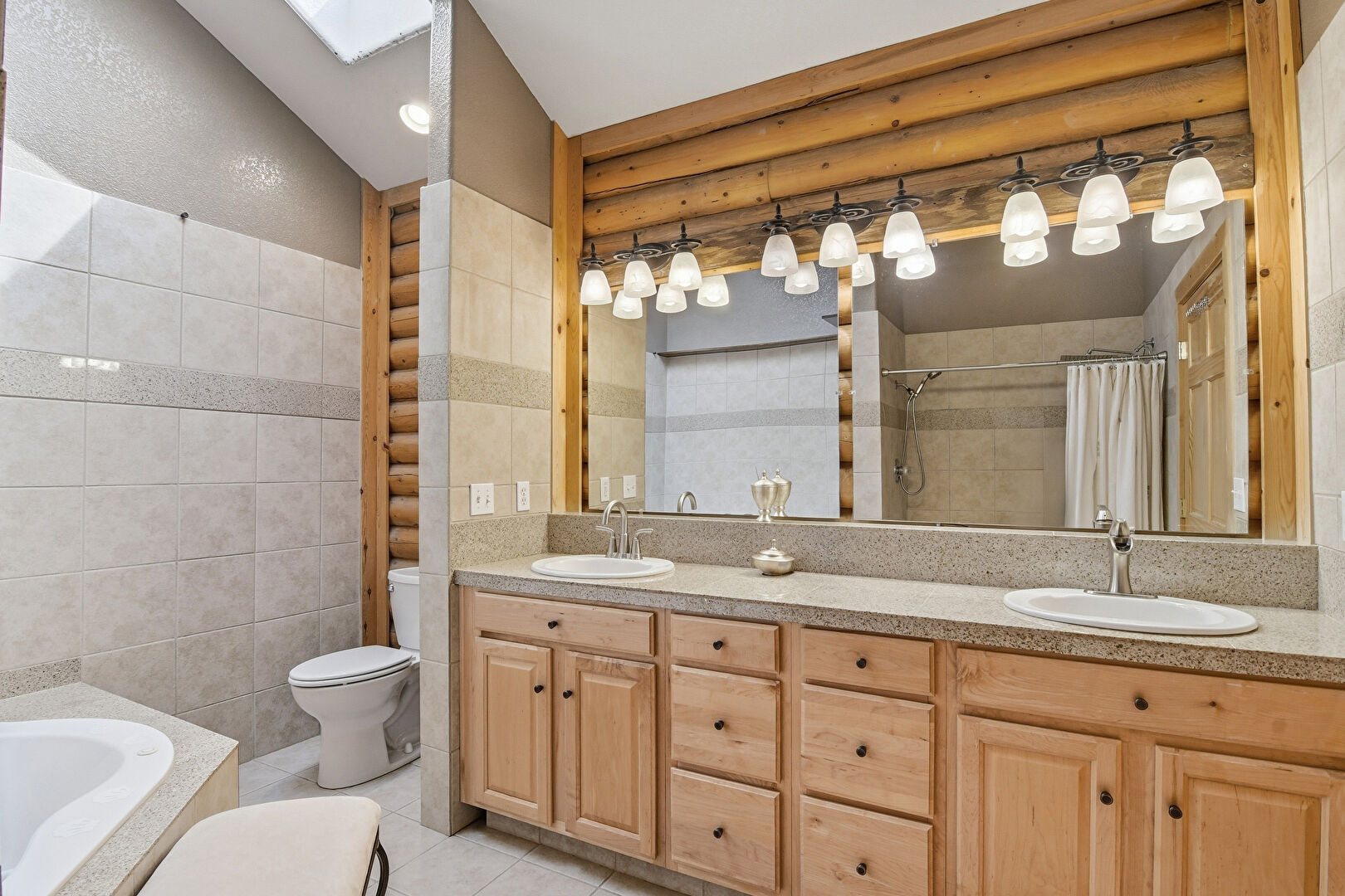Double Vanity, Full Bathroom, Log Wall, Recessed Lighting, Skylight, Textured Wall, Tile Floor, Tile Wall, Double Vanity, Full Bathroom, Textured Wall