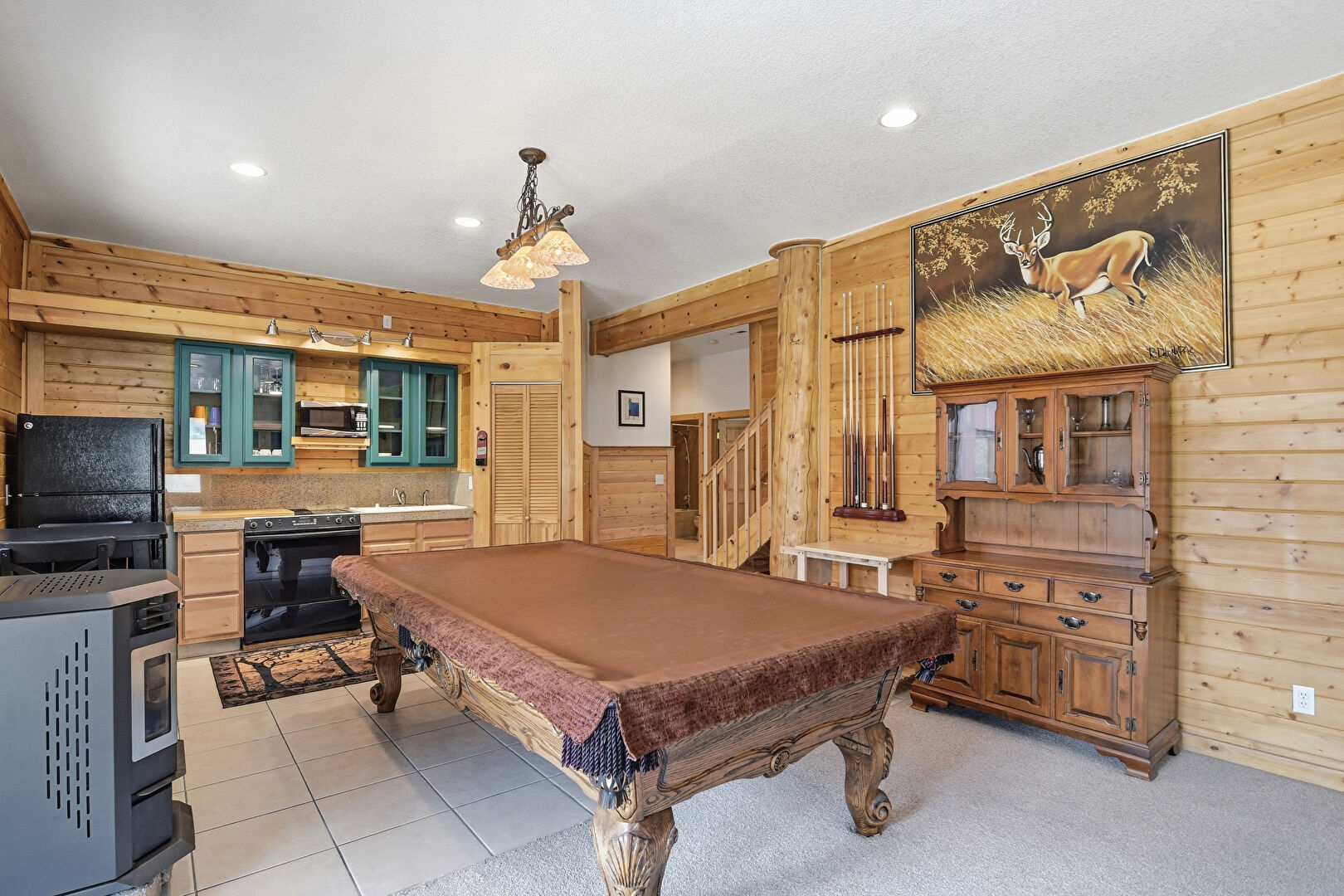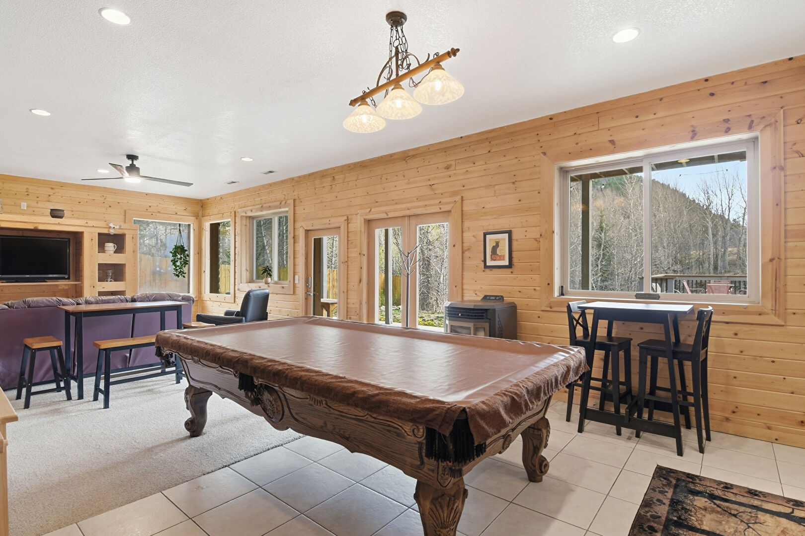 Billiards, Carpet, Ceiling Fan, Drywall, Natural Light, Recessed Lighting, Tile Floor, Vent, Wainscot Wall, Wood Wall, Ceiling Fan, Tile Floor