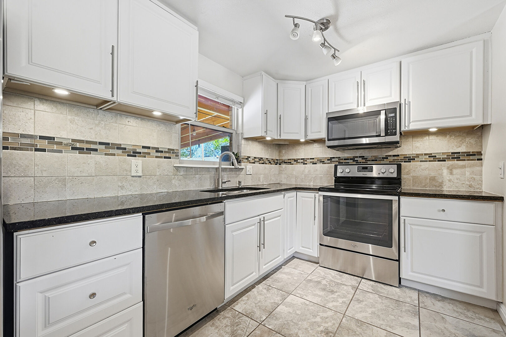 Baseboards Wall, Drywall, Natural Light, Stone Countertops, Tile Floor, Raised Cabinets