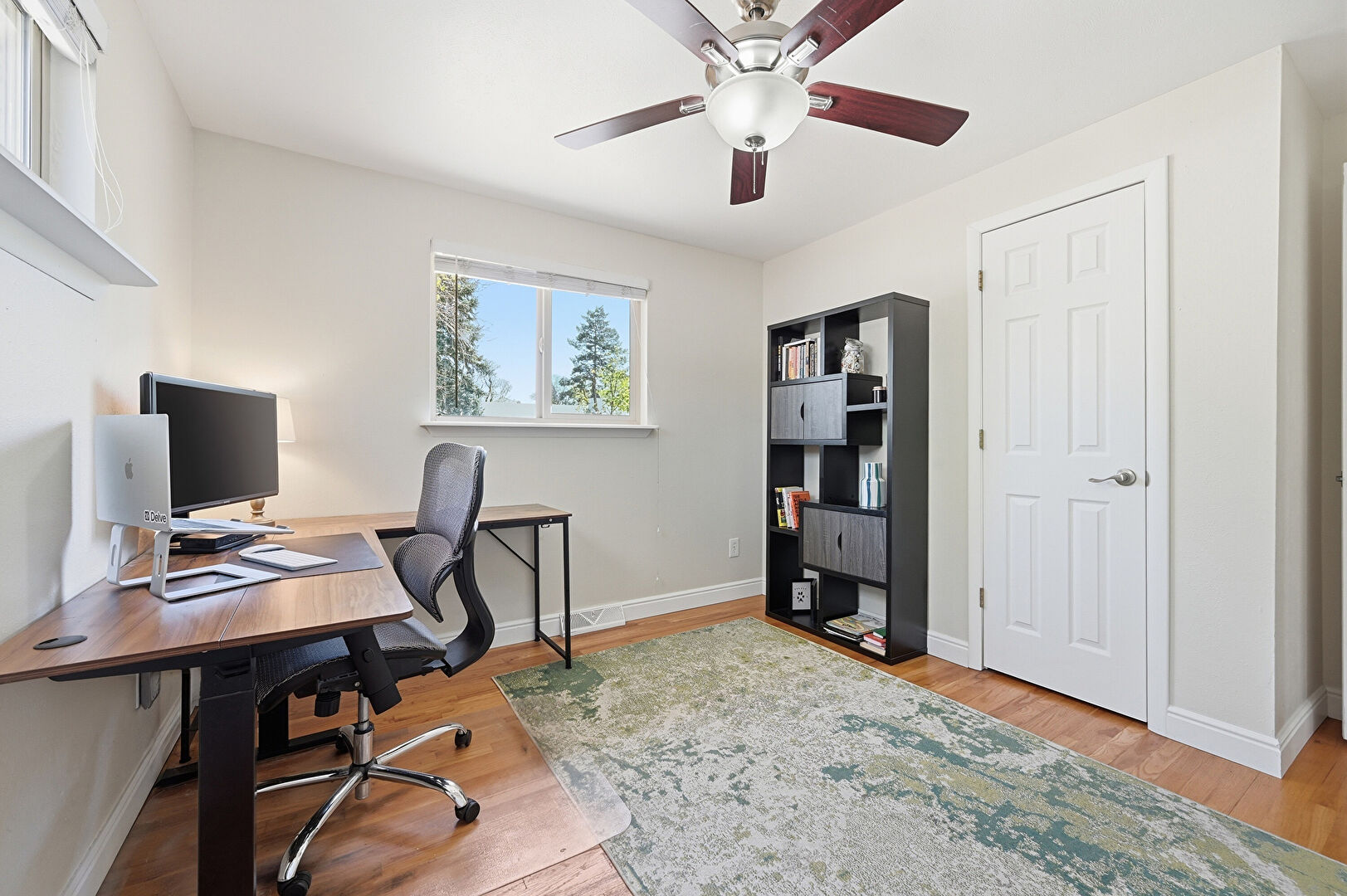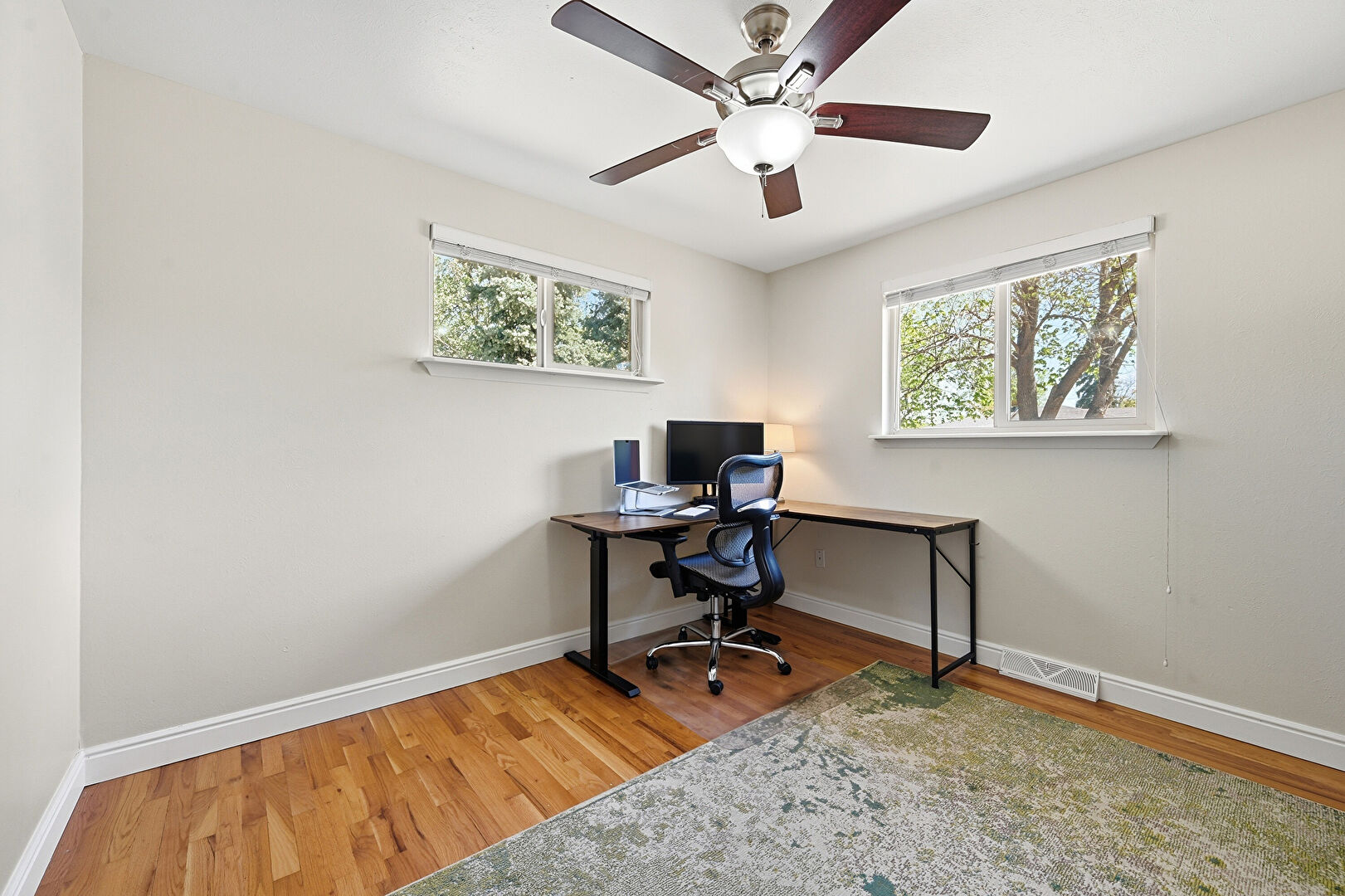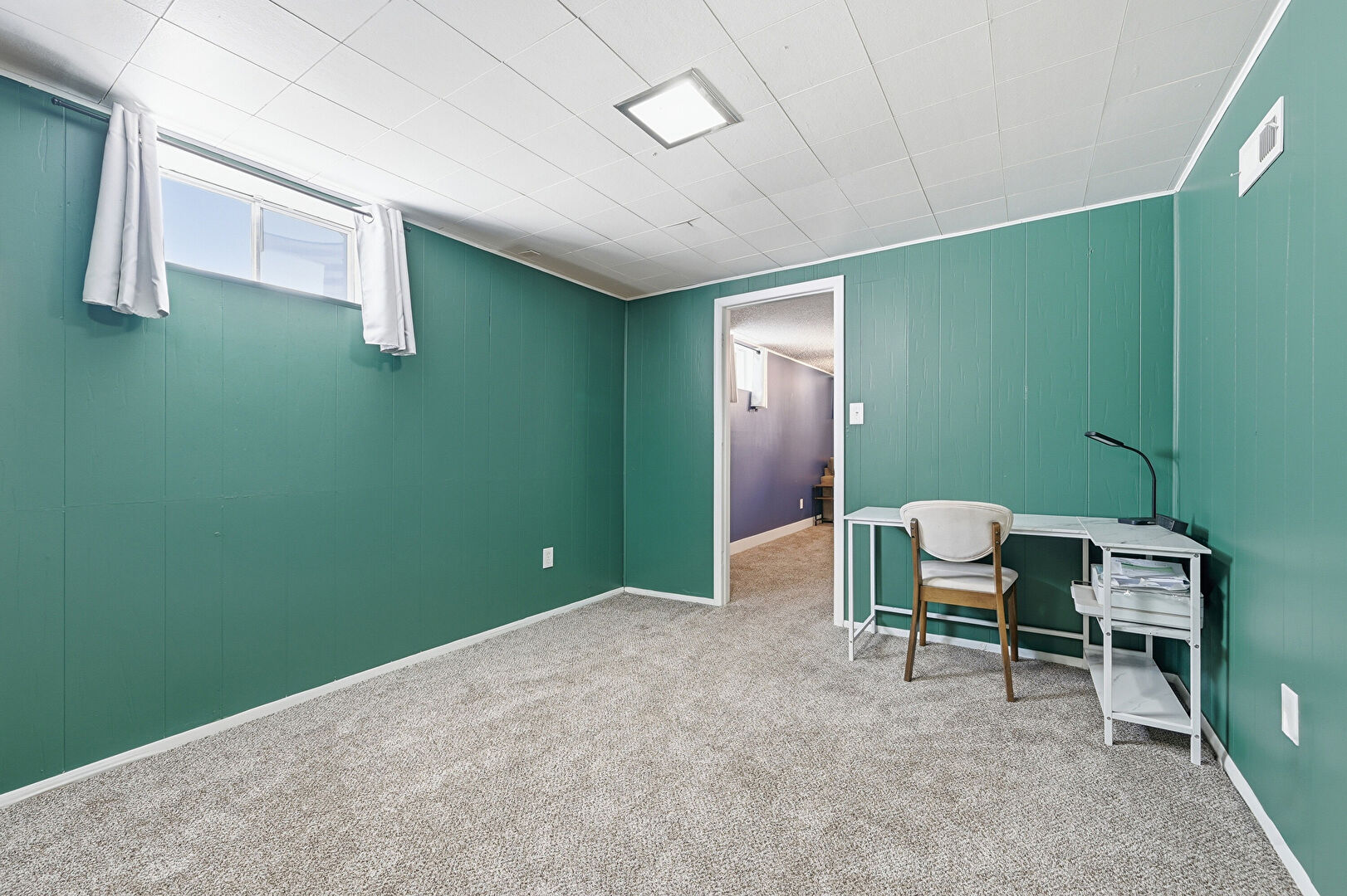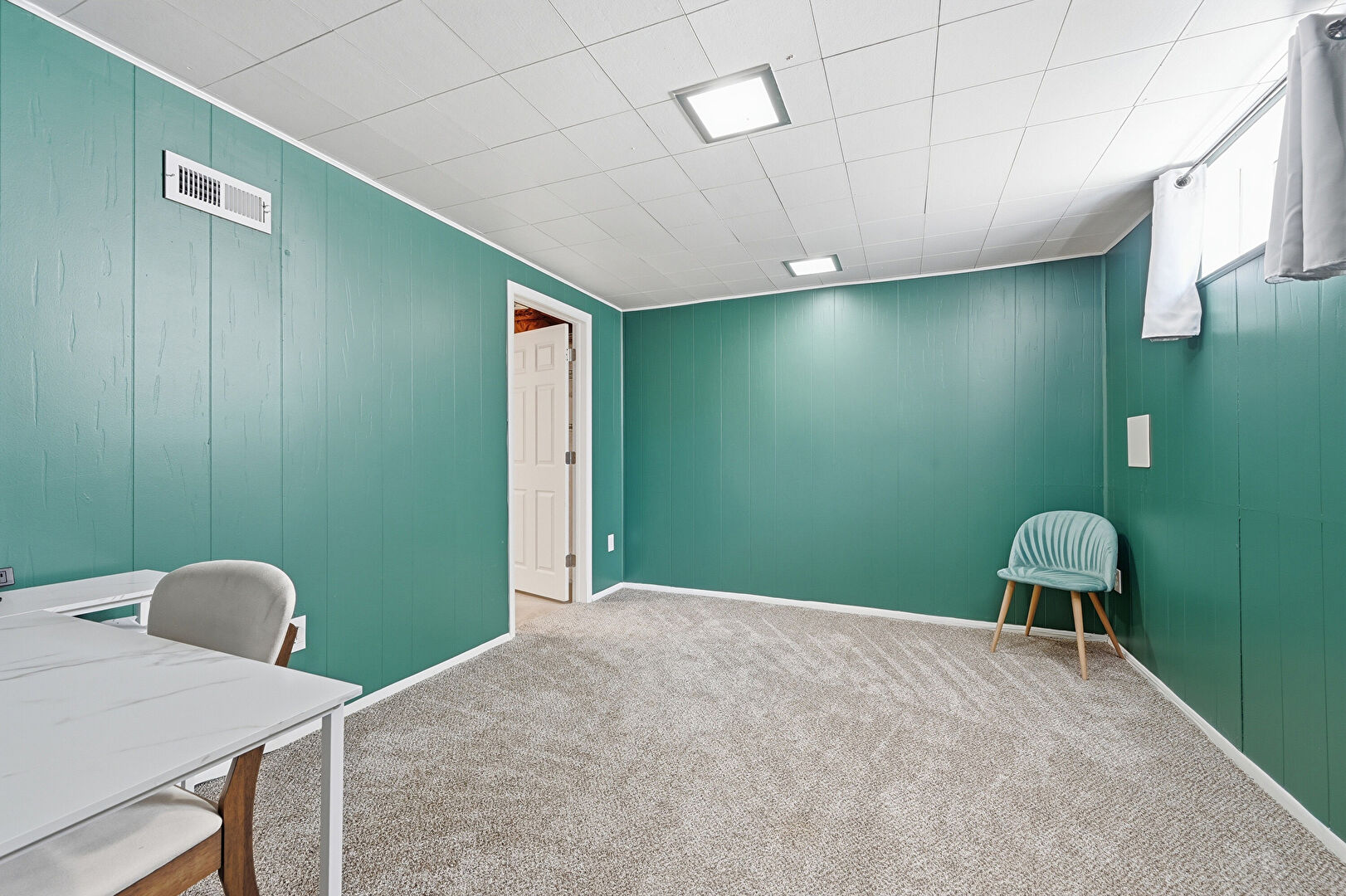 Baseboards Wall, Basement, Carpet, Ceiling Fan, Drywall, Natural Light, Office Area, Vent, Wood Finish Floor, Wood Wall, Ceiling Fan, Office Area, Vent