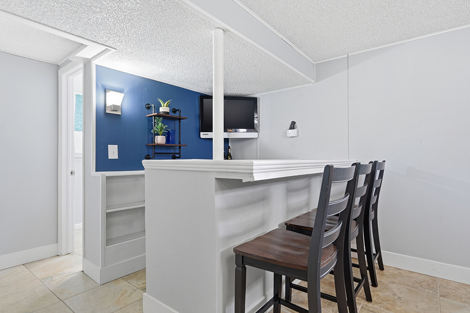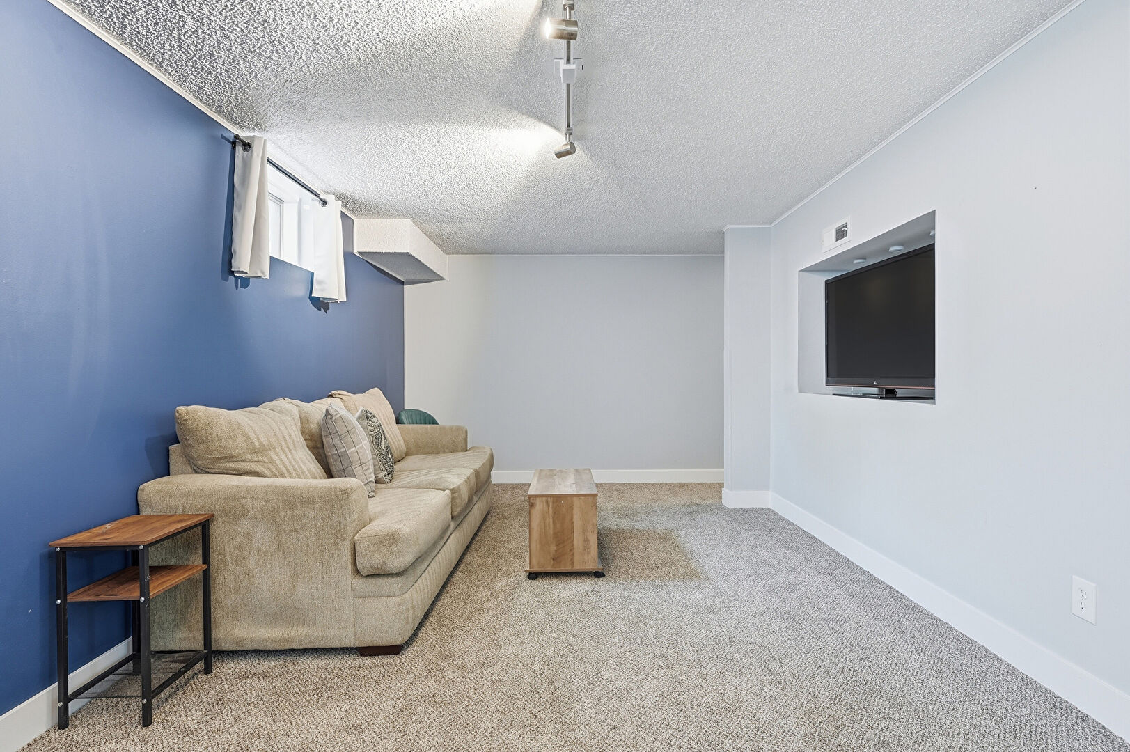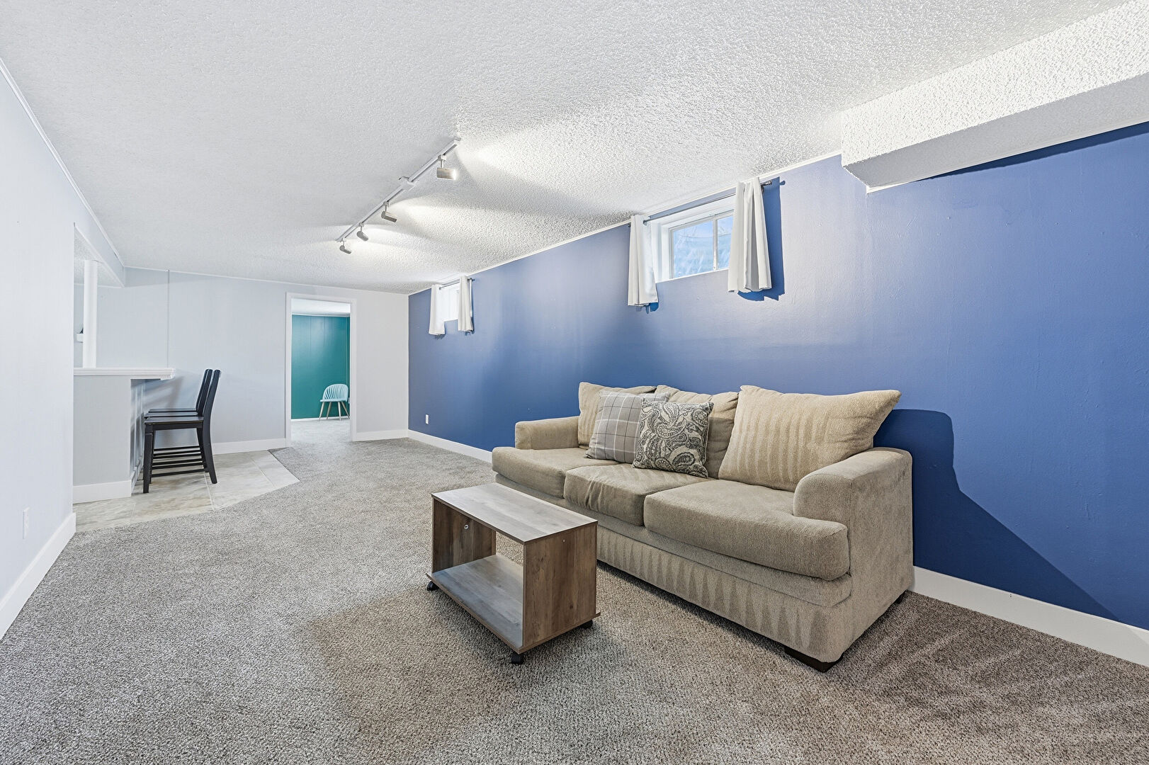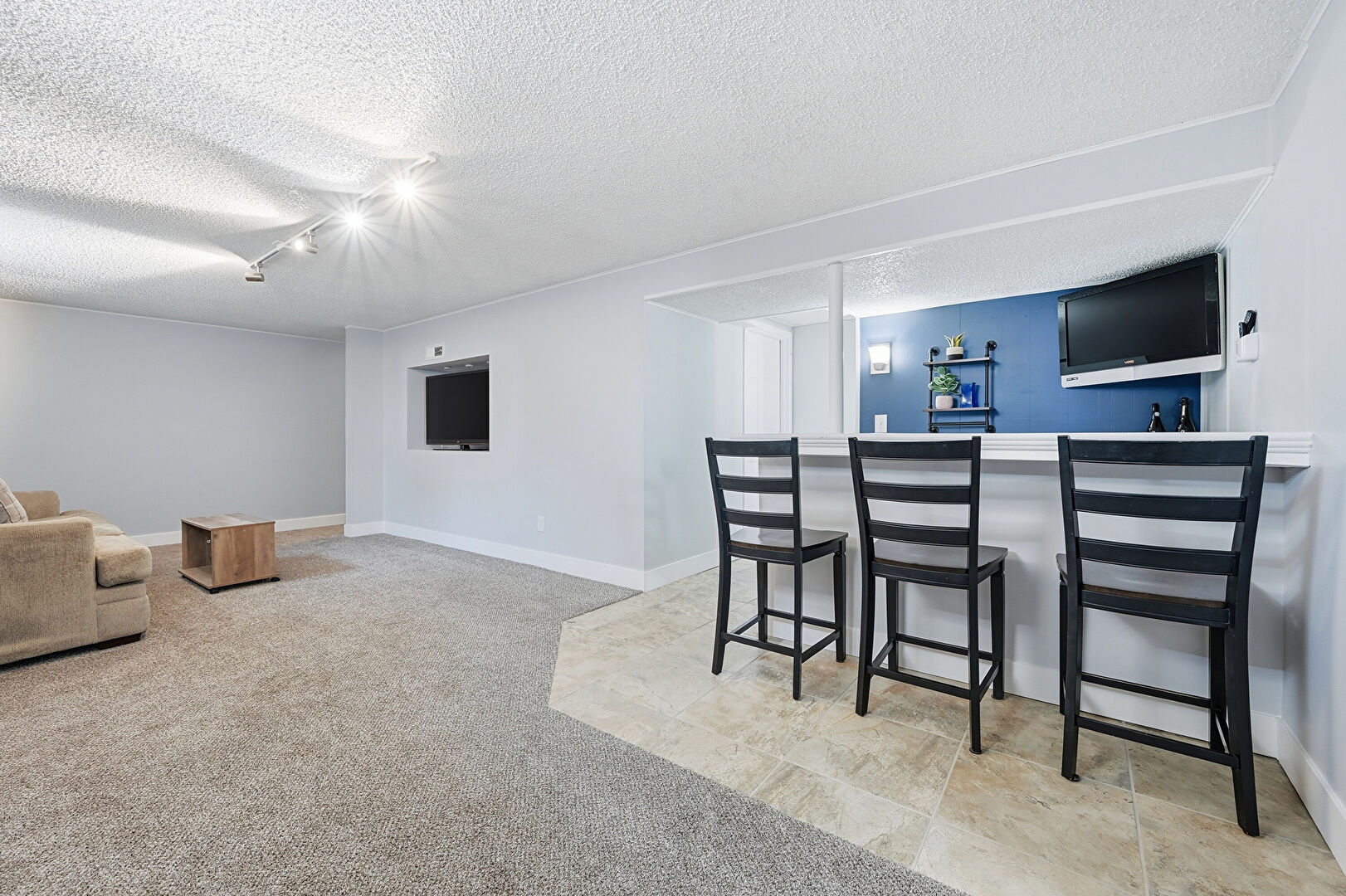 Baseboards Wall, Basement, Carpet, Drywall, Indoor Bar, Natural Light, Textured Ceiling, Tile Floor, Track Lighting, Basement, Natural Light, Textured Ceiling, Track Lighting
