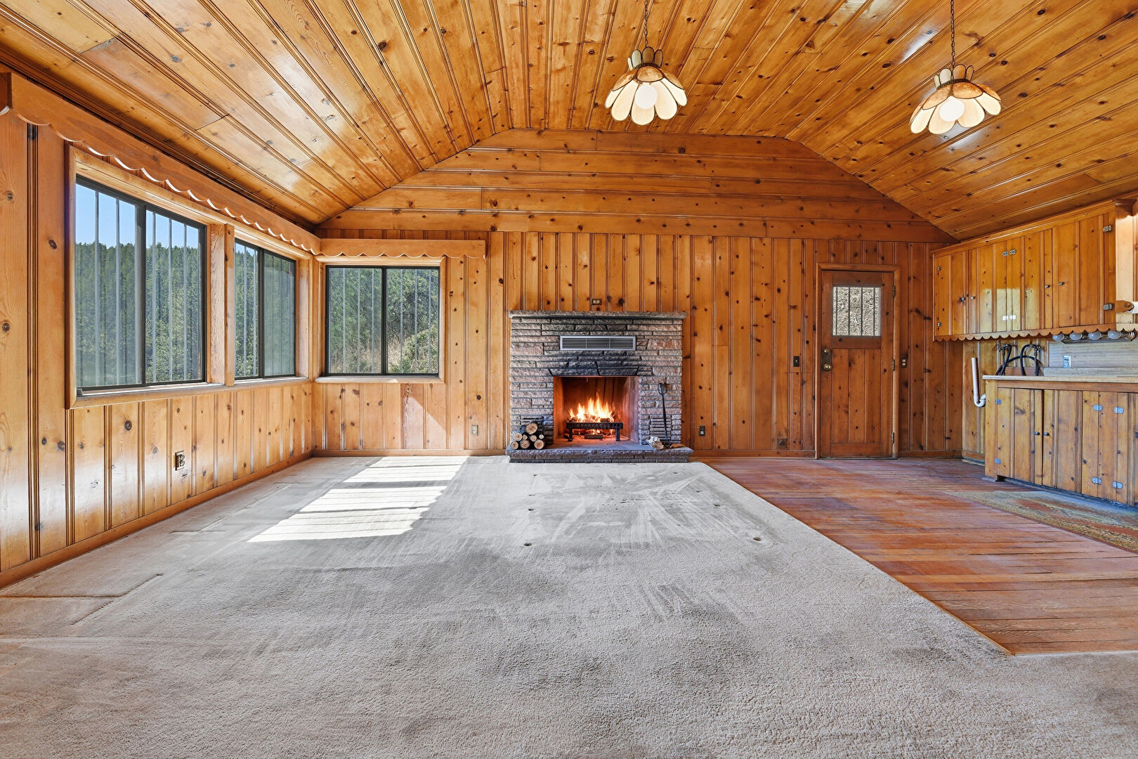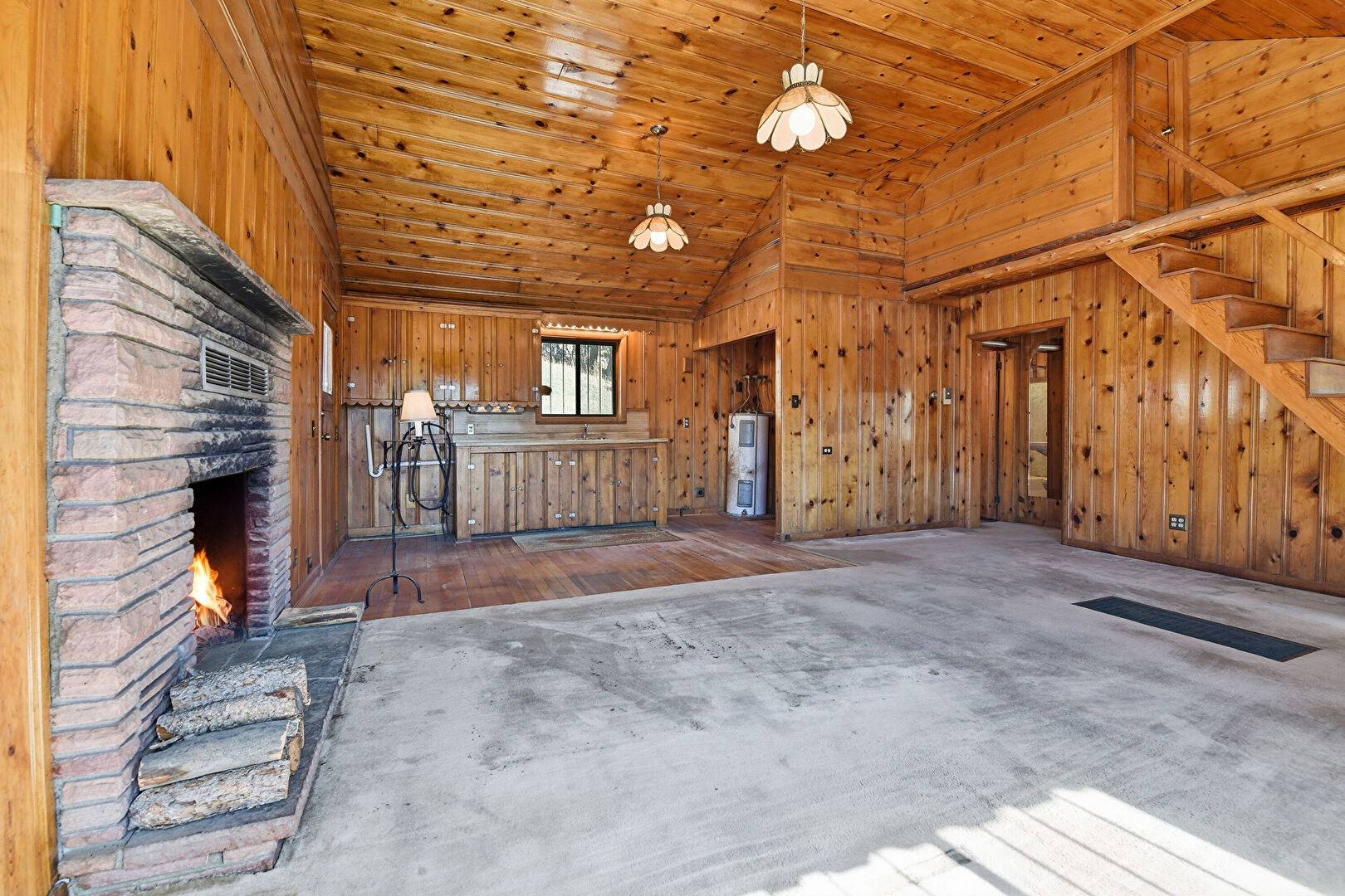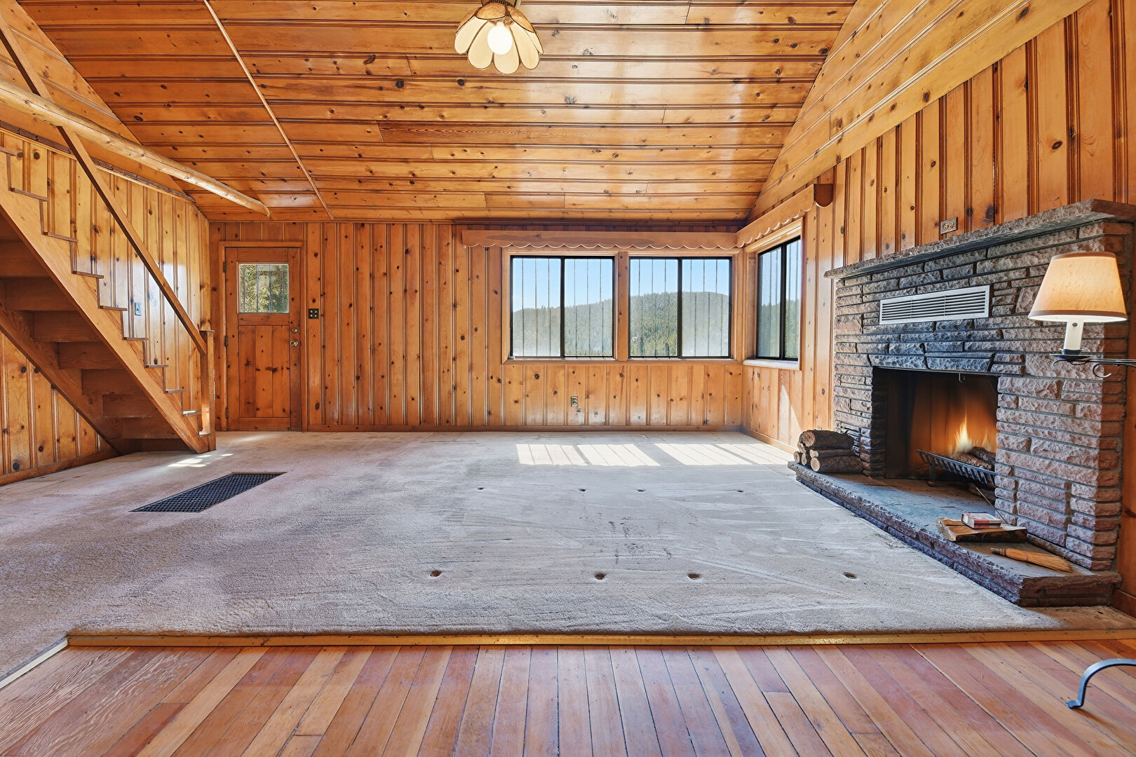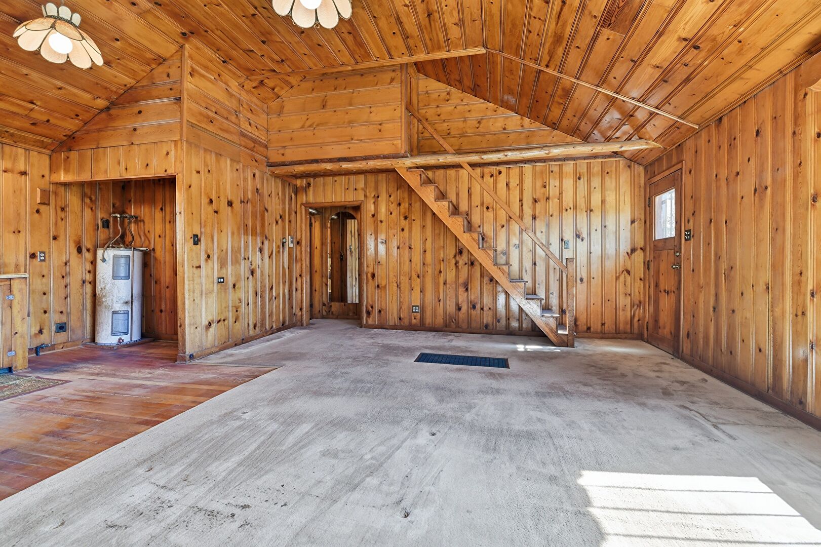 Baseboards Wall, Carpet, Cathedral Ceiling, Fireplace, High Ceiling, Natural Light, Stairs, Vaulted Ceiling, Vent, Water Heater, Wood Ceiling, Wood Finish Floor, Wood Wall, Carpet, High Ceiling, Natural Light, Vaulted Ceiling