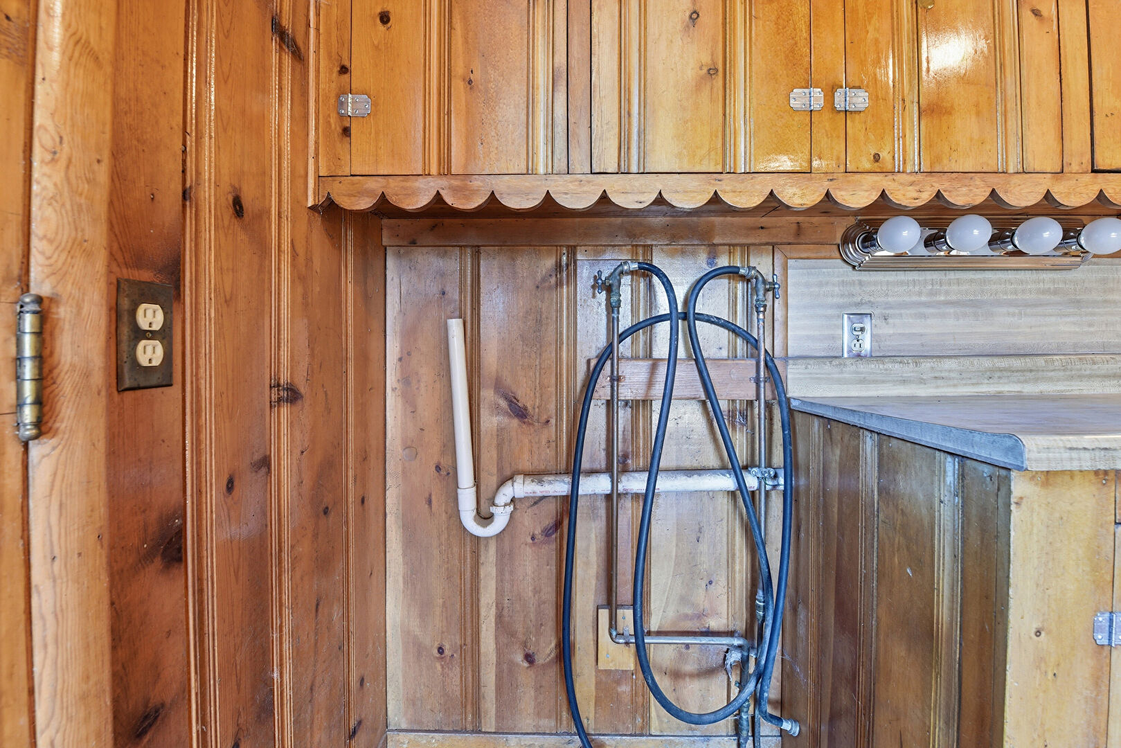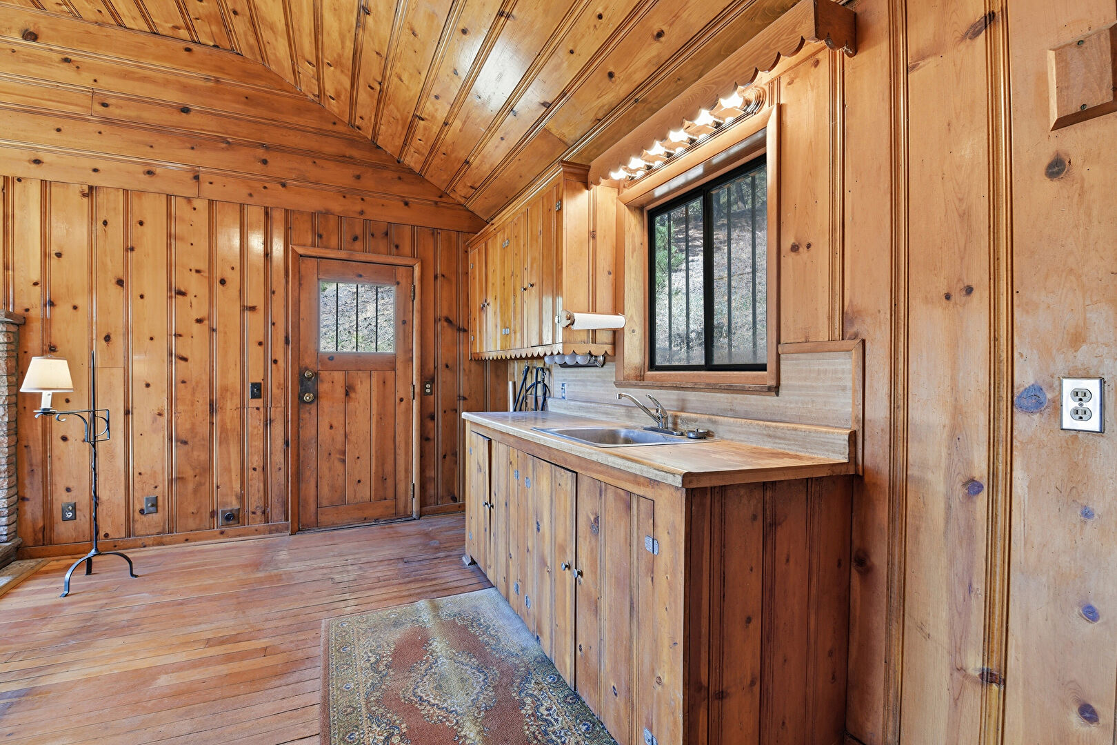 Baseboards Wall, Butcher Block Countertops, Cathedral Ceiling, Laundry, Natural Light, Pendant Lighting, Vaulted Ceiling, Visible Hinge Cabinets, Wood Ceiling, Wood Finish Floor, Wood Wall, Medium Brown Cabinets, Wood Ceiling