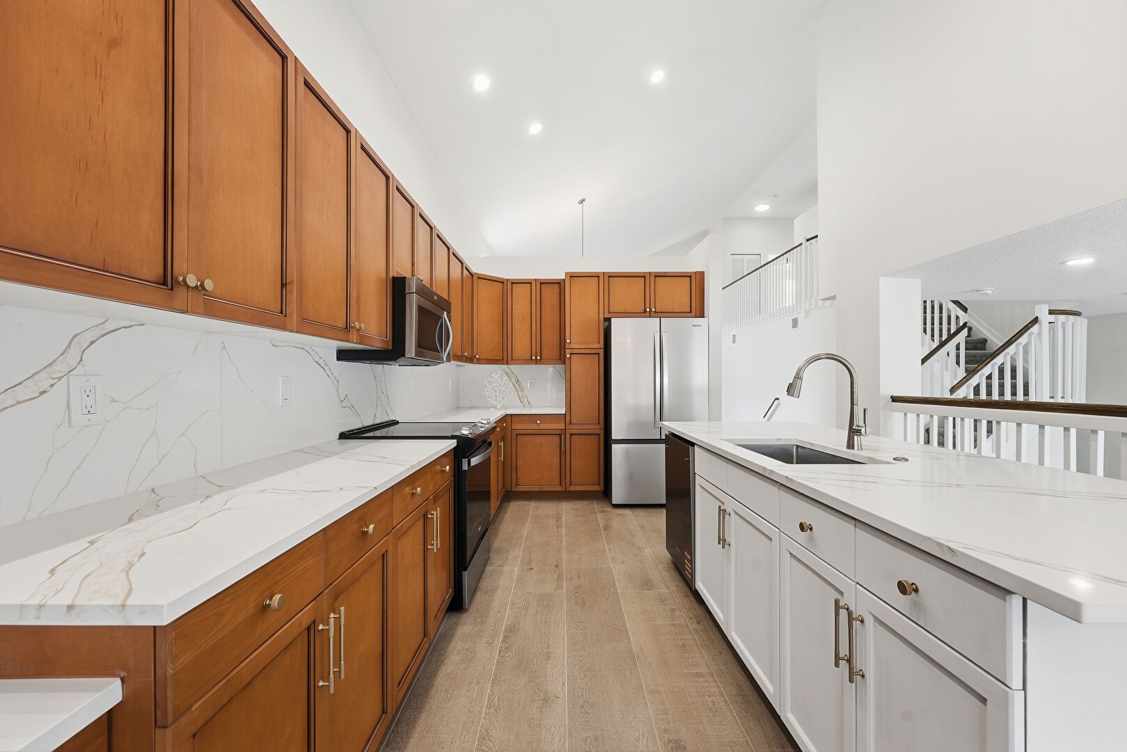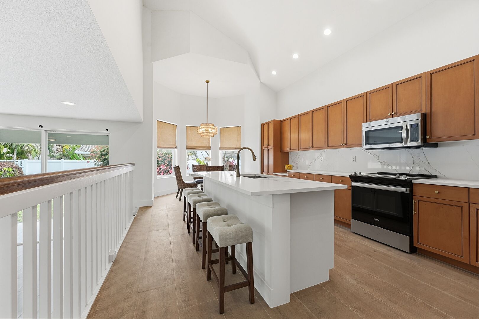 Baseboards Wall, Drywall, High Ceiling, Kitchen Bar, Kitchen Island, L Shaped Kitchen, Medium Brown Cabinets, Natural Light, Notable Chandelier, Office Area, Pendant Lighting, Recessed Lighting, Shaker Cabinets, Stone Countertops, Vaulted Ceiling, Wood Finish Floor, High Ceiling, Medium Brown Cabinets, Wood Finish Floor