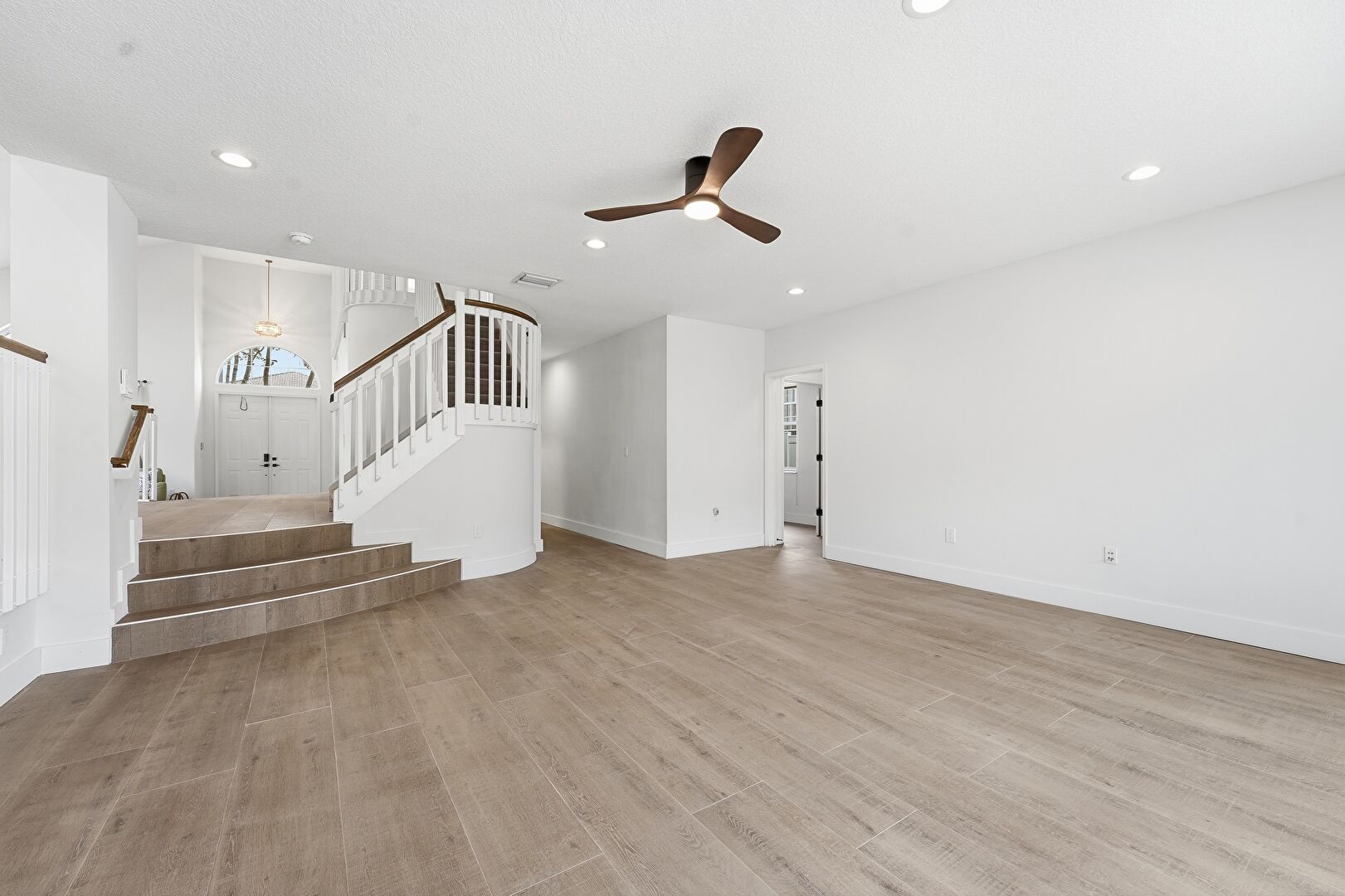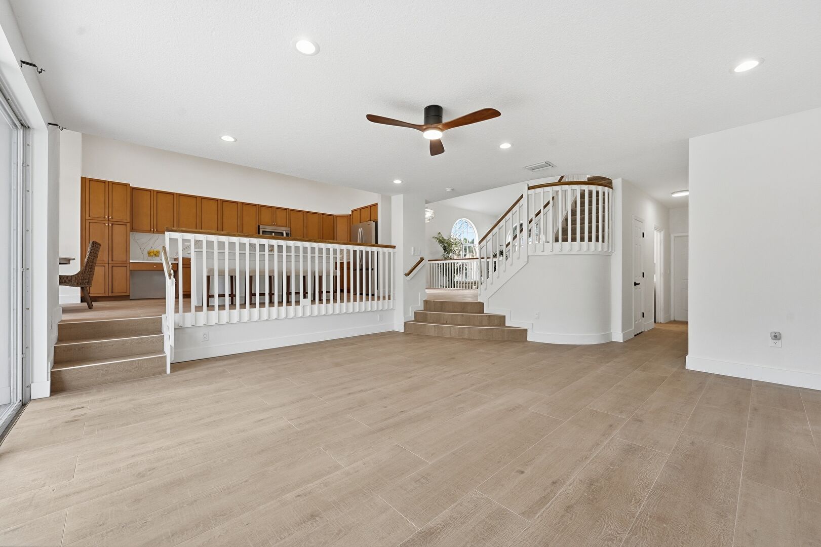 Baseboards Wall, Ceiling Fan, Drywall, Natural Light, Notable Chandelier, Recessed Lighting, Stairs, Vent, Wood Finish Floor, Baseboards Wall, Natural Light, Stairs, Vent, Wood Finish Floor