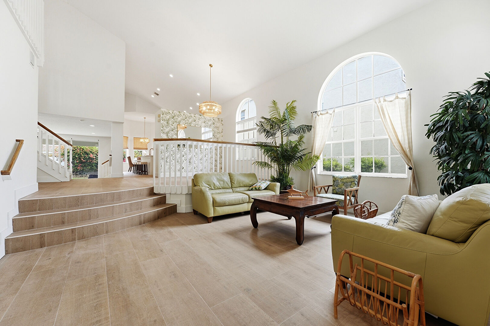 Baseboards Wall, Drywall, High Ceiling, Natural Light, Notable Chandelier, Stairs, Vaulted Ceiling, Wood Finish Floor, Drywall, Recessed Lighting