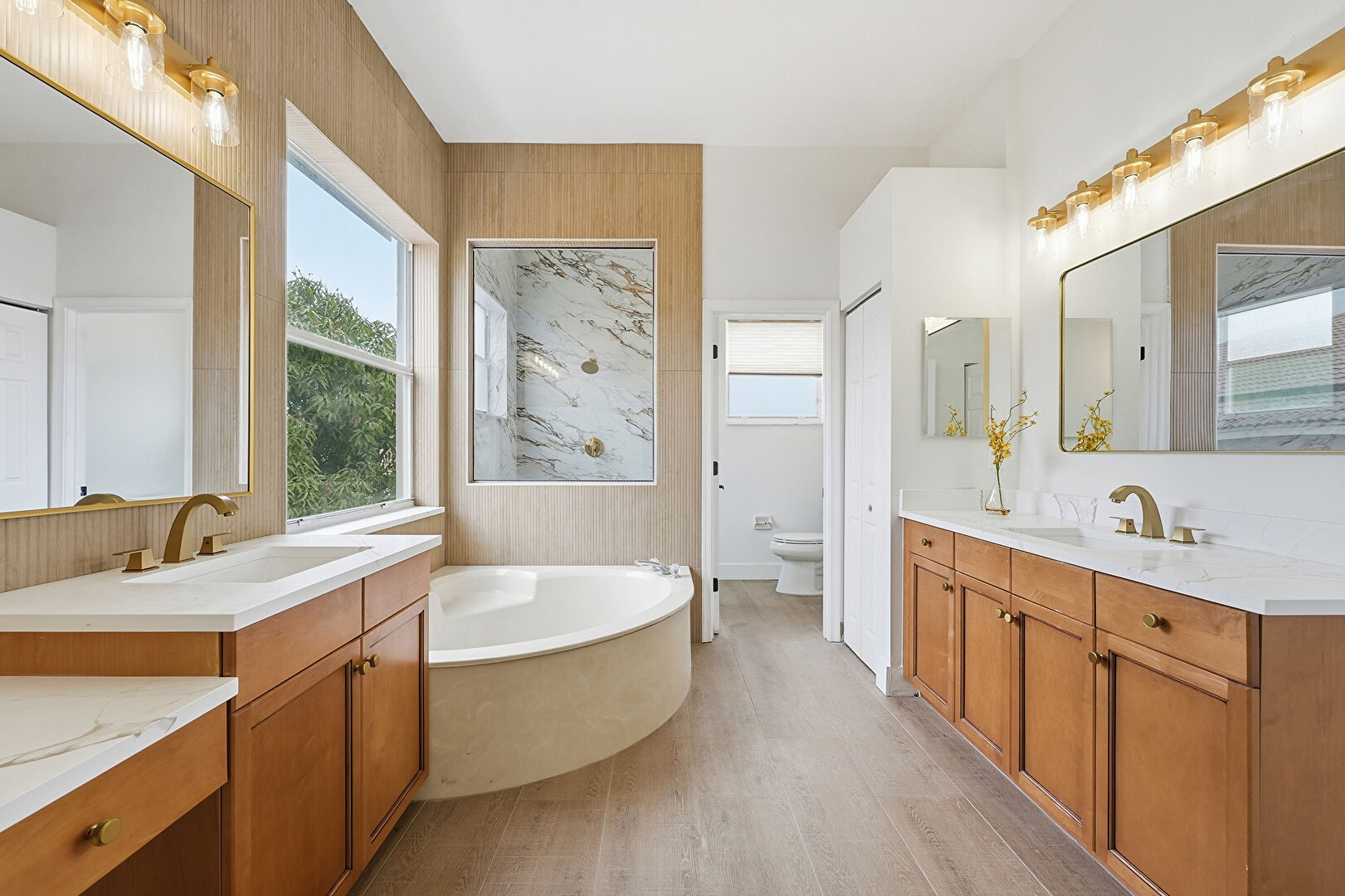 Full Bathroom, Natural Light, Tile Floor, Two Single Vanities, Water Closet, Wood Finish Floor, Wood Wall, Full Bathroom, Vanity