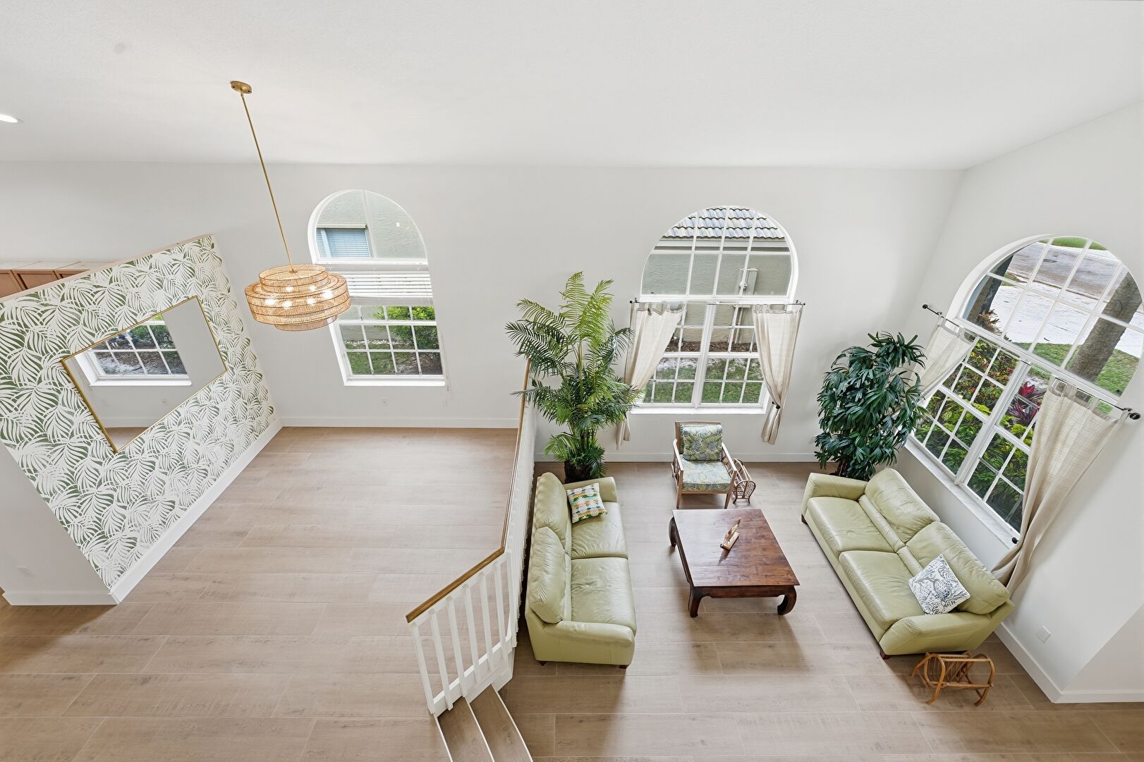 Accent Wall, Baseboards Wall, Drywall, High Ceiling, Natural Light, Notable Chandelier, Recessed Lighting, Stairs, Vaulted Ceiling, Wood Finish Floor, Baseboards Wall, Notable Chandelier, Wallpaper Wall