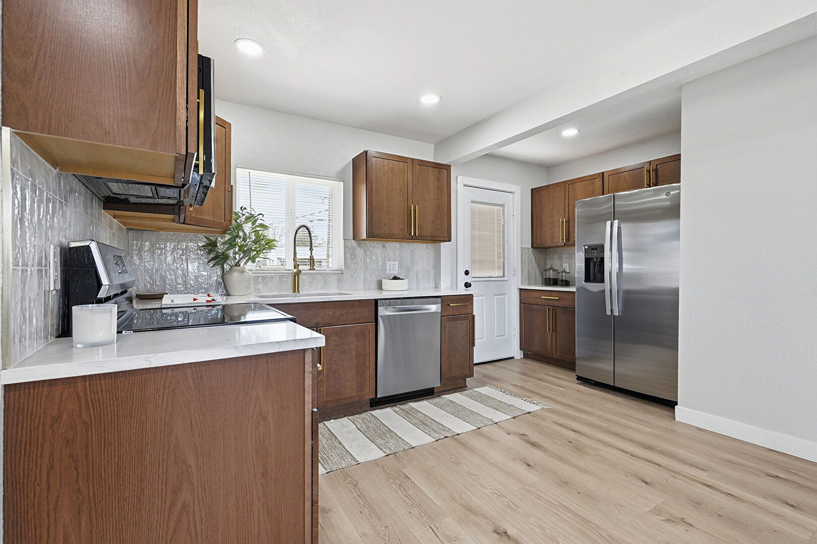 Baseboards Wall, Drywall, Natural Light, U Shaped Kitchen, Wood Finish Floor, Recessed Lighting