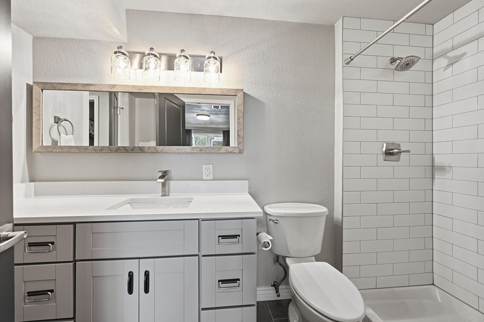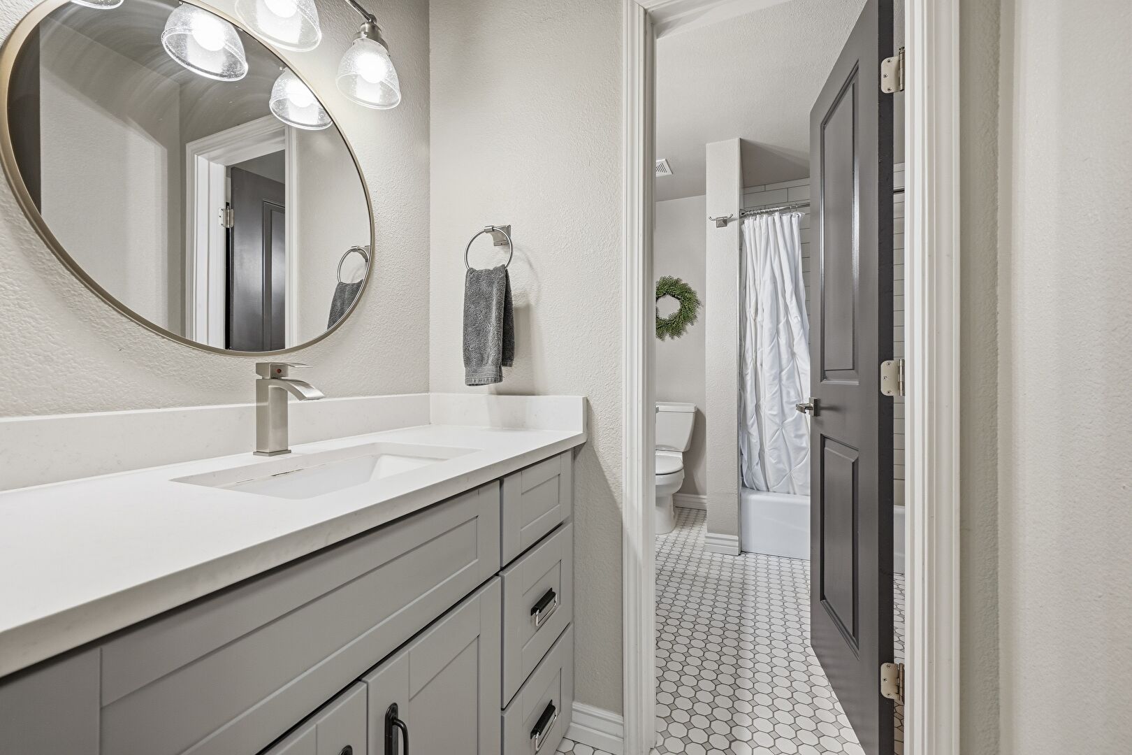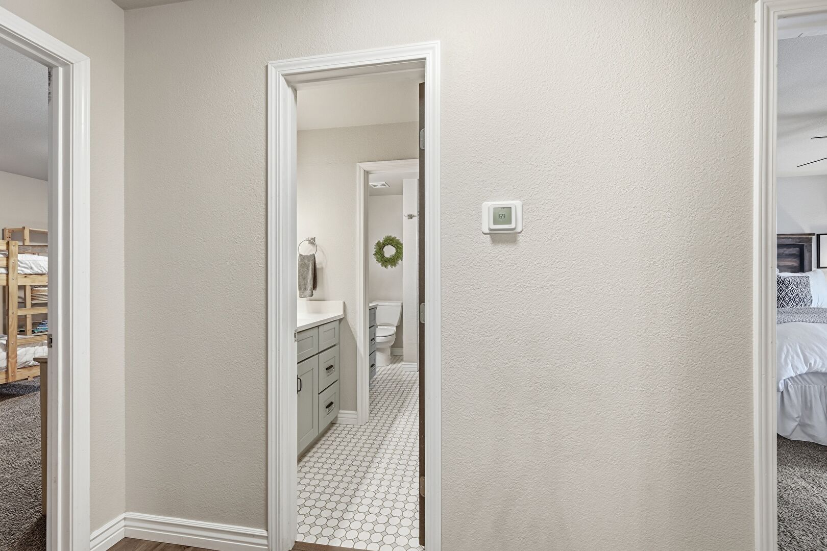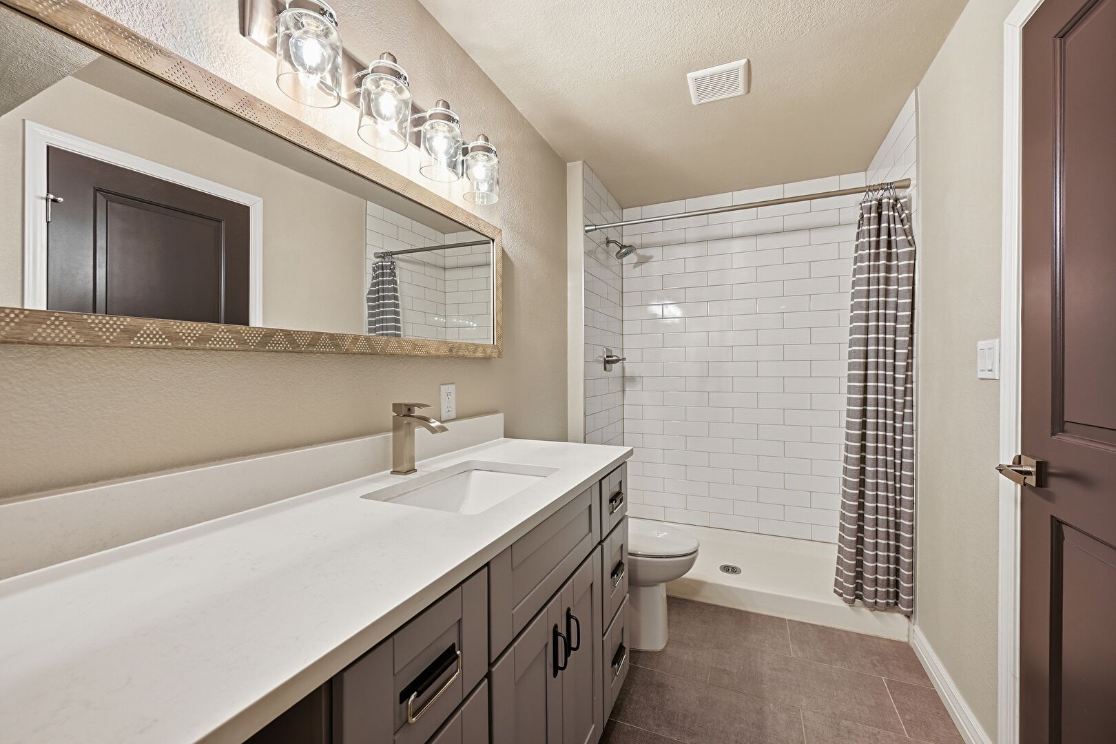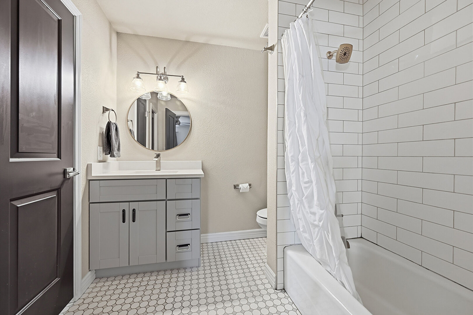 Baseboards Wall, Ceiling Fan, Combined Bath Shower, Drywall, Ensuite Bathroom, Full Bathroom, Half Bathroom, Textured Ceiling, Textured Wall, Vanity, Vent, Wood Finish Floor, Baseboards Wall, Textured Wall, Tile Floor