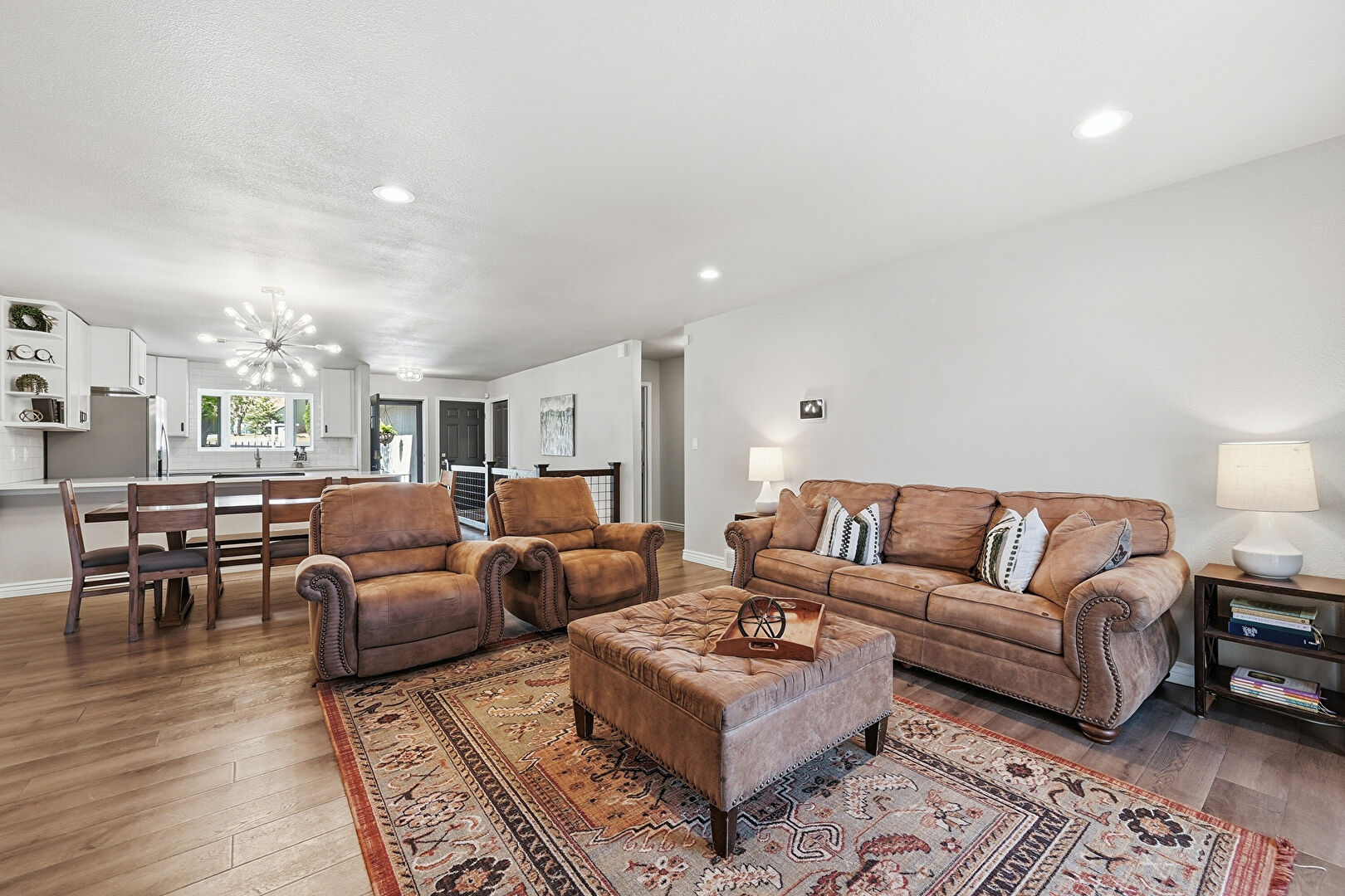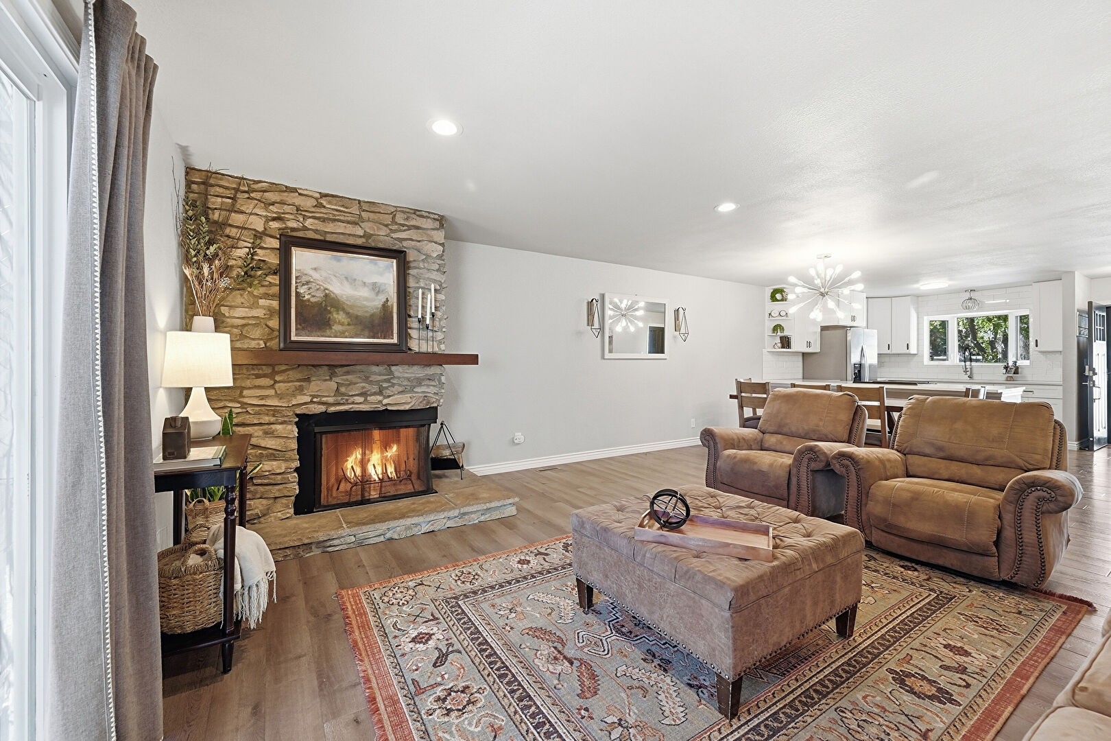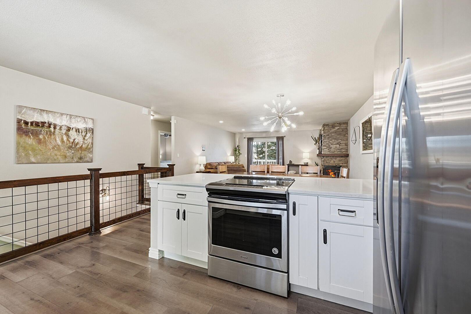 Baseboards Wall, Drywall, Fireplace, L Shaped Kitchen, Natural Light, Notable Chandelier, One Wall Kitchen, Recessed Lighting, Wood Finish Floor, Baseboards Wall, Drywall, Fireplace