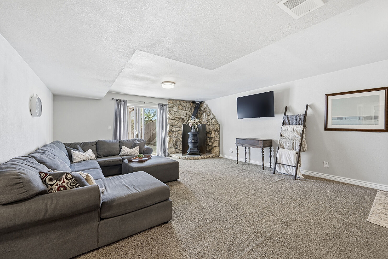 Baseboards Wall, Basement, Carpet, Drywall, Natural Light, Stairs, Textured Ceiling, Vent, Wood Stove, Baseboards Wall, Basement, Drywall