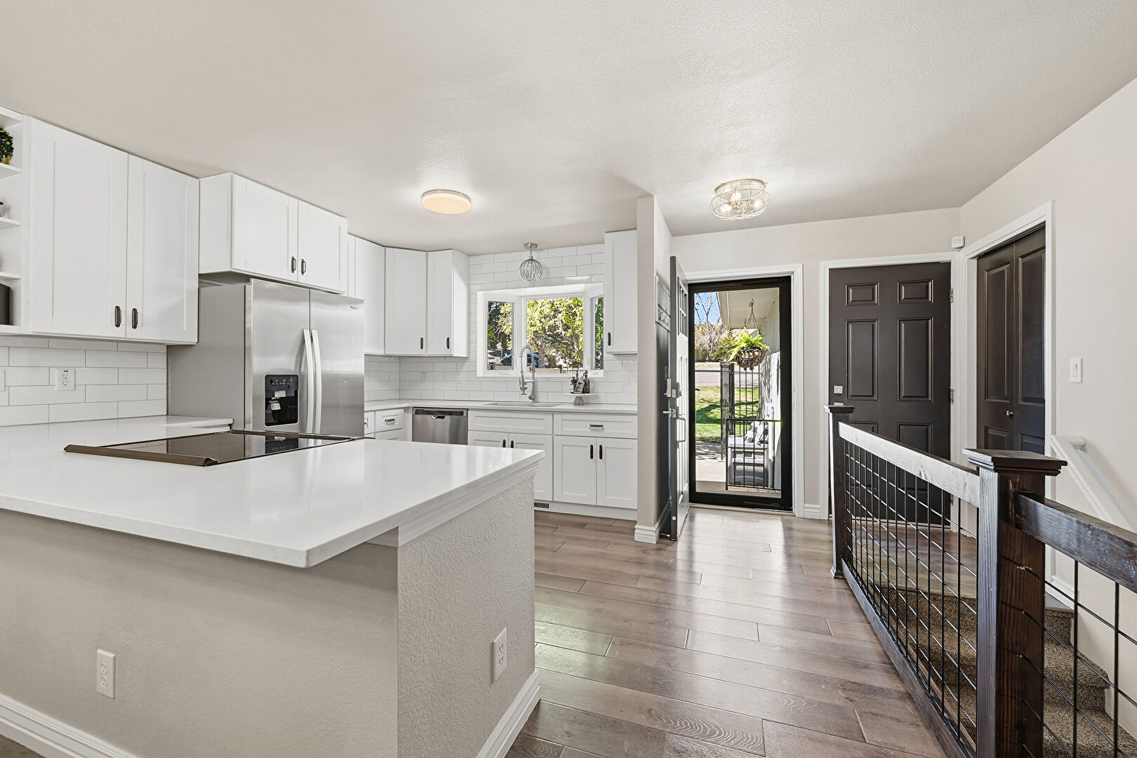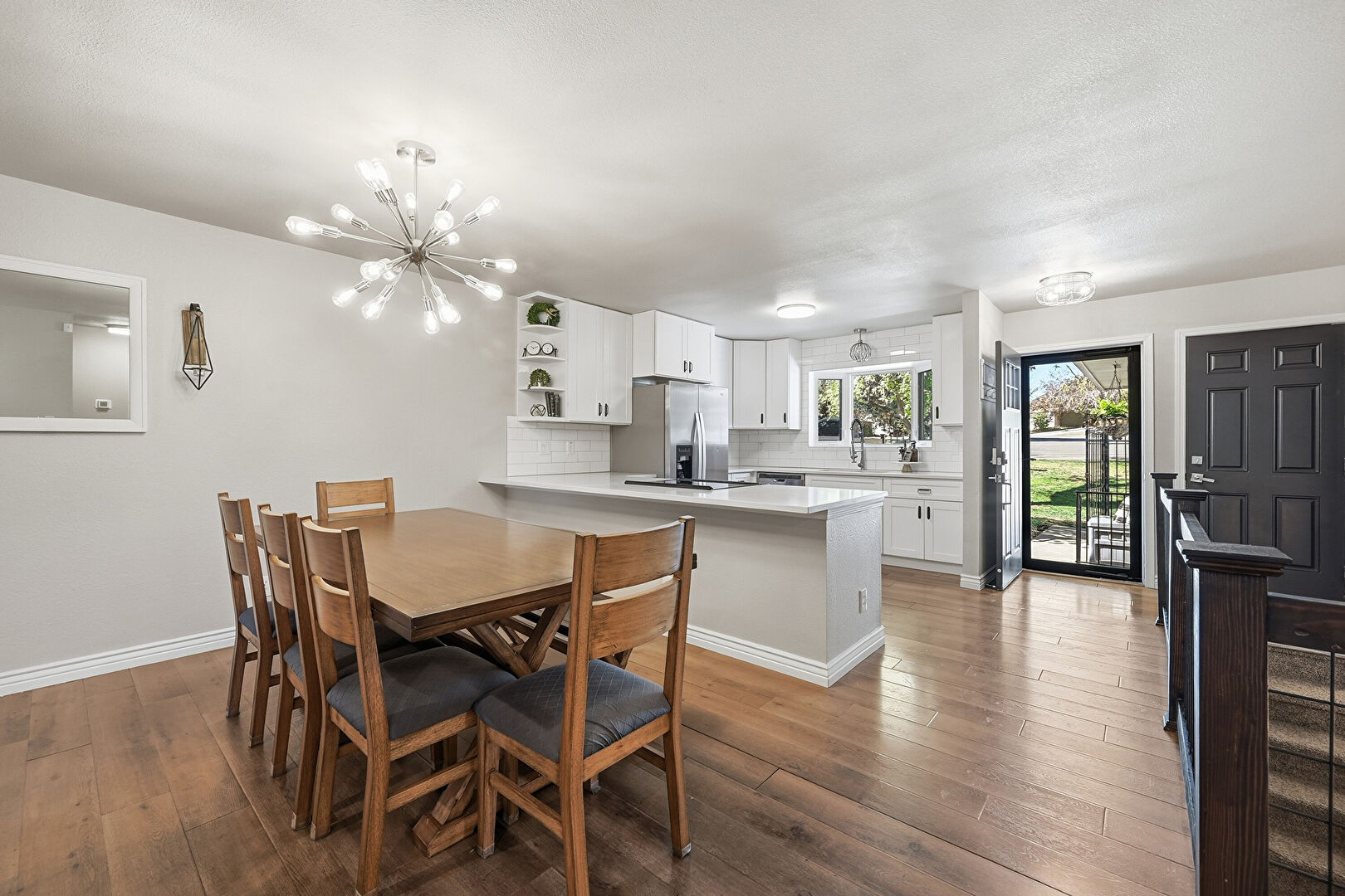 Baseboards Wall, Kitchen Peninsula, Natural Light, Notable Chandelier, Open Shelves, Opens To Living Area, Recessed Lighting, Shaker Cabinets, Stone Countertops, Wood Finish Floor, Drywall