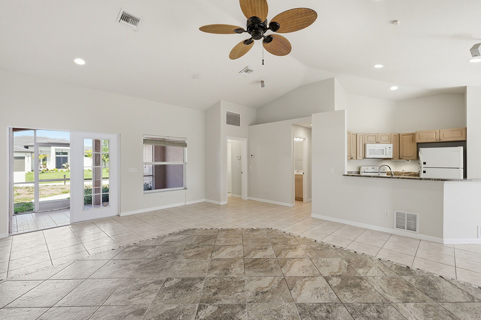 Baseboards Wall, Ceiling Fan, Drywall, French Doors, High Ceiling, Inlaid Floor, Natural Light, Recessed Lighting, Tile Floor, Vaulted Ceiling, Vent, Drywall, High Ceiling, Tile Floor