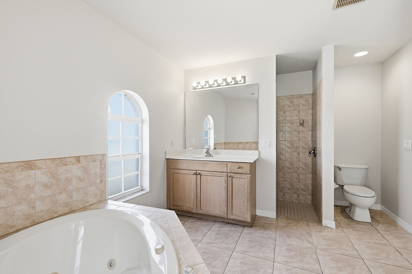 Baseboards Wall, Closet, Drywall, Full Bathroom, Natural Light, Recessed Lighting, Tile Floor, Vanity, Vent, Drywall, Full Bathroom, Tile Floor, Vanity
