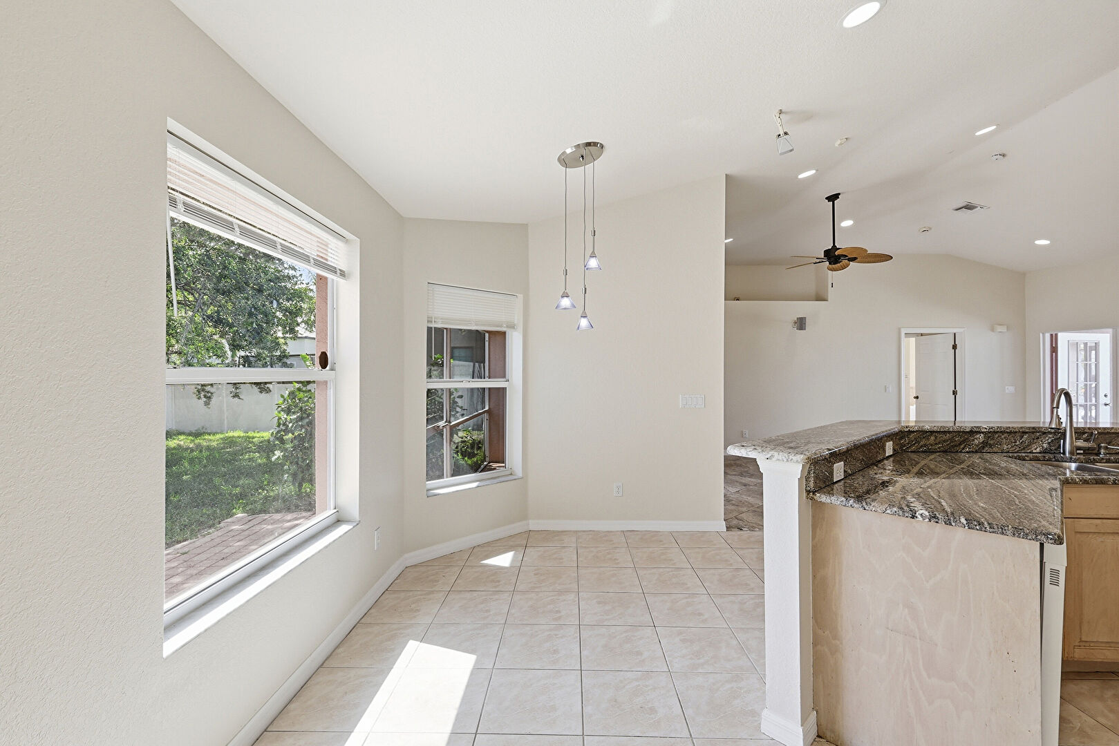 Baseboards Wall, Ceiling Fan, Drywall, High Ceiling, Kitchen Bar, Kitchen Peninsula, Natural Light, Opens To Living Area, Pendant Lighting, Raised Cabinets, Recessed Lighting, Stone Countertops, Tile Floor, U Shaped Kitchen, Vaulted Ceiling, Vent, Ceiling Fan, High Ceiling, Raised Cabinets, Stone Countertops, Vaulted Ceiling