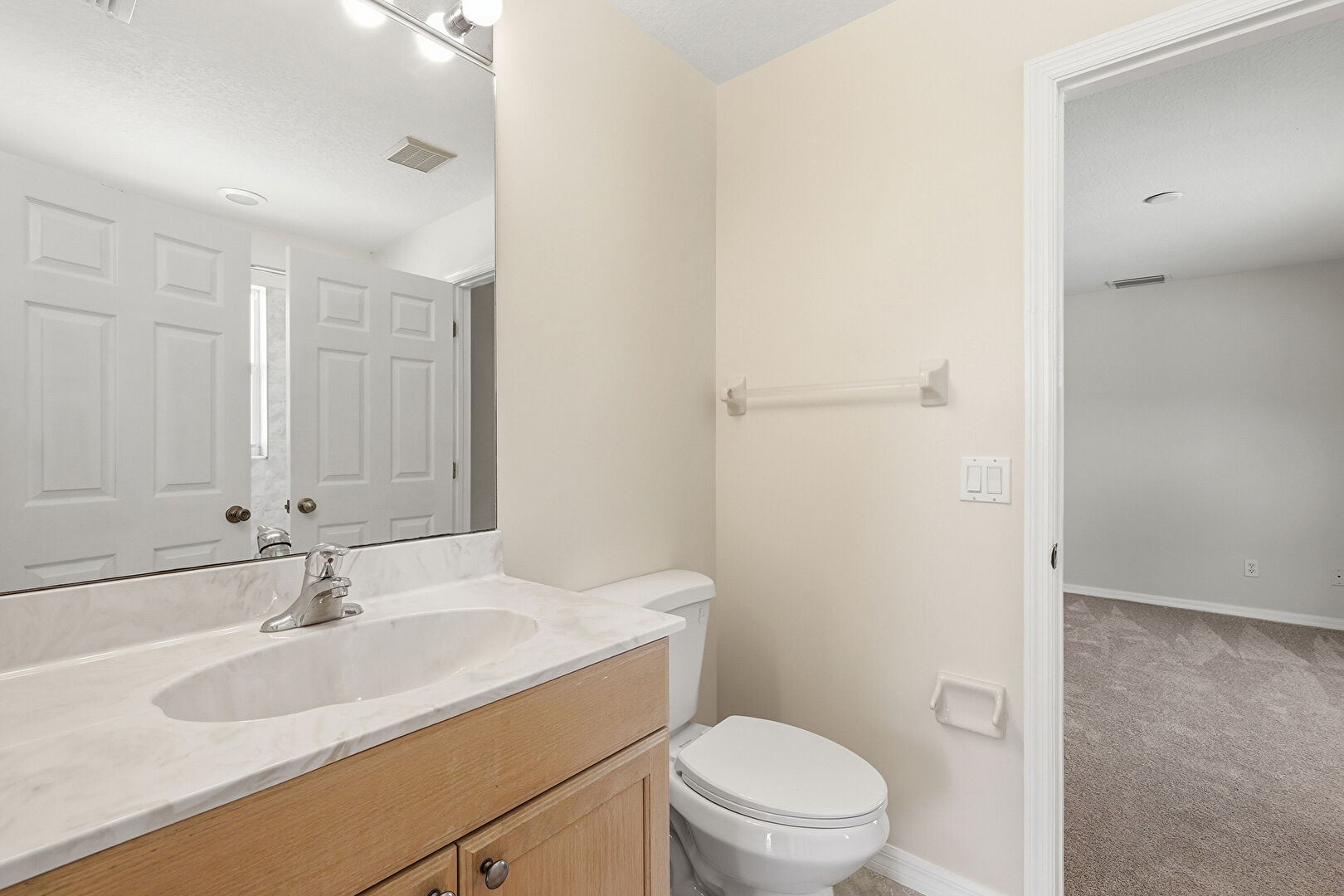 Baseboards Wall, Carpet, Combined Bath Shower, Drywall, Full Bathroom, Half Bathroom, Natural Light, Vanity, Vent, Baseboards Wall, Half Bathroom, Natural Light, Vanity