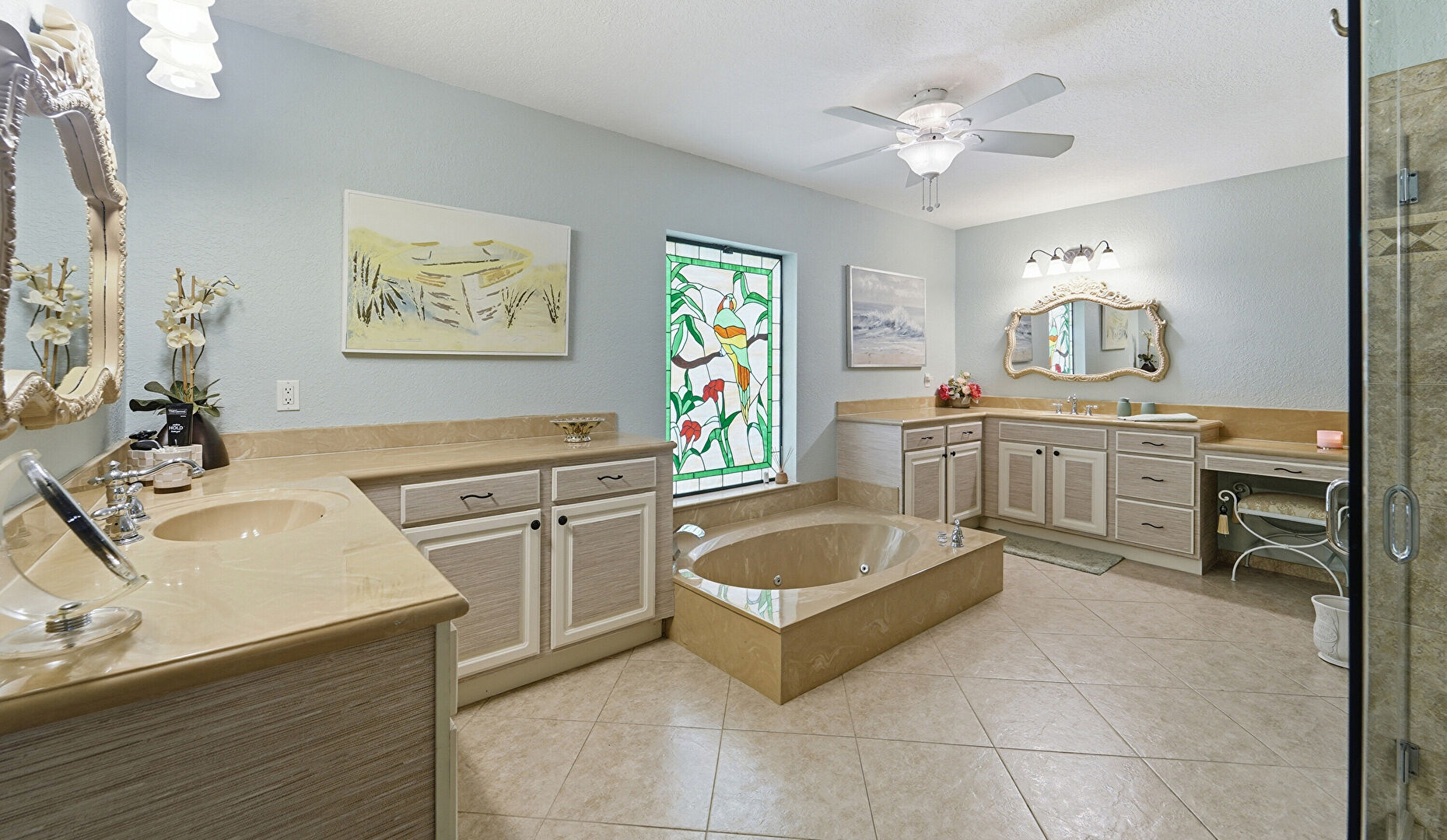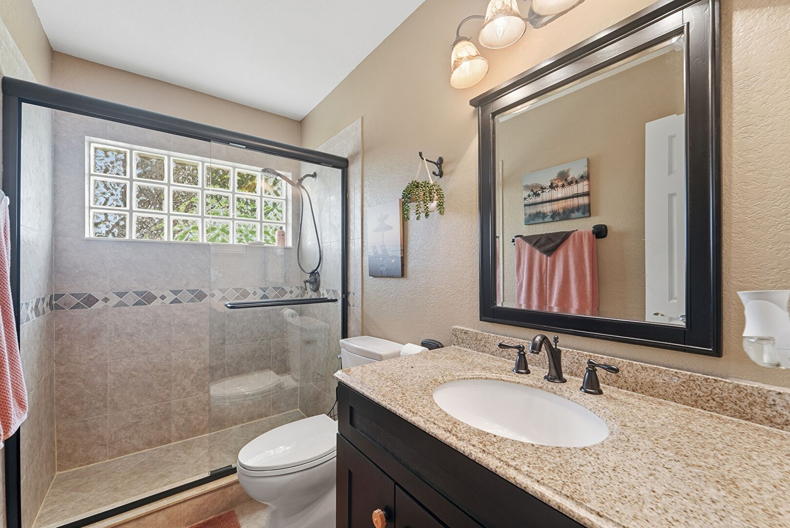 Full Bathroom, Textured Wall, Vanity, Natural Light