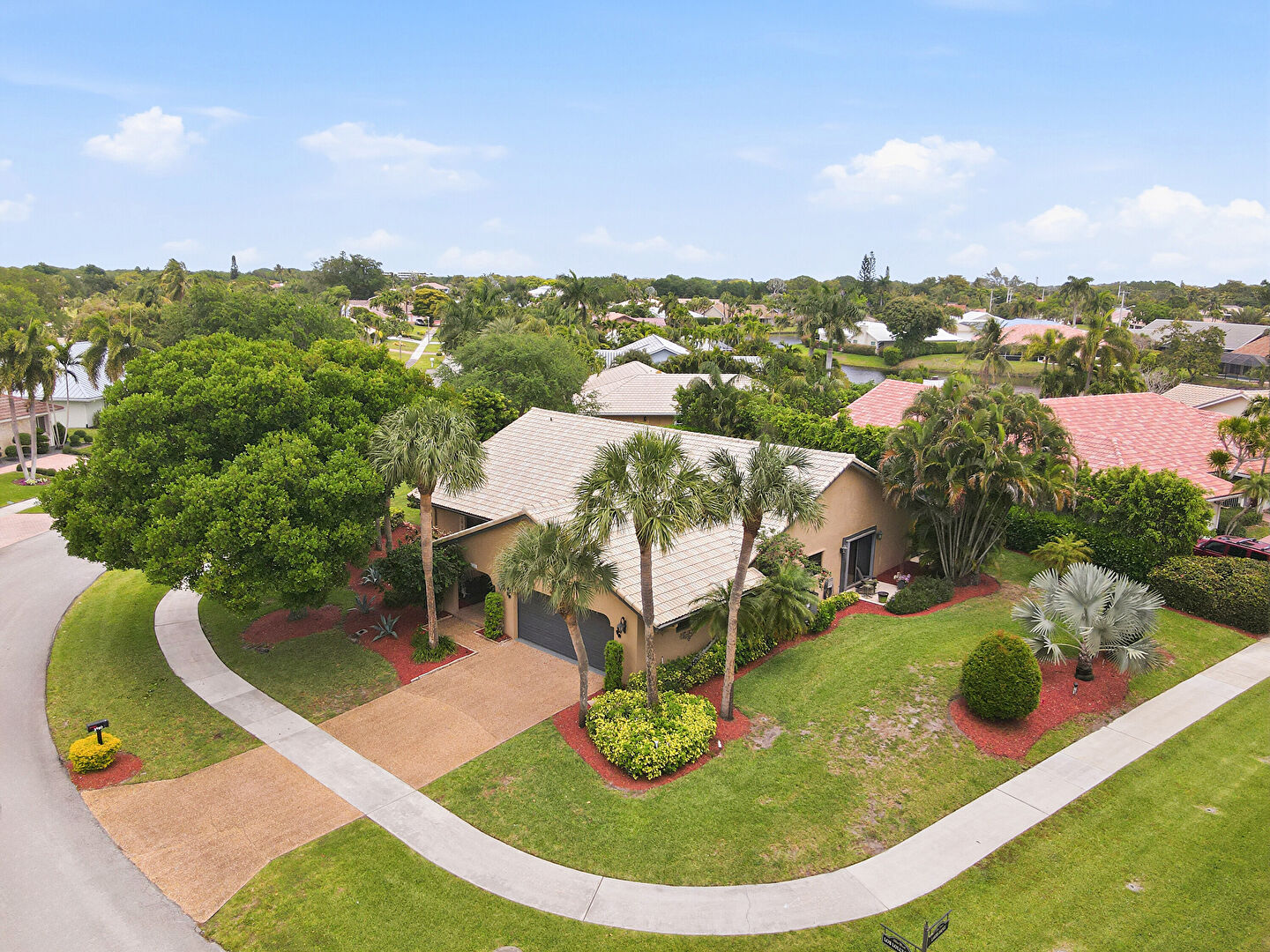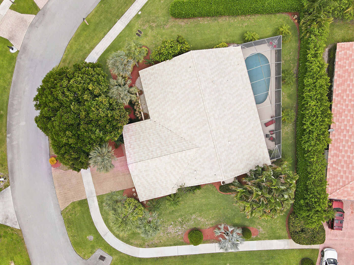 Downspout, Driveway, Gutters, Lawn, Stucco Siding, Tile Roof, Downspout, Driveway, Lawn, Tile Roof