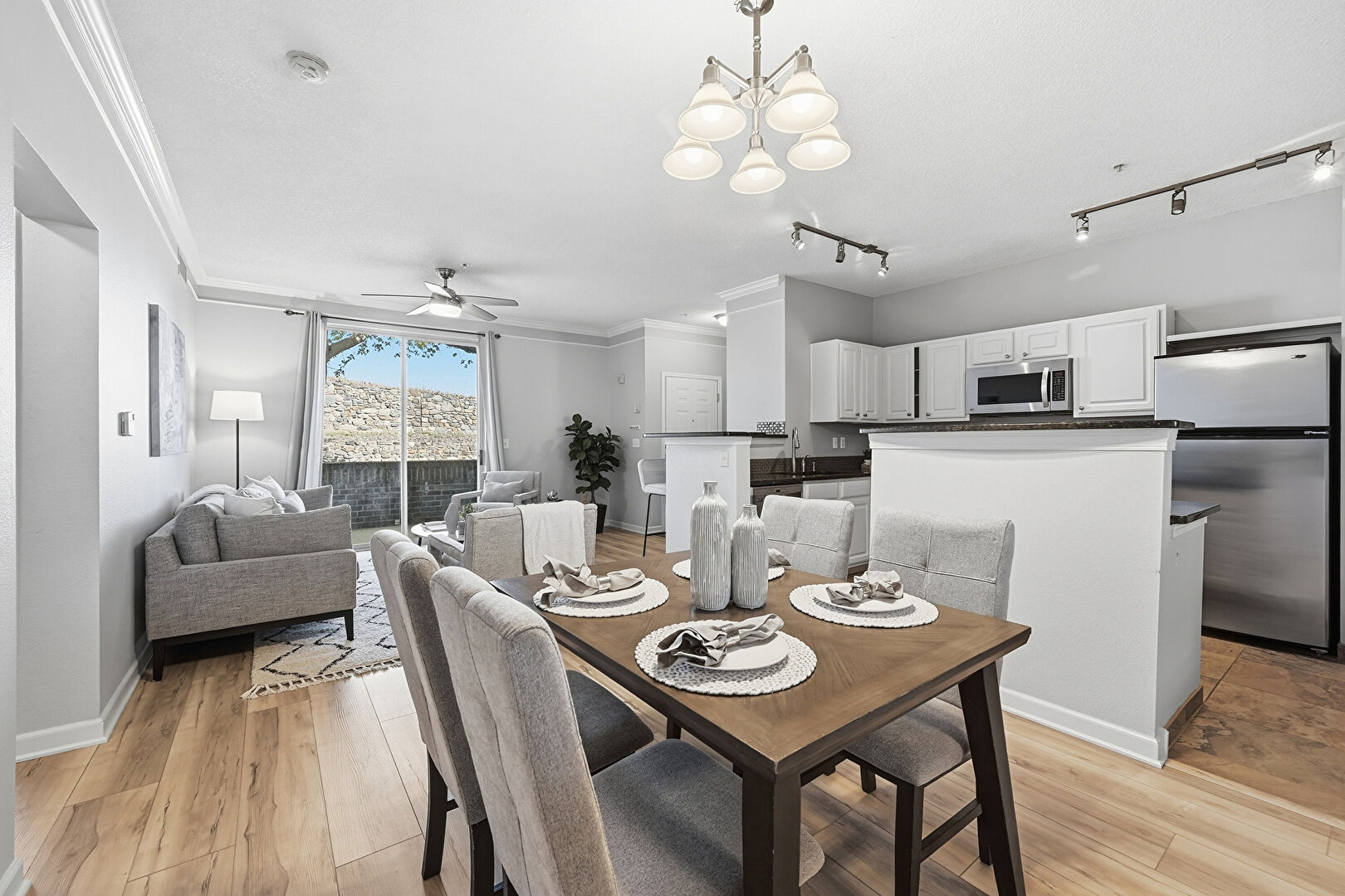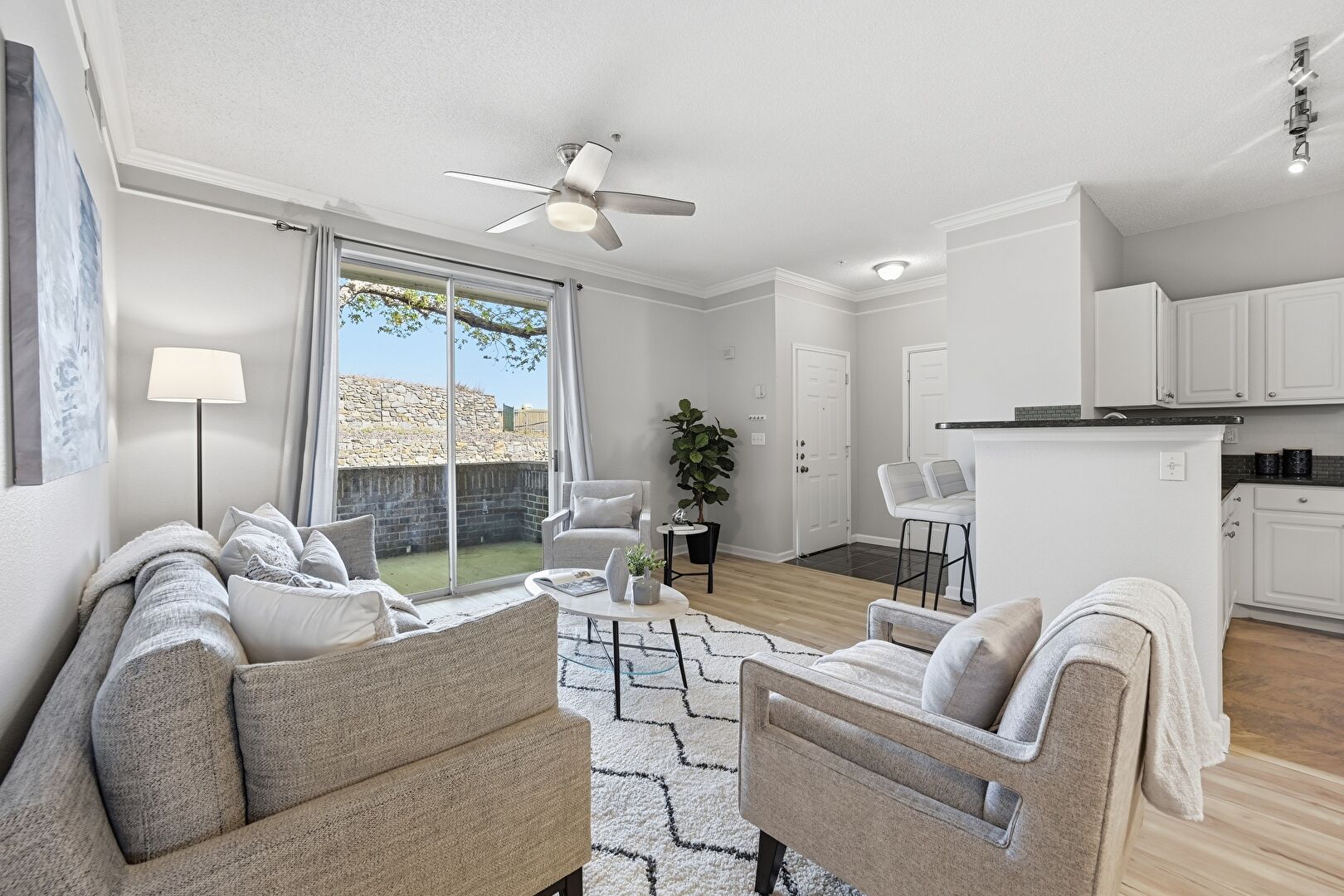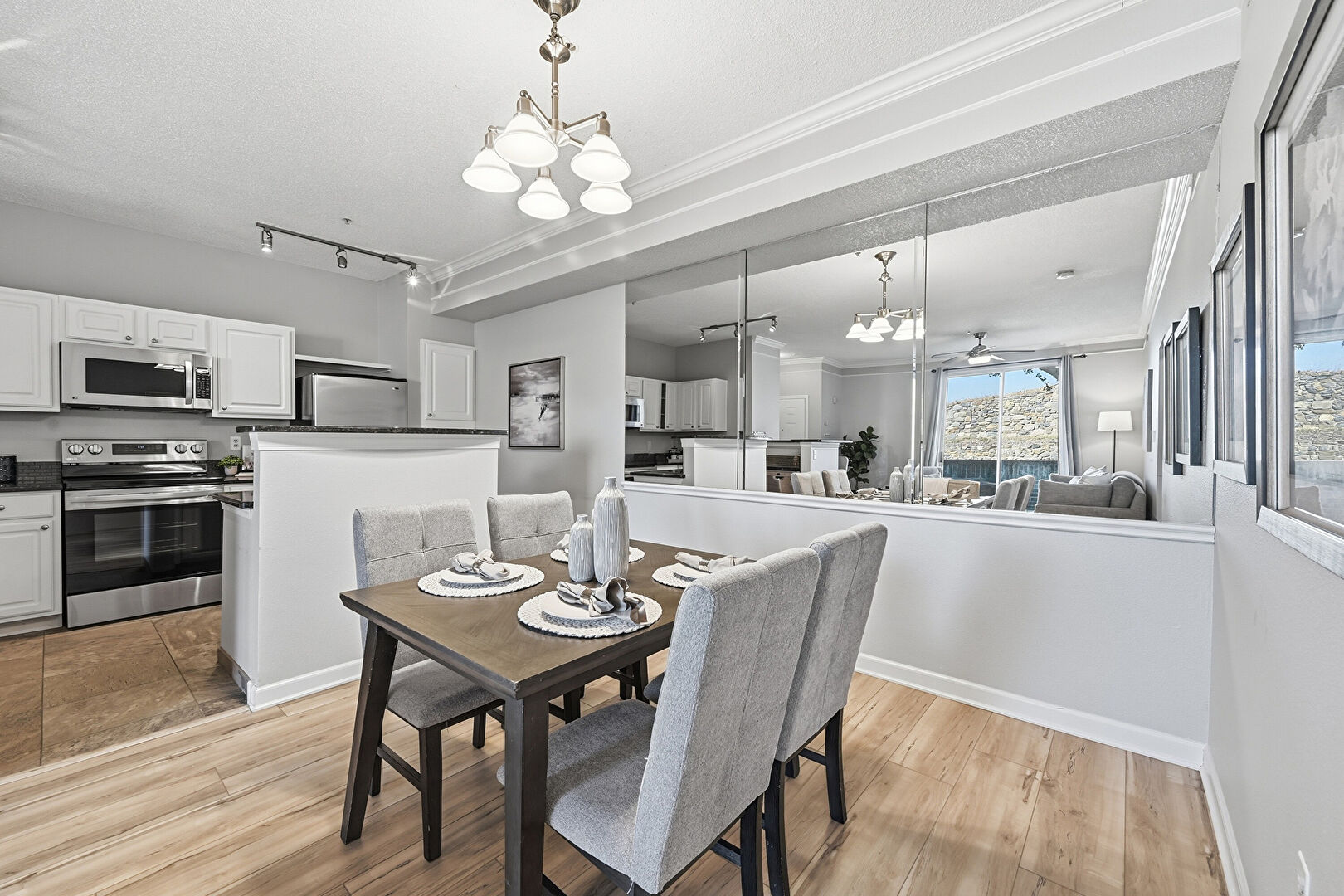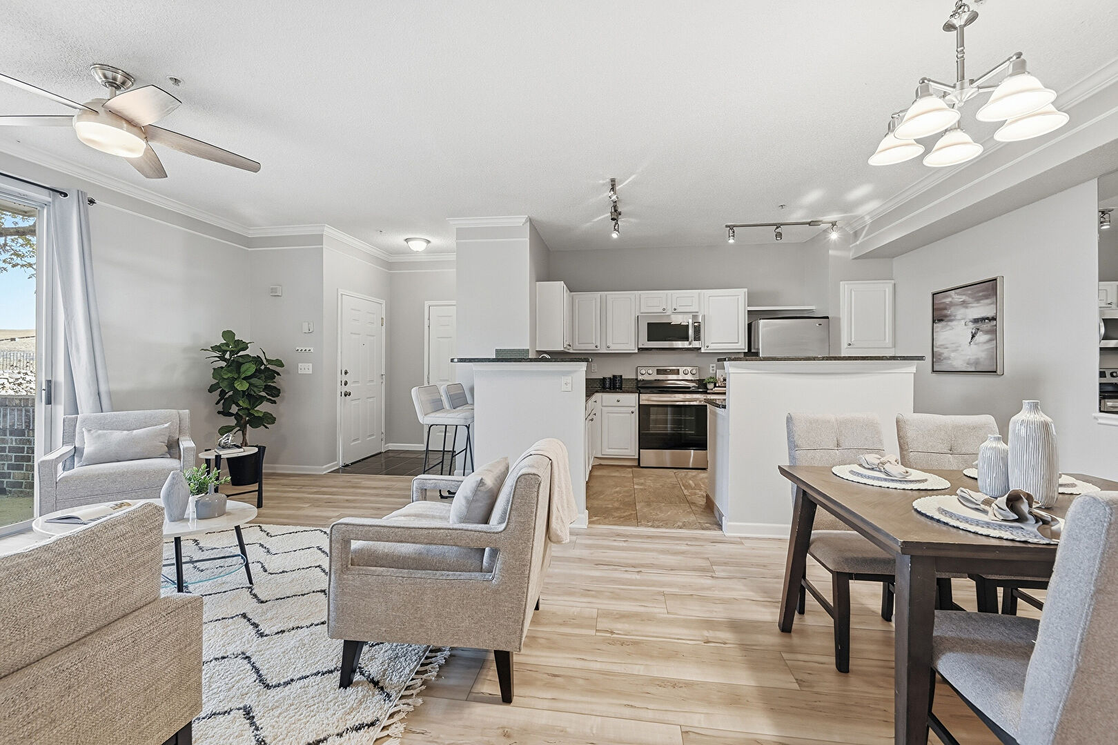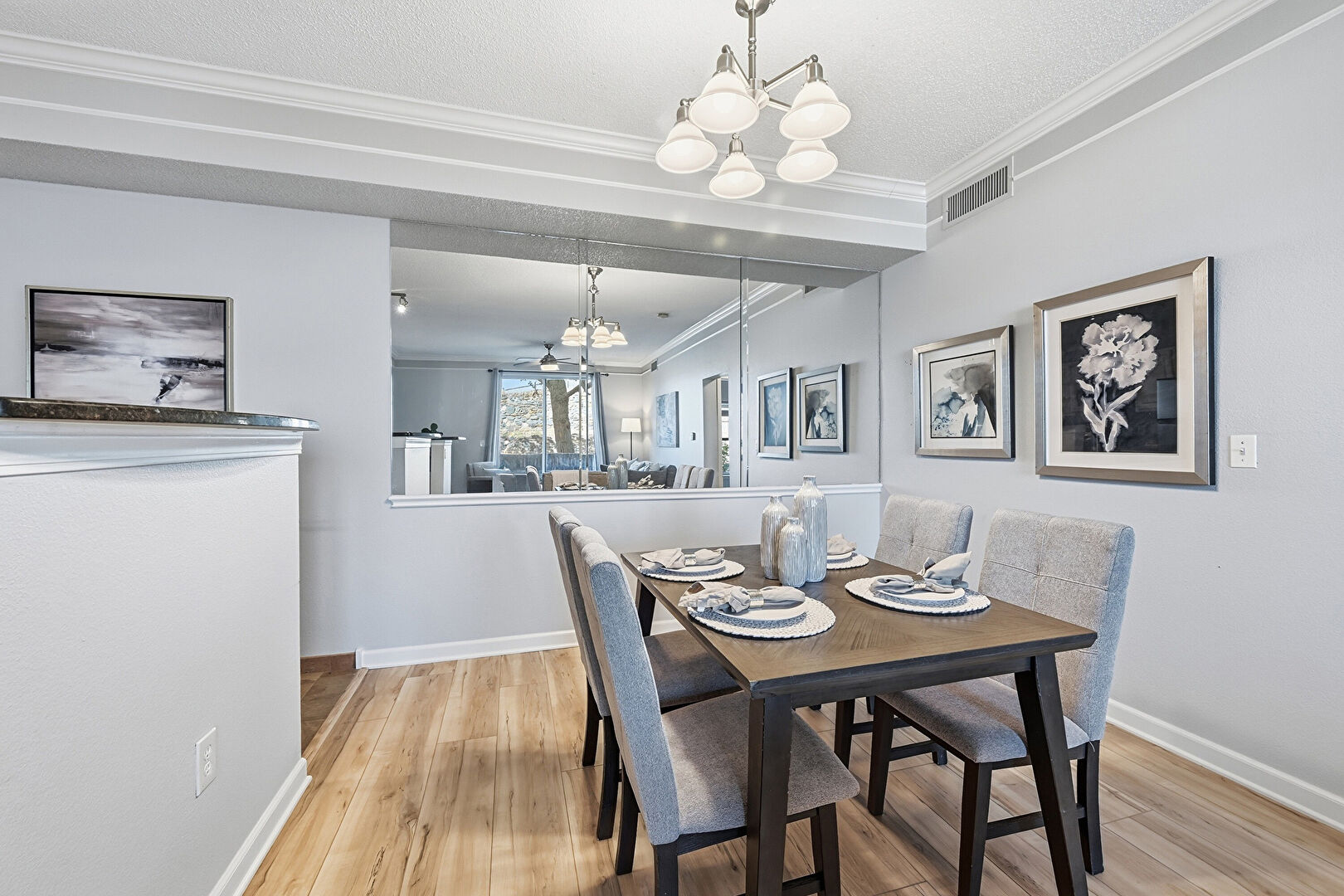 Baseboards Wall, Ceiling Fan, Crown Molding, Drywall, L Shaped Kitchen, Natural Light, Notable Chandelier, Textured Ceiling, Track Lighting, Vent, Wood Finish Floor, Baseboards Wall, Textured Ceiling, Wood Finish Floor