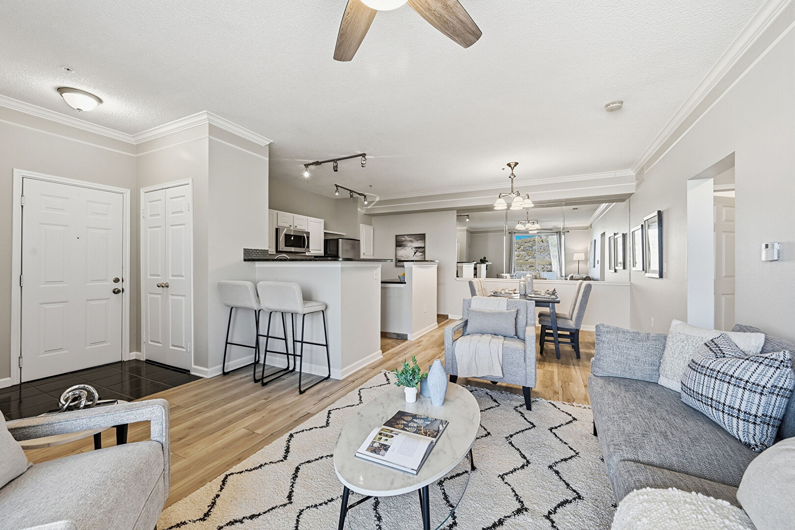 Baseboards Wall, Ceiling Fan, Crown Molding, Drywall, Natural Light, Notable Chandelier, Textured Ceiling, Track Lighting, Vent, Wood Finish Floor, Baseboards Wall, Drywall, Wood Finish Floor