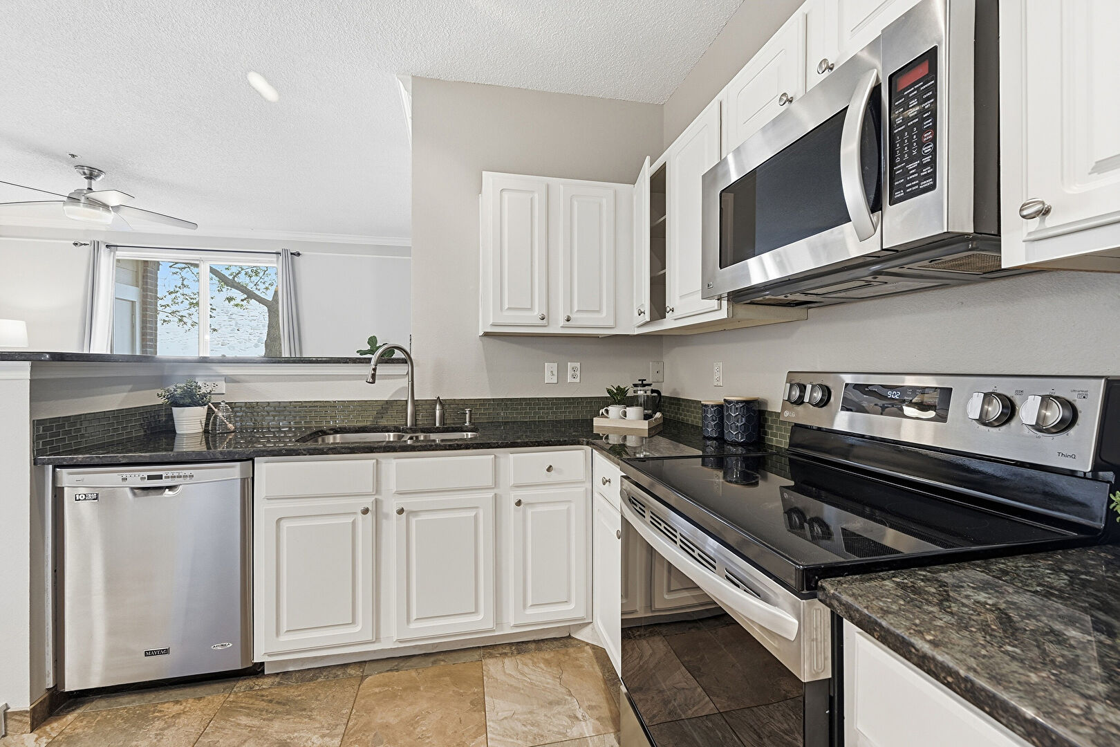 Apartment Complex View, Balcony, Brick Siding, Built In Garage, Concrete Foundation, Downspout, Driveway, Gutters, Horizontal Siding, Brick Siding, Downspout