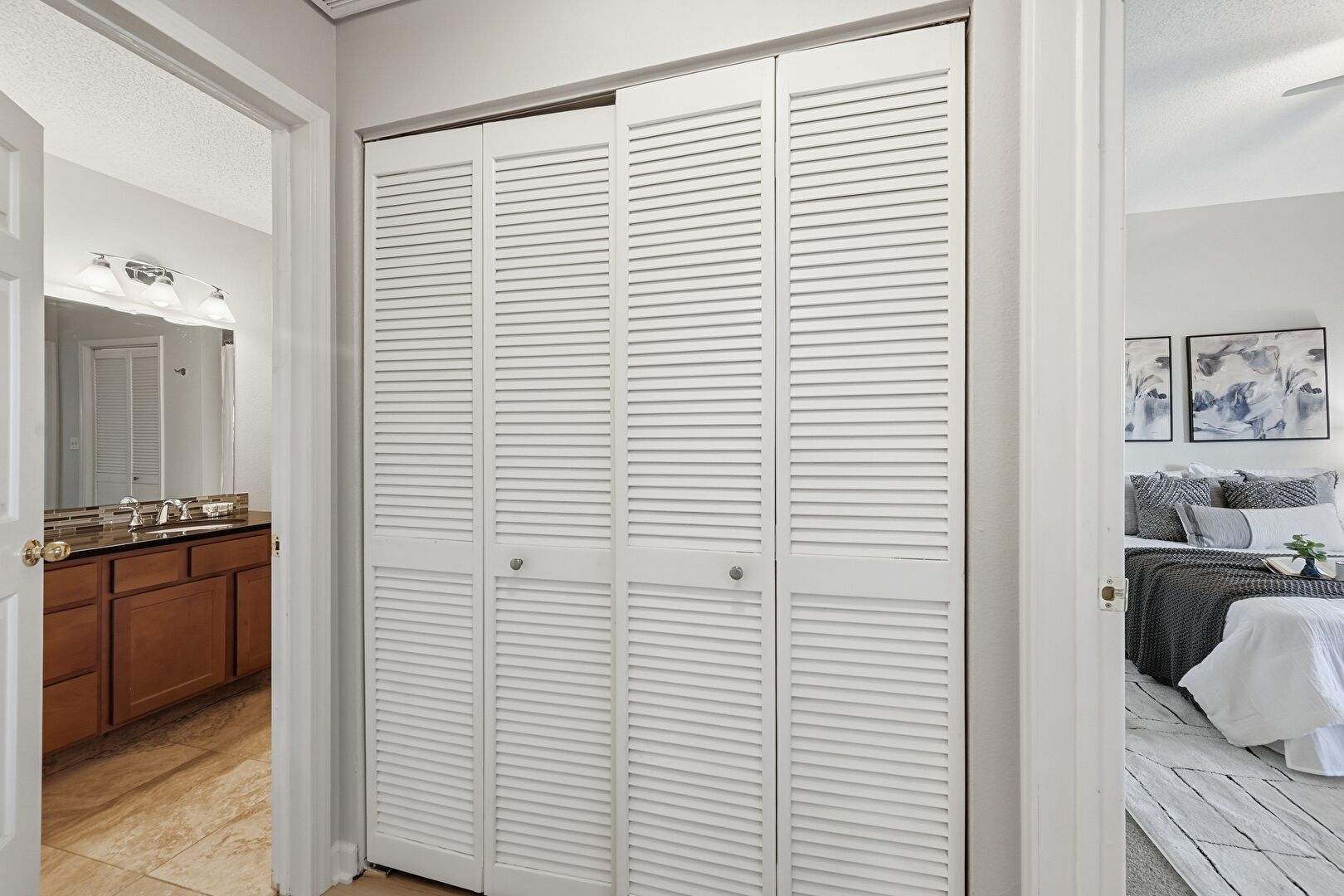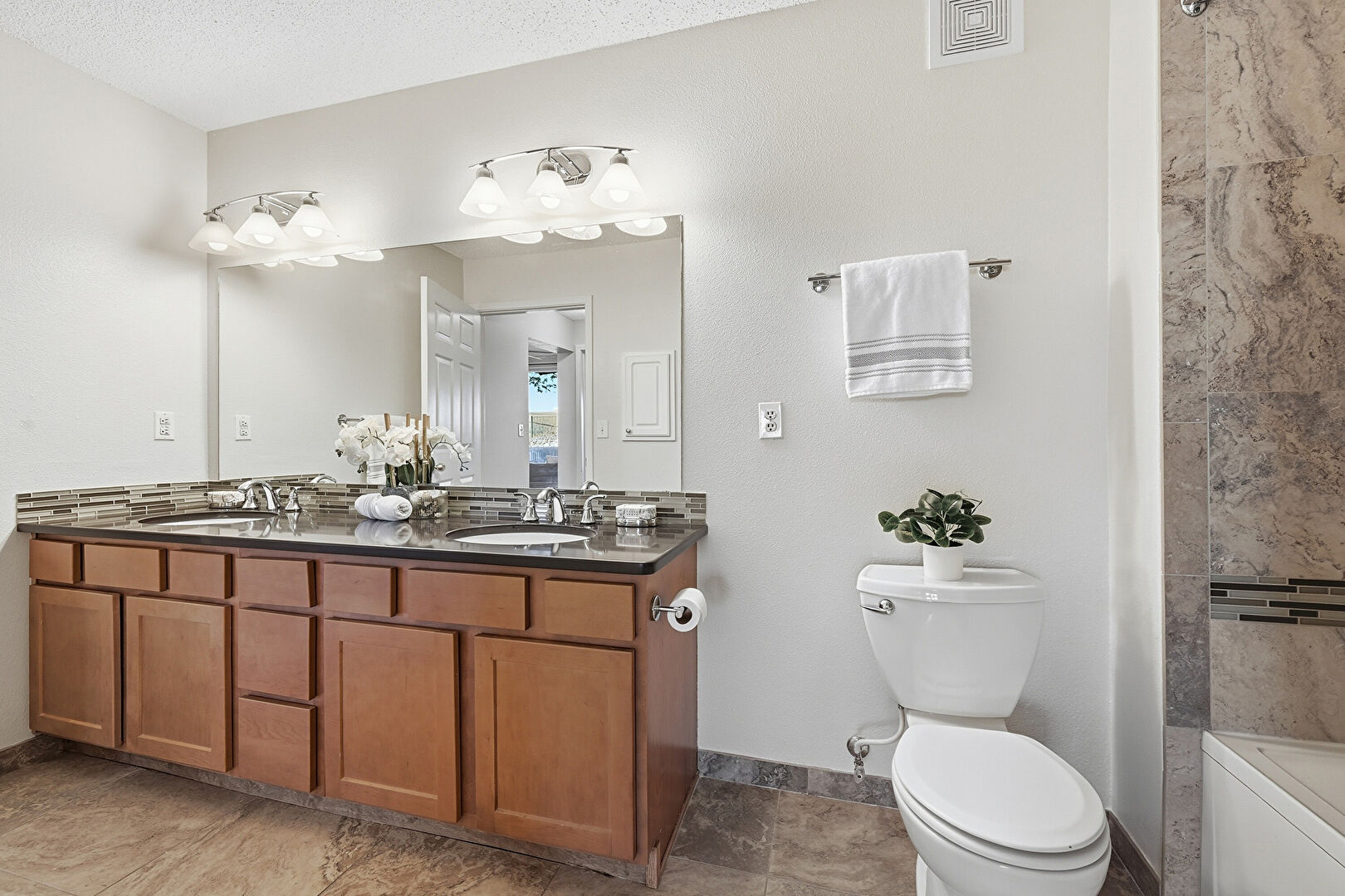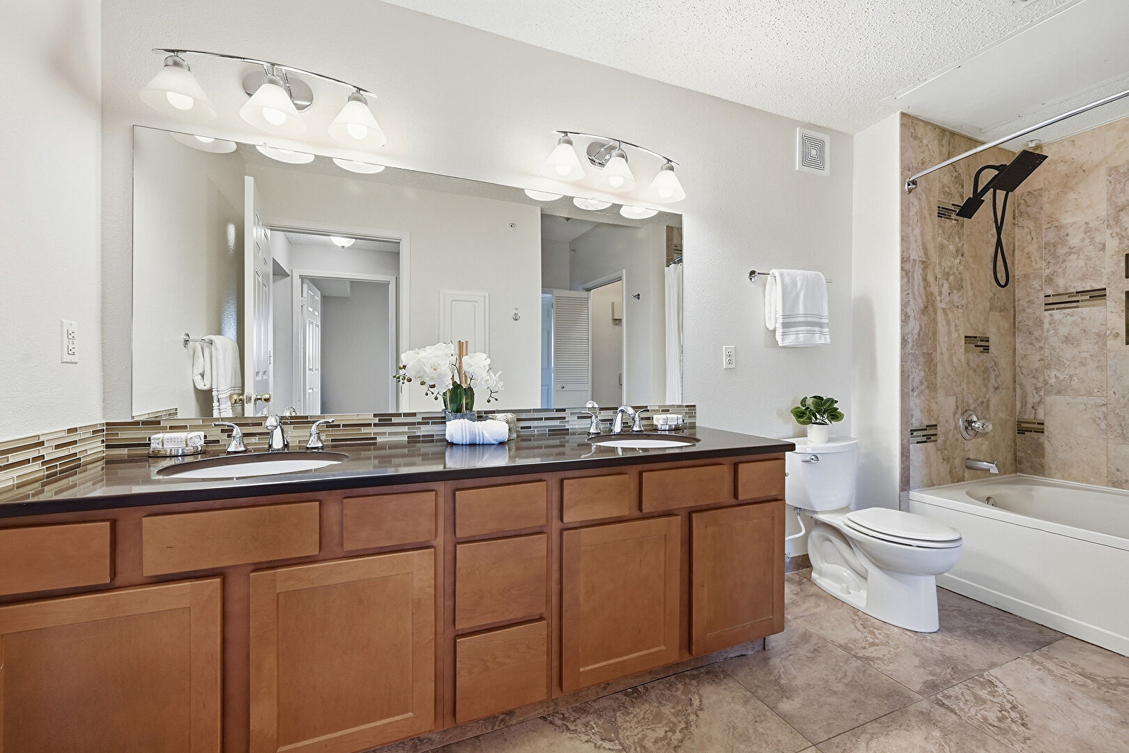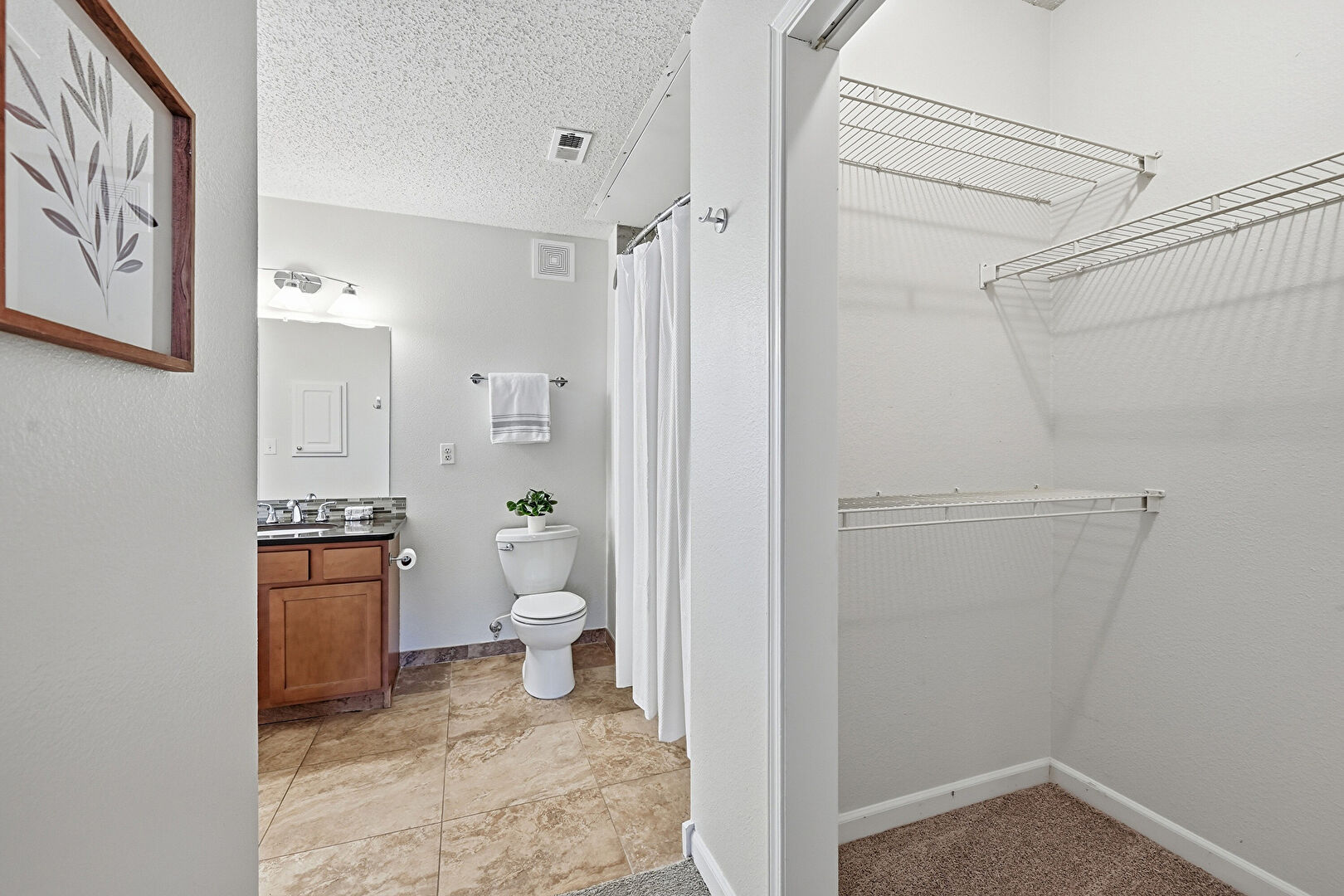 Baseboards Wall, Carpet, Combined Bath Shower, Double Vanity, Drywall, Full Bathroom, Natural Light, Textured Ceiling, Vanity, Vent, Baseboards Wall, Combined Bath Shower, Walk In Closet