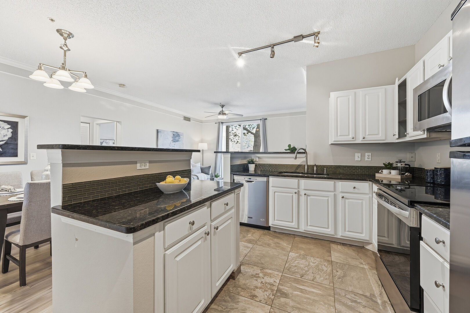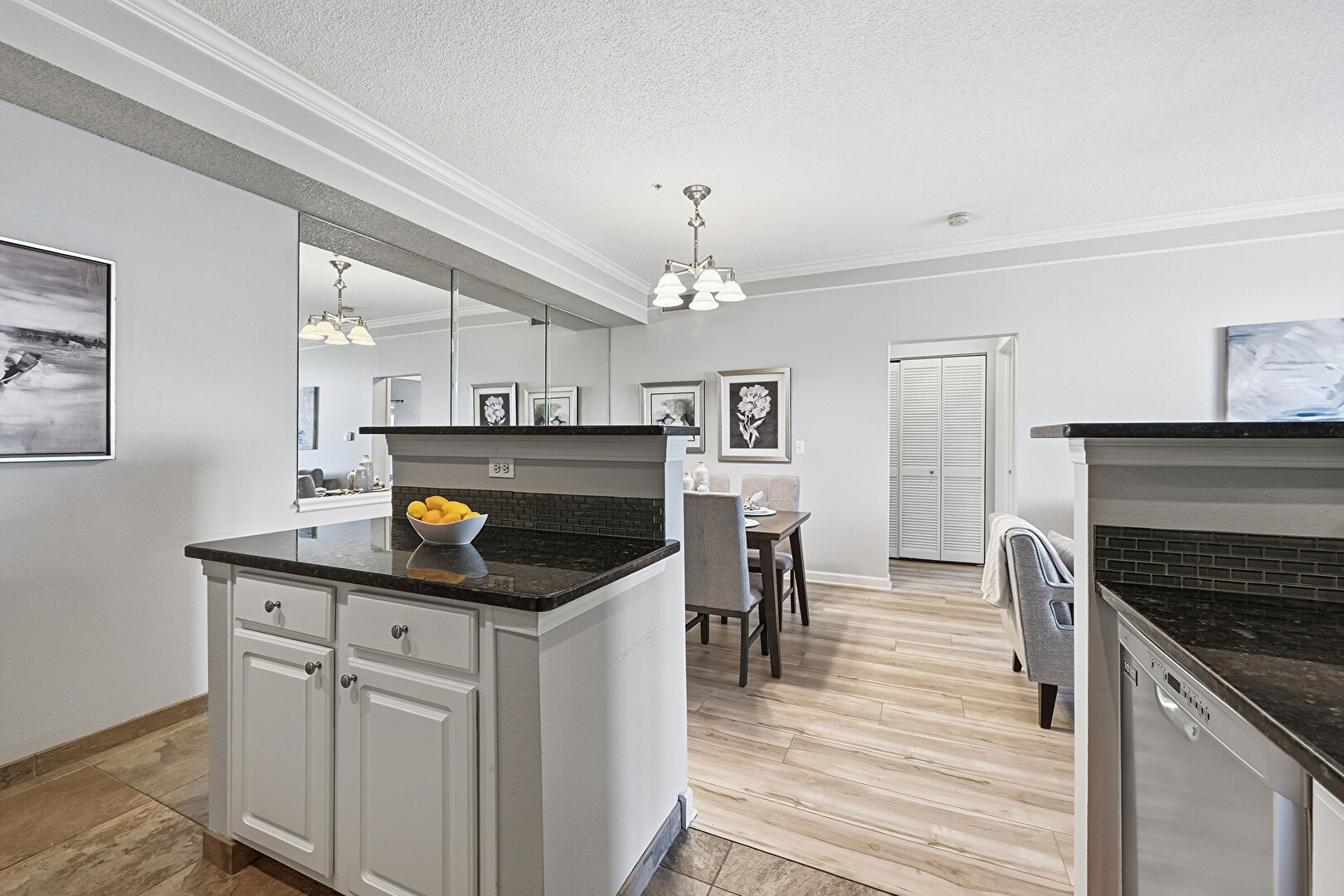 Baseboards Wall, Ceiling Fan, Crown Molding, Drywall, Glass Insert Cabinets, Kitchen Island, Kitchen Peninsula, Natural Light, Notable Chandelier, Opens To Living Area, Pendant Lighting, Raised Cabinets, Stone Countertops, Textured Ceiling, Track Lighting, Wood Finish Floor, Pendant Lighting, Raised Cabinets, Stone Countertops